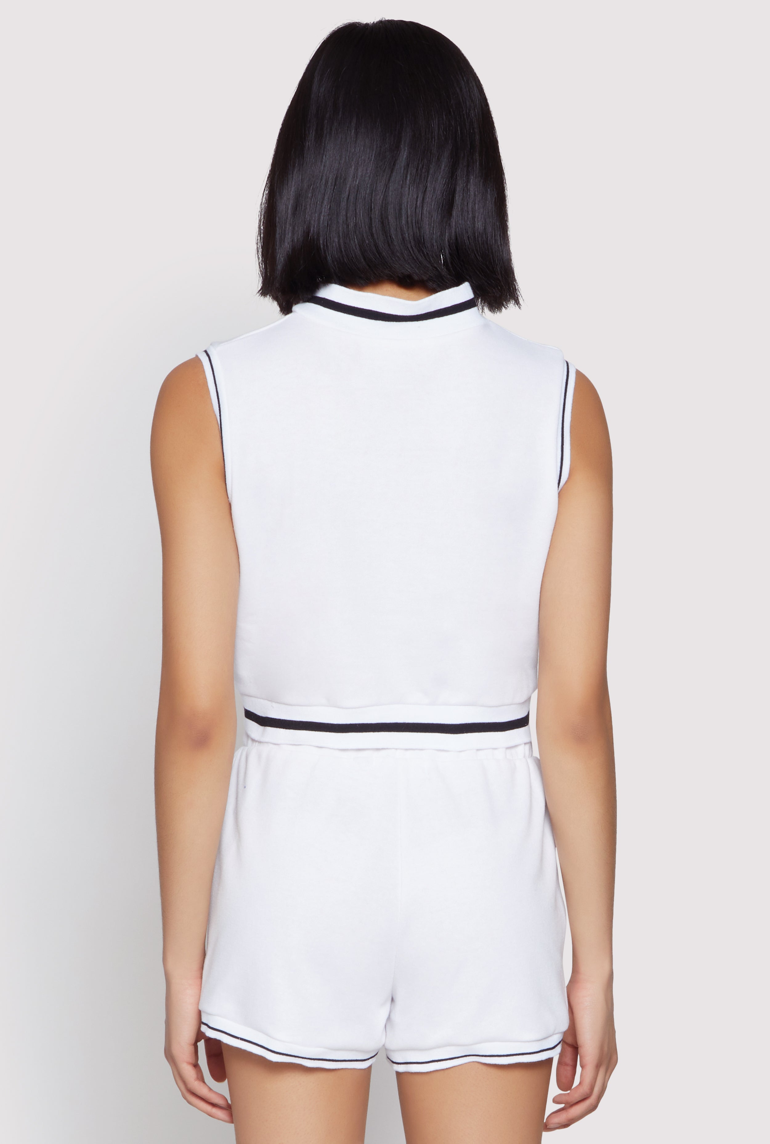 Upgrade your athleisure game with the Striped Trim Sleeveless Half Zip Top. Perfectly blending sporty chic with a timeless silhouette, this top is your new go-to for active days or casual hangouts. The varsity stripe detail adds a fun pop of color, while the cropped hem and mock neck keep your look fresh and on-trend. Made from comfy French Terry, it’s designed to move with you and keep you feeling cool and confident all day long.