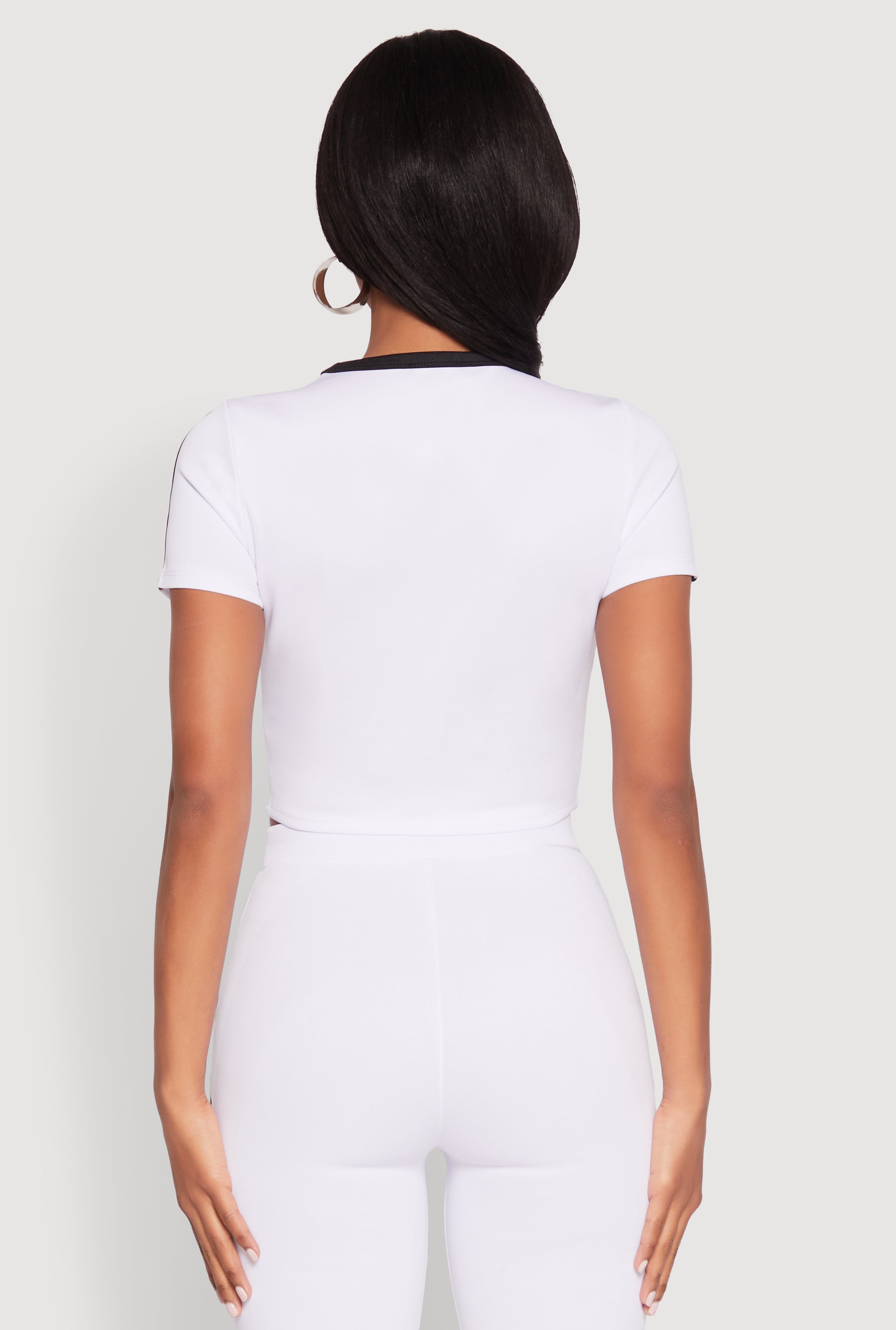 Step up your casual game with the Varsity Stripe Crop Top, a perfect blend of sporty charm and everyday style. Featuring bold contrast trim and classic varsity stripes, this crop top adds a playful edge to any outfit. Its timeless crew neck and short sleeves make it a versatile choice for activewear or laid-back days. Whether you're hitting the gym or hanging out with friends, this top is your new go-to for effortless cool.