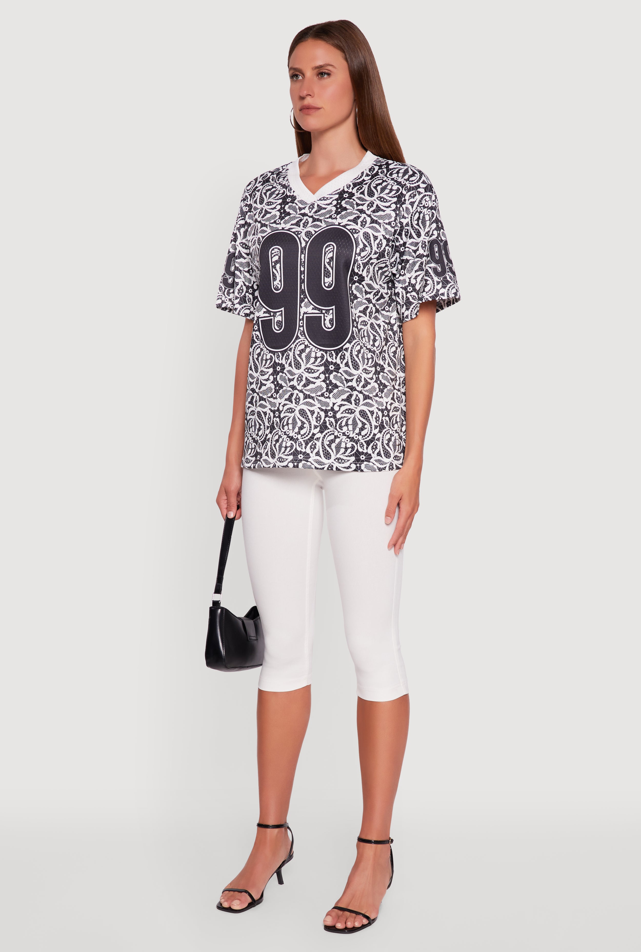 - Bold 99 graphic print adds sporty, street-style edge