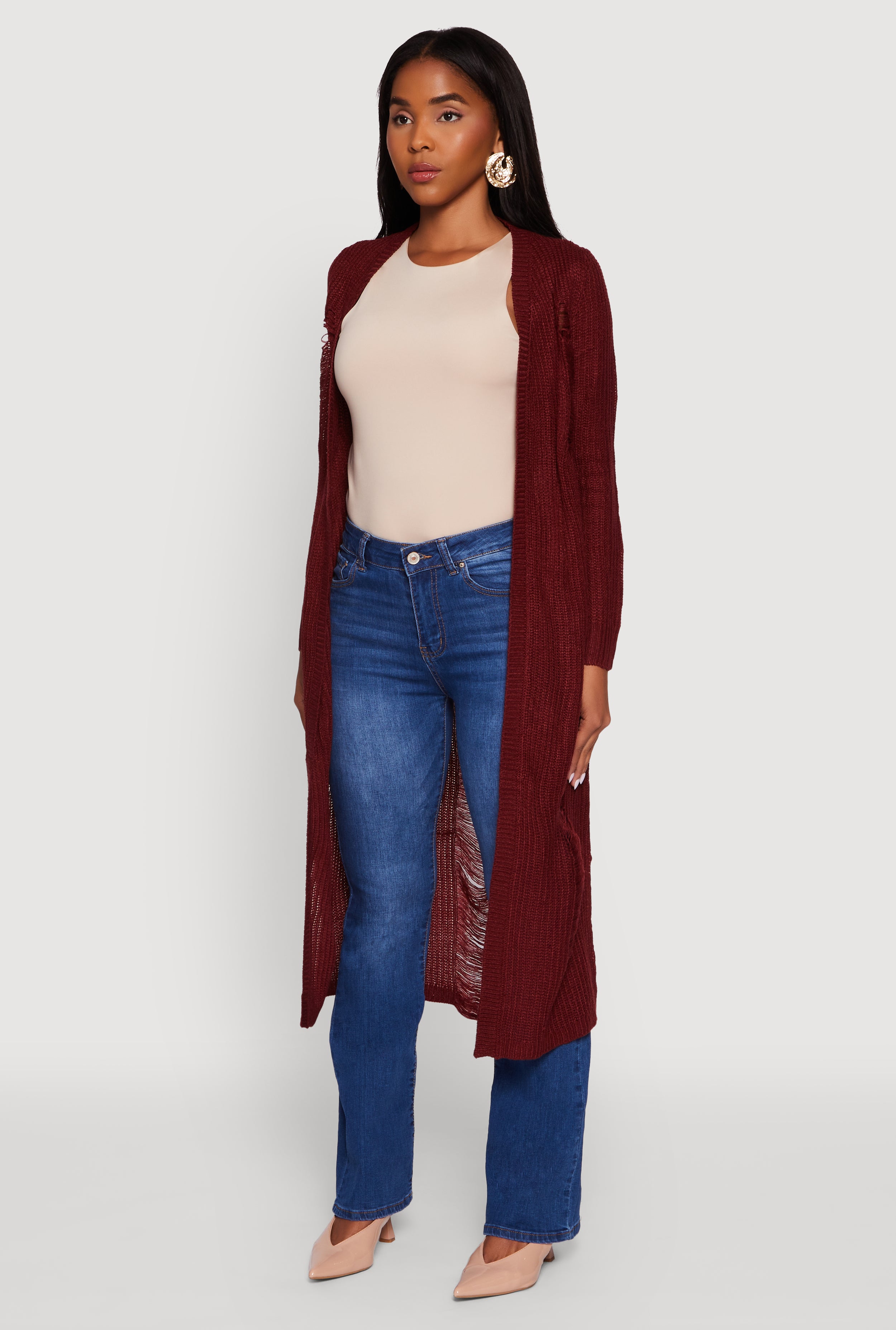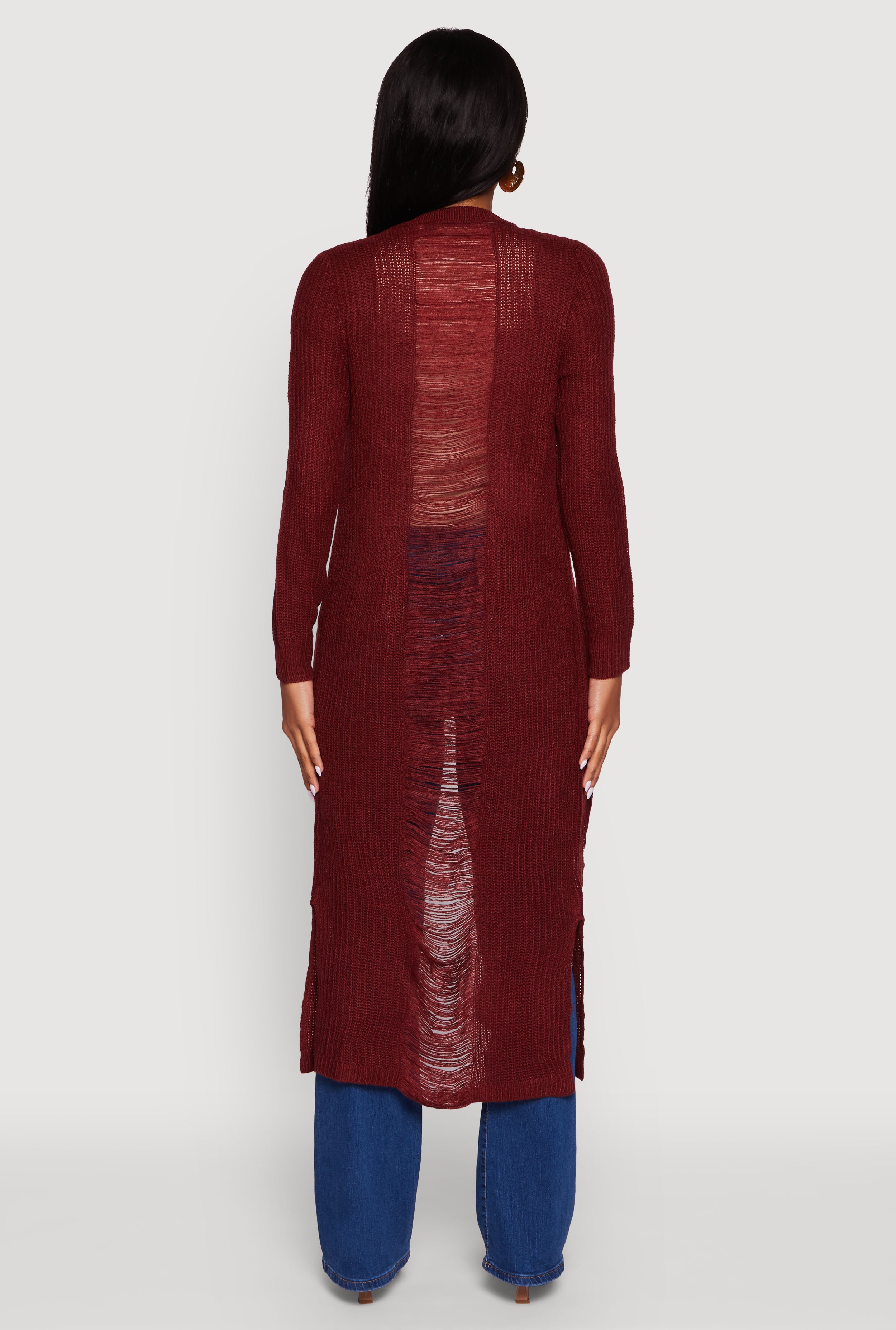 Step up your layering game with this Distressed Long Sleeve Open Front Duster Cardigan. Designed with a classic fit and a timeless silhouette, it effortlessly adds an edgy vibe to any casual outfit. The open front and collarless style make it easy to throw on and go, perfect for back-to-school days or chill weekends. Stay cozy without sacrificing style in this solid, distressed duster that’s as versatile as your mood.