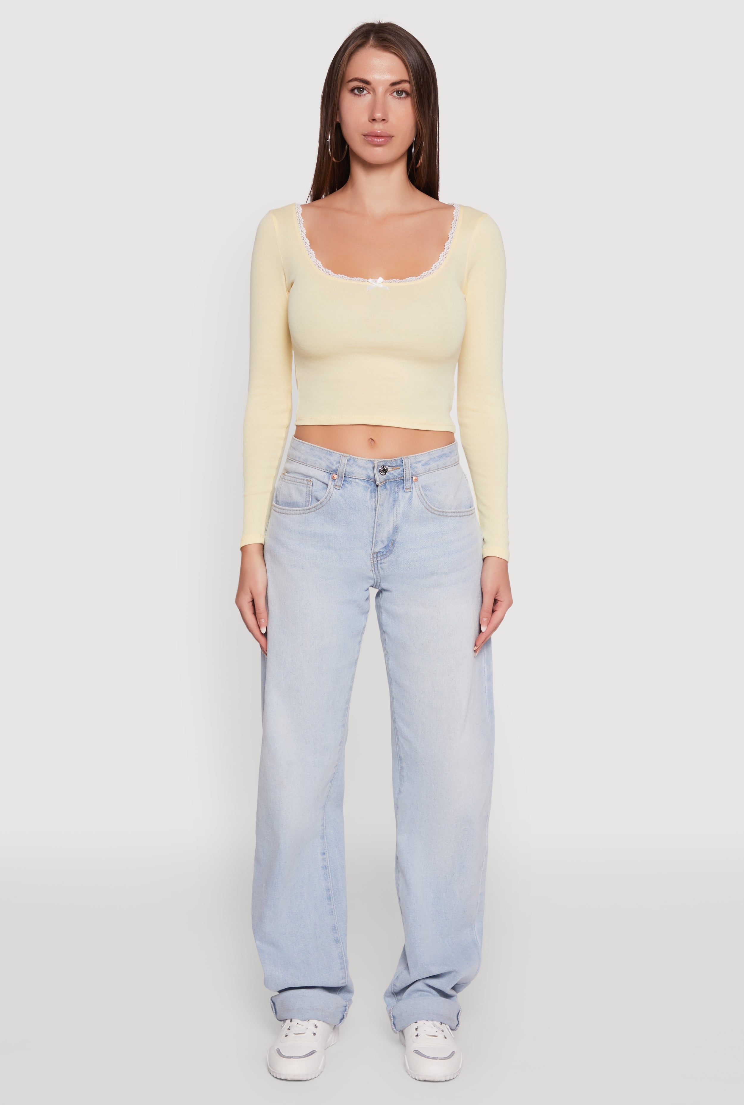 Elevate your everyday look with this Lace Detail Scoop Neck Long Sleeve Crop Top. Featuring a timeless classic fit and delicate lace accents, it’s the perfect mix of cozy and cute. Whether you’re pairing it with high-waisted jeans or your favorite skirt, this crop top adds a flirty touch with its charming bow embellishment. Ready to become your go-to for casual vibes that never go out of style? You’ve found it.