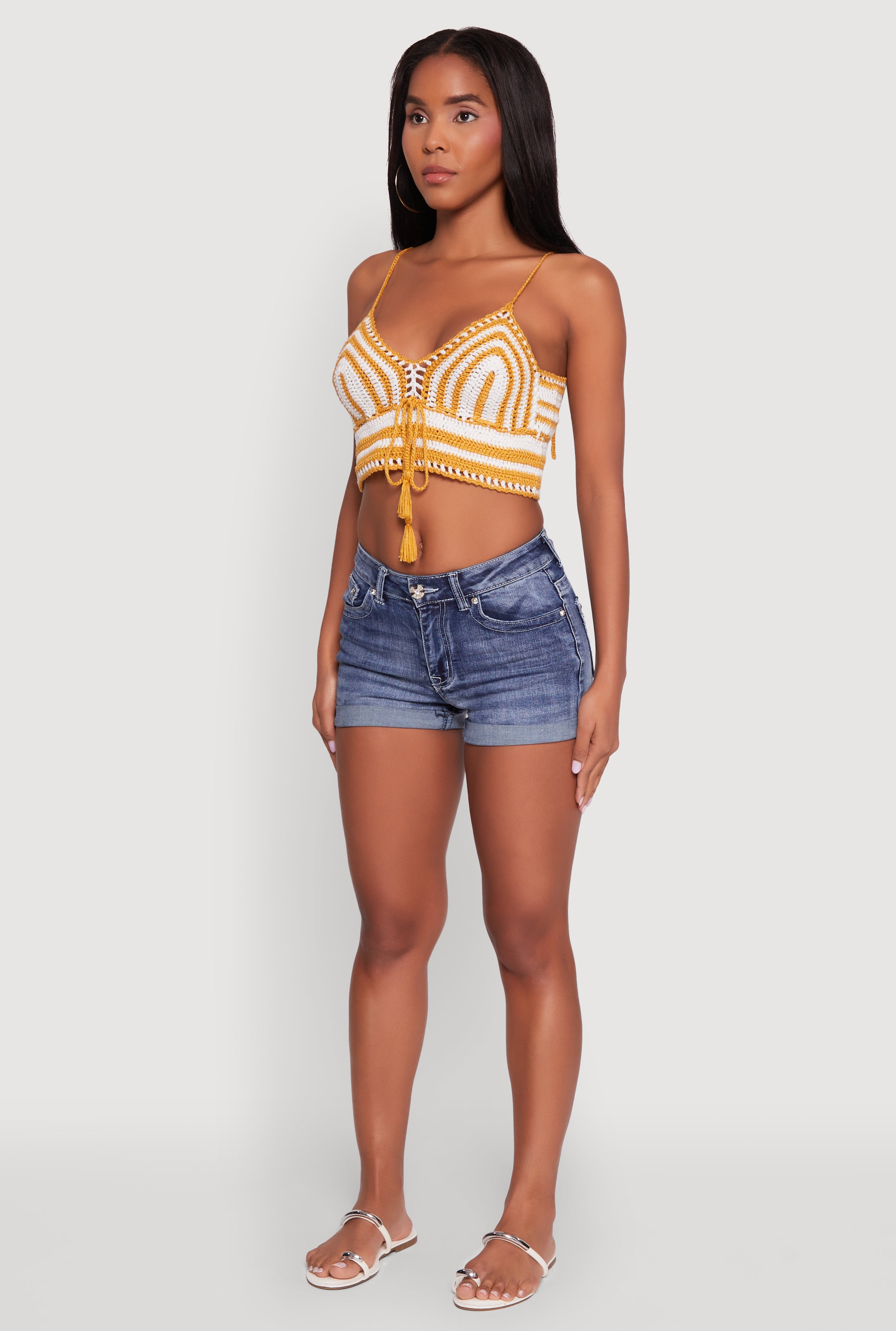Trendy Crochet Striped Sleeveless Crop Top with Tassel Tie Front