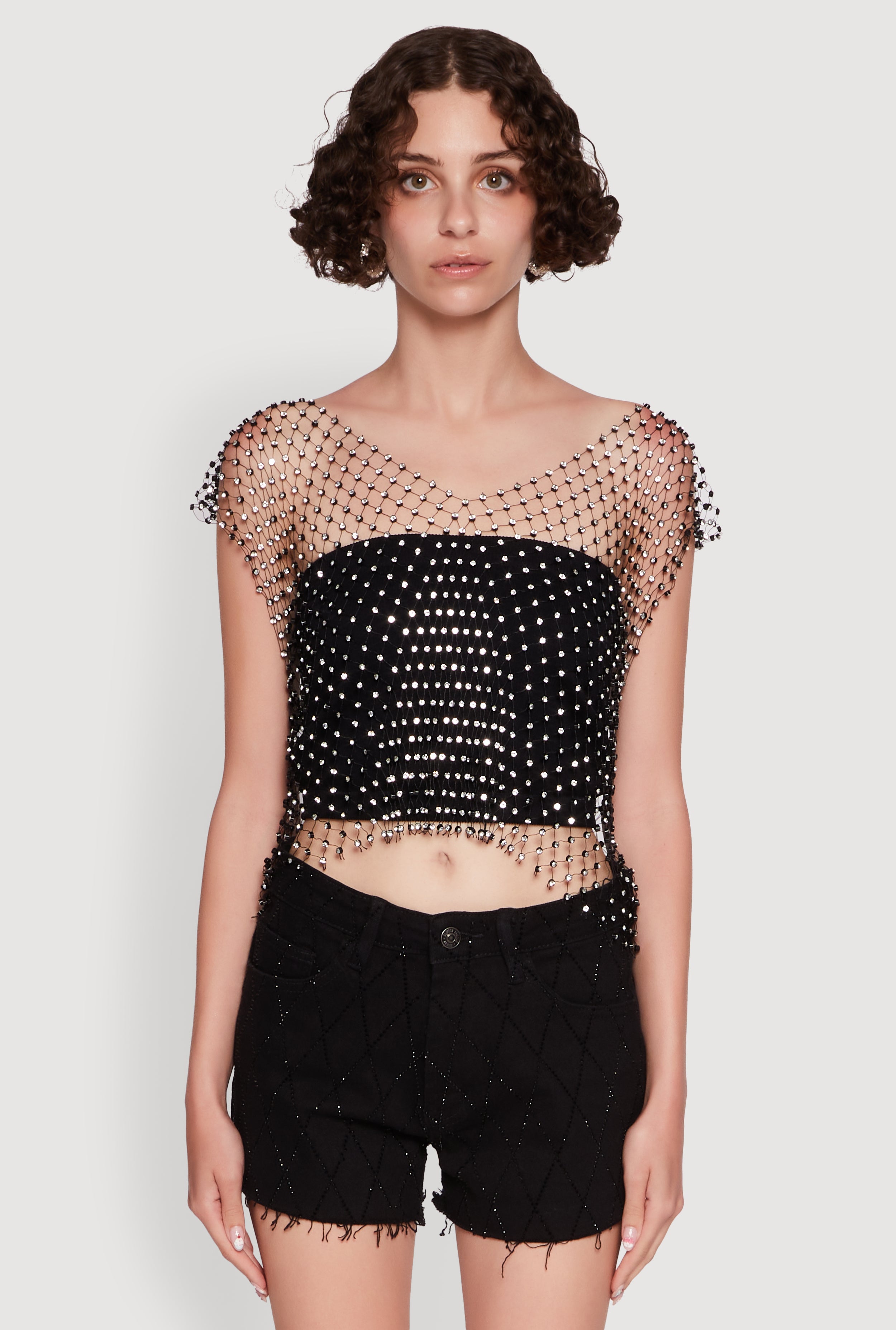 Trendy Rhinestone Fishnet V Neck Crop Top