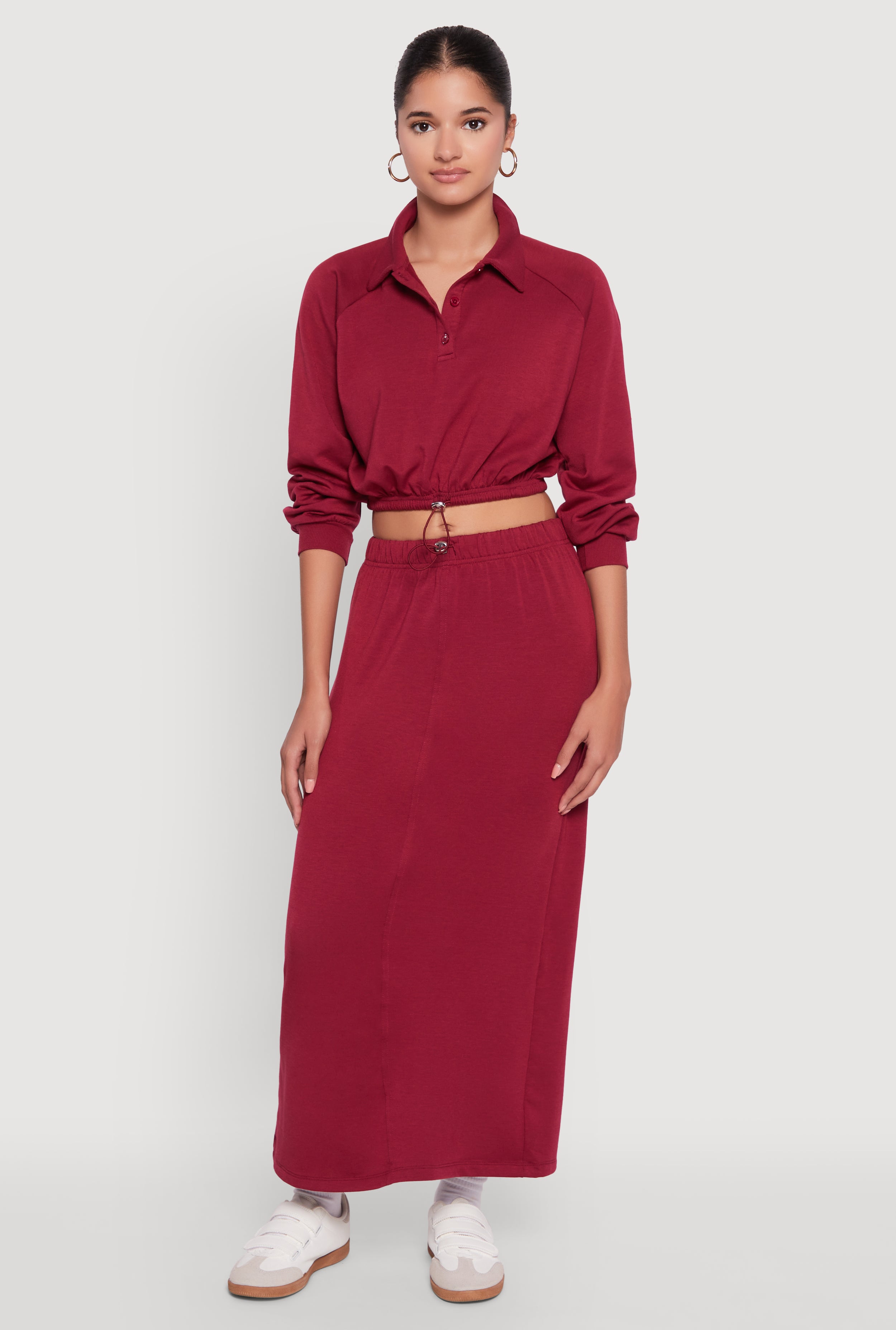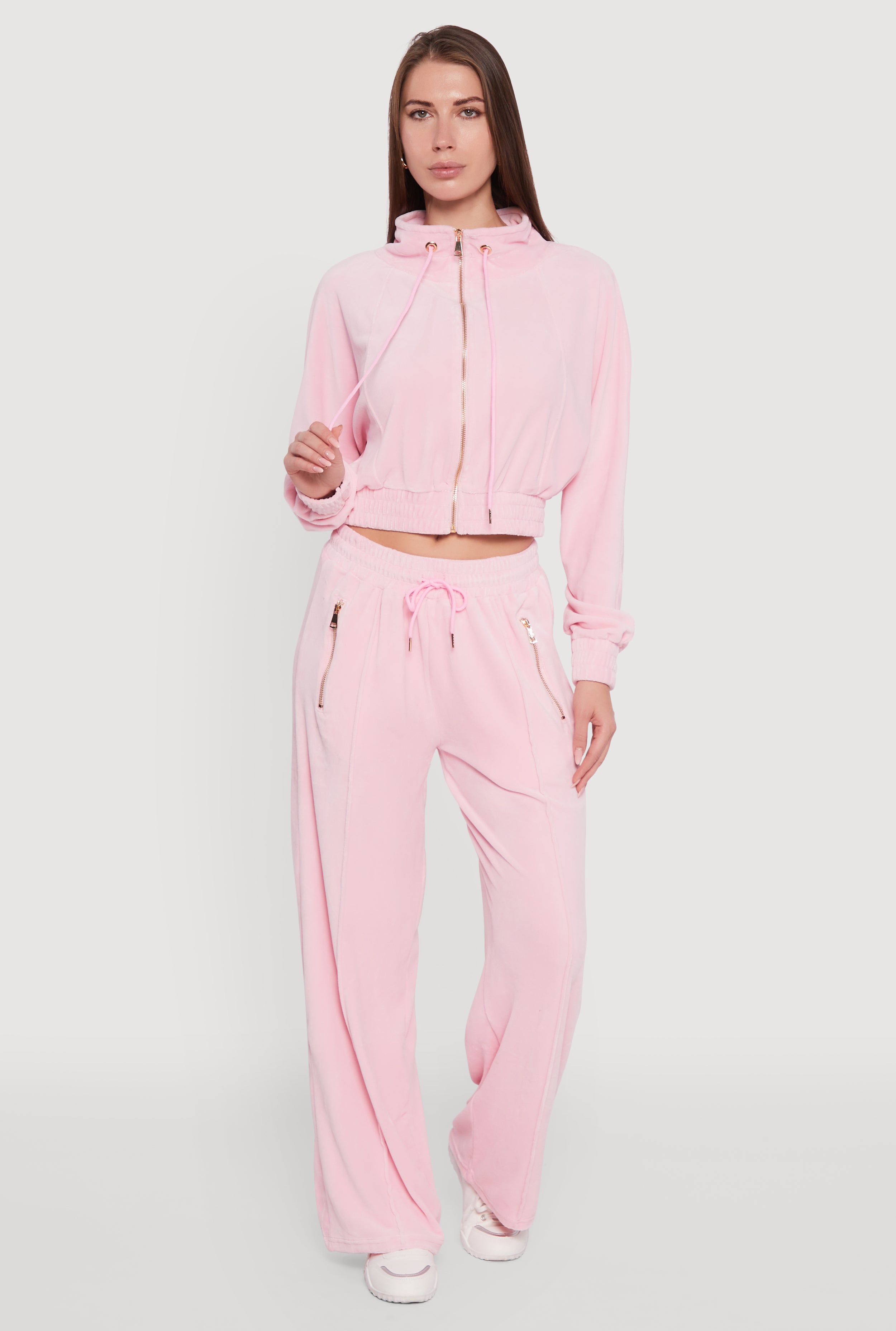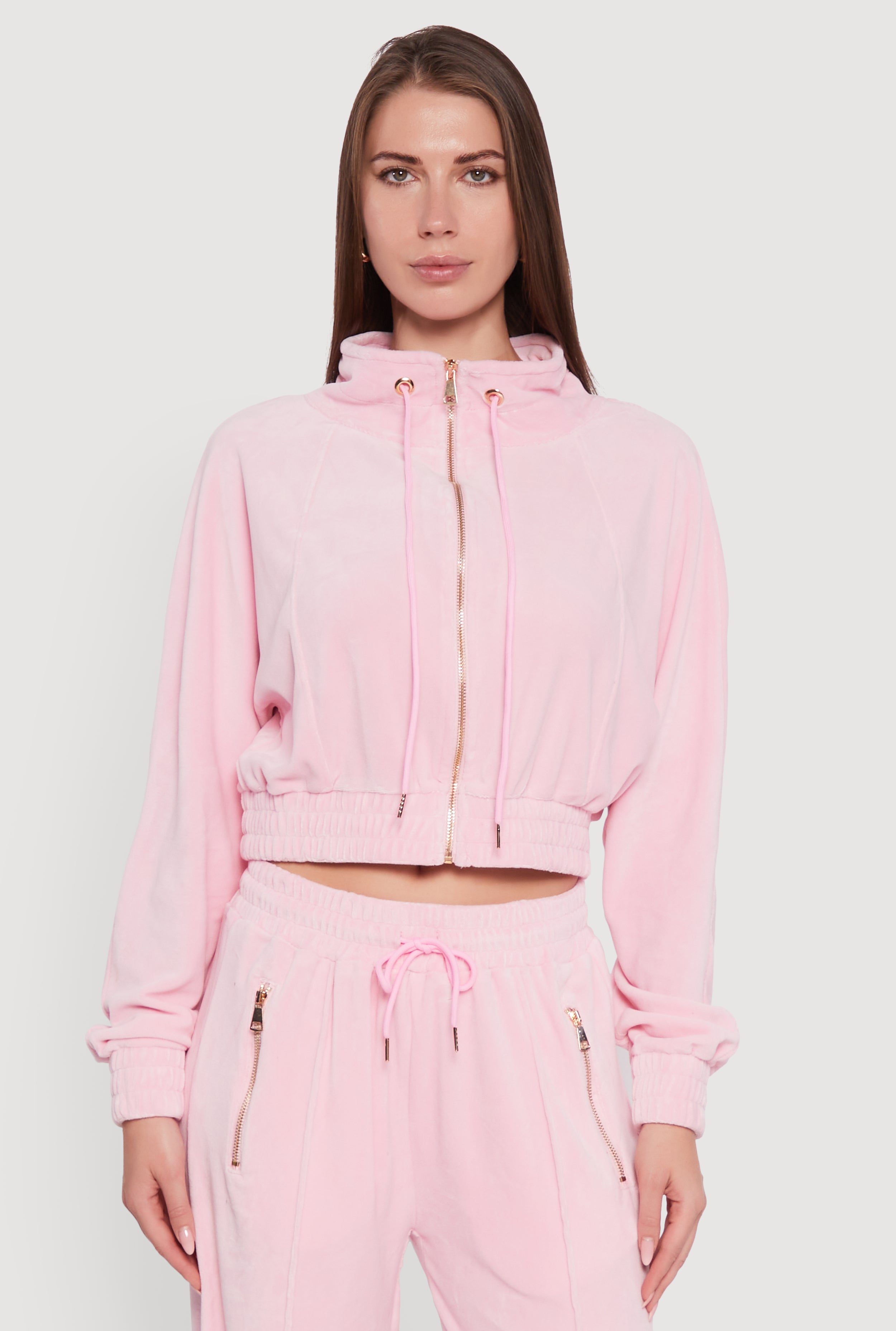 Velour Drawstring Mock Neck Cropped Zip Front Sweatshirt
