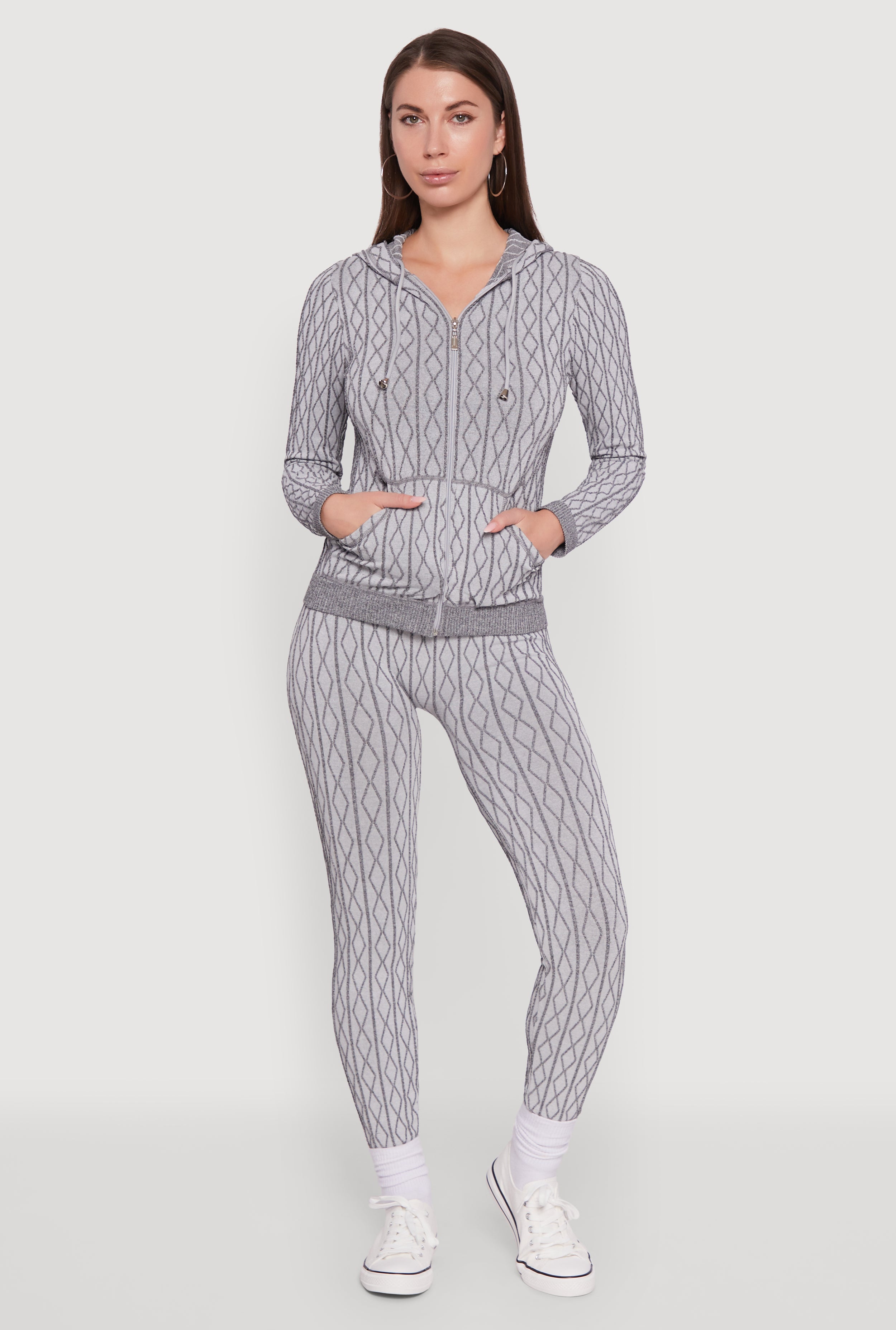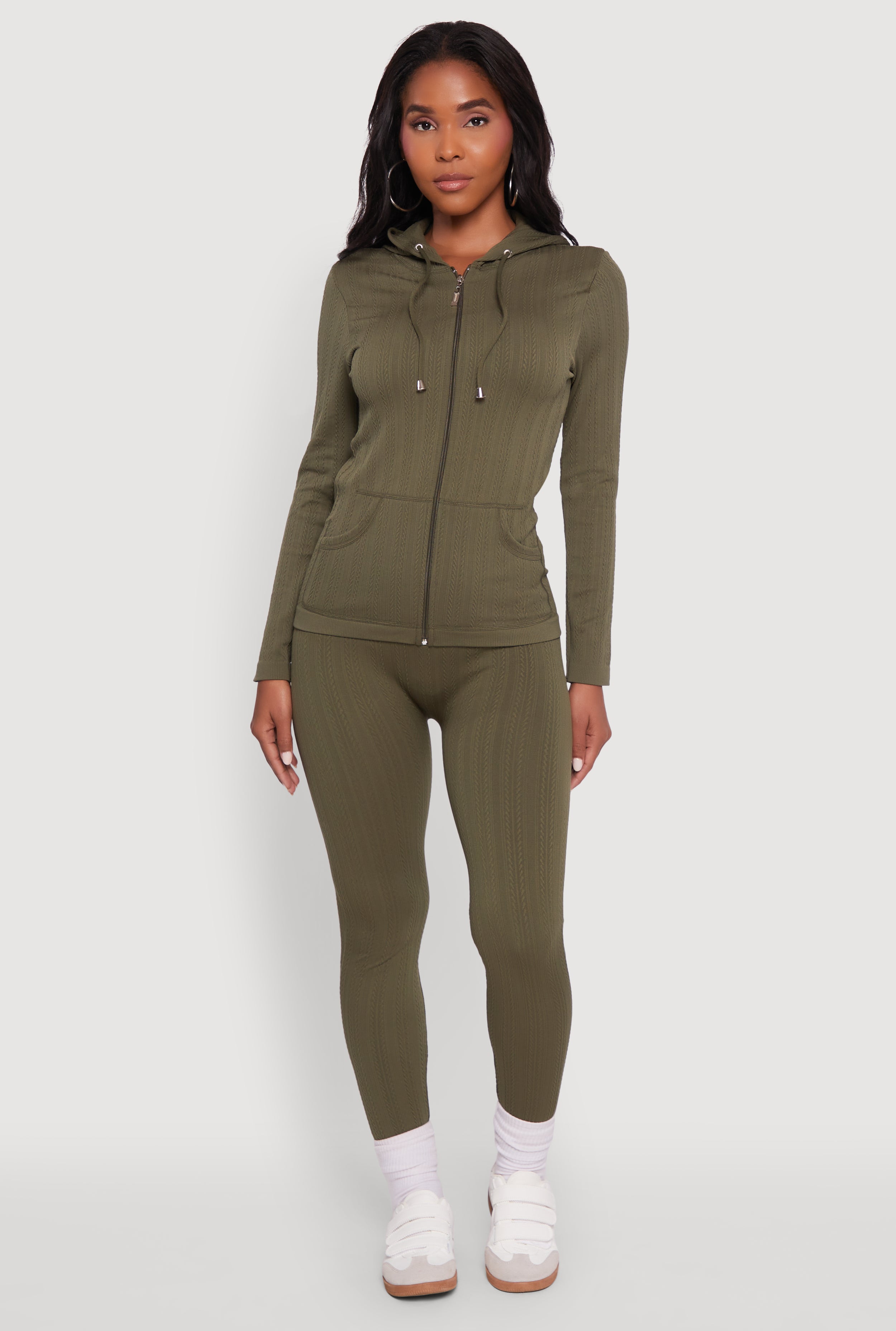 Textured Knit Zip Front Drawstring Hoodie
