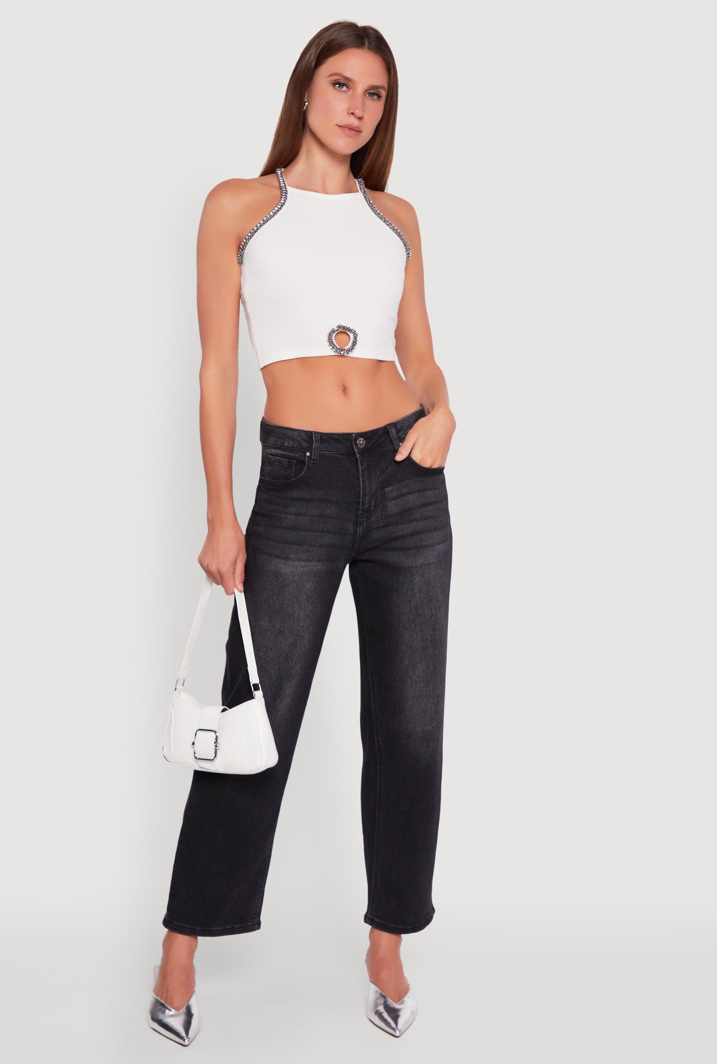 Rhinestone Studded Trim Detail Halter Crop Top