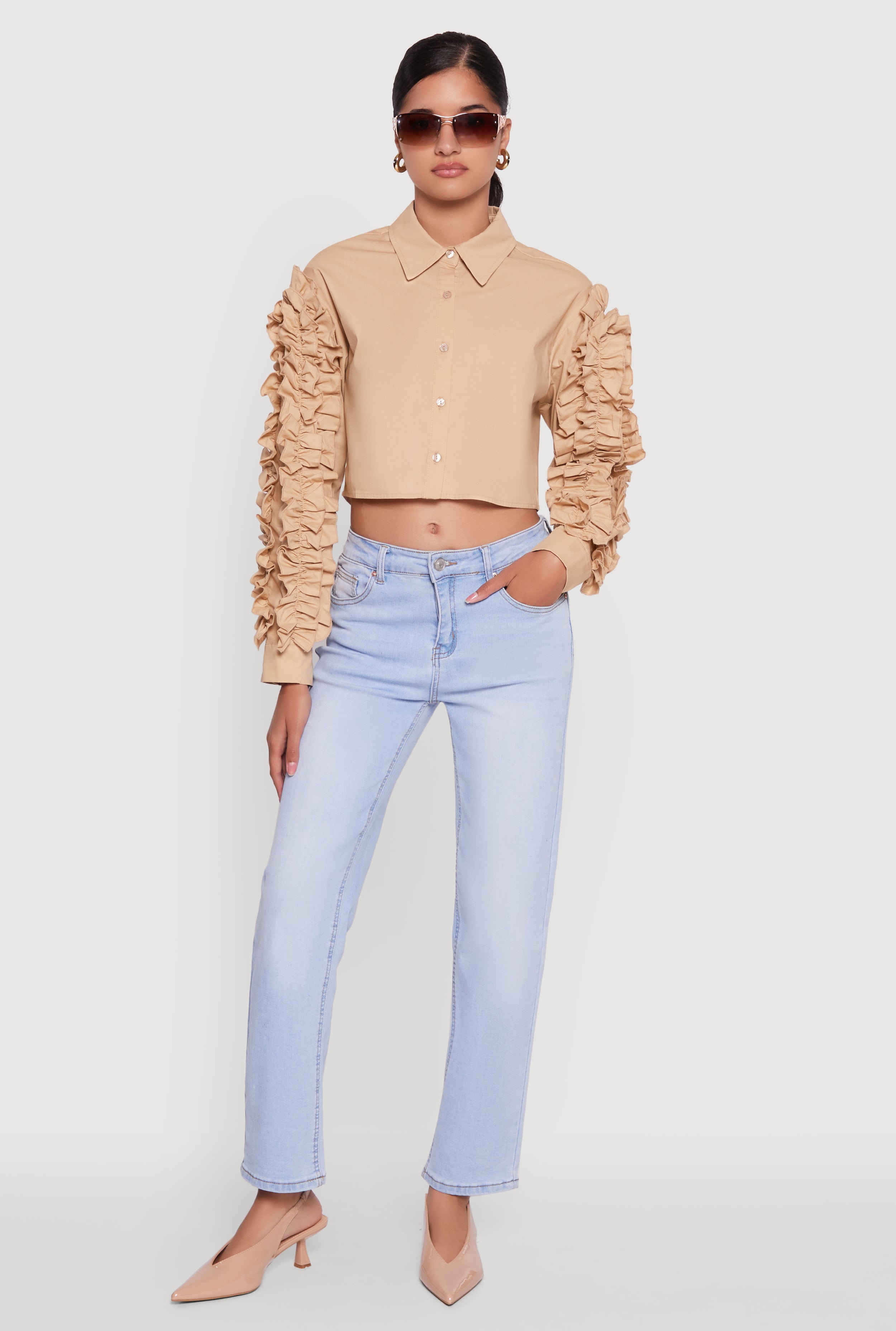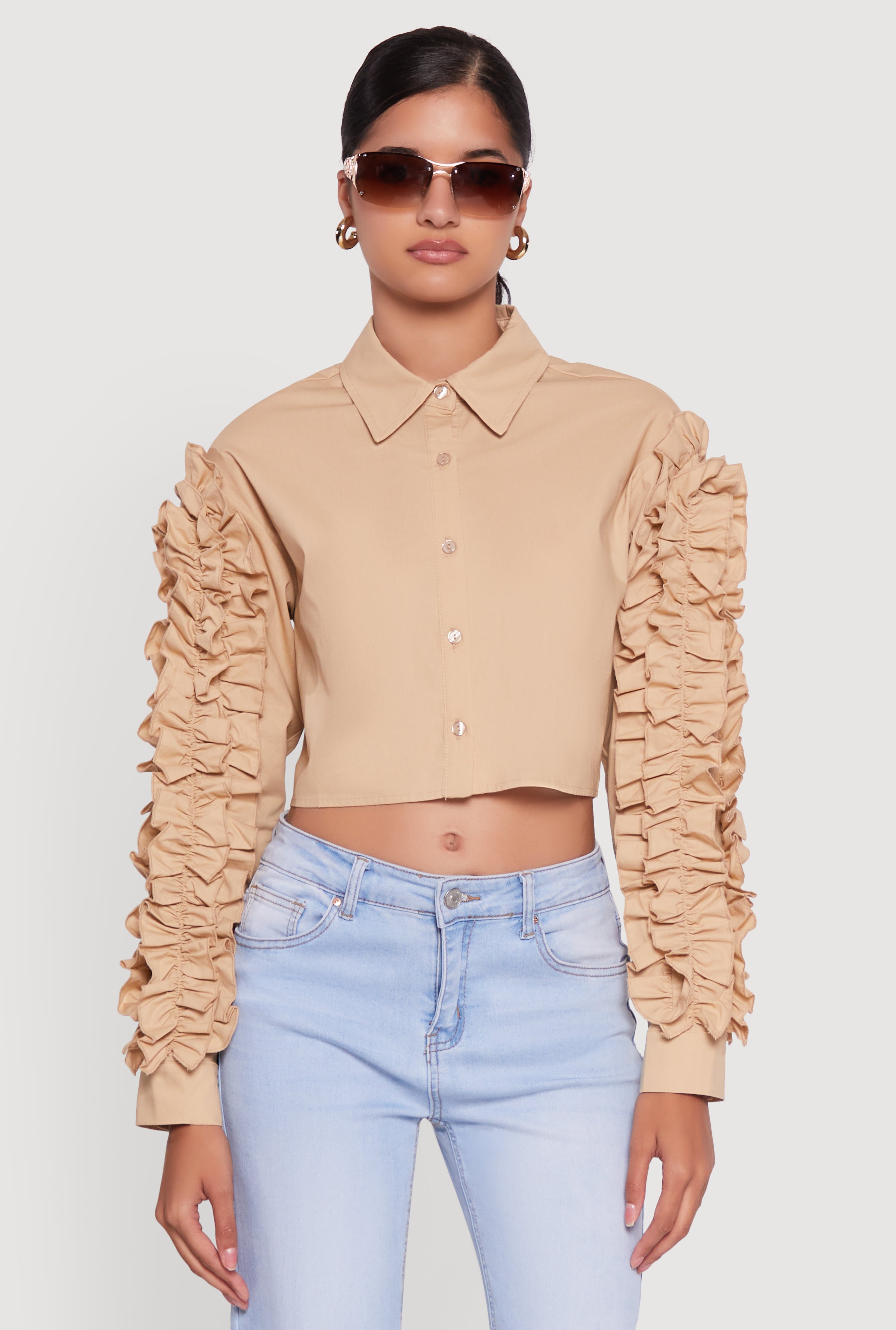 Ruffle Trim Sleeve Cropped Button Front Shirt