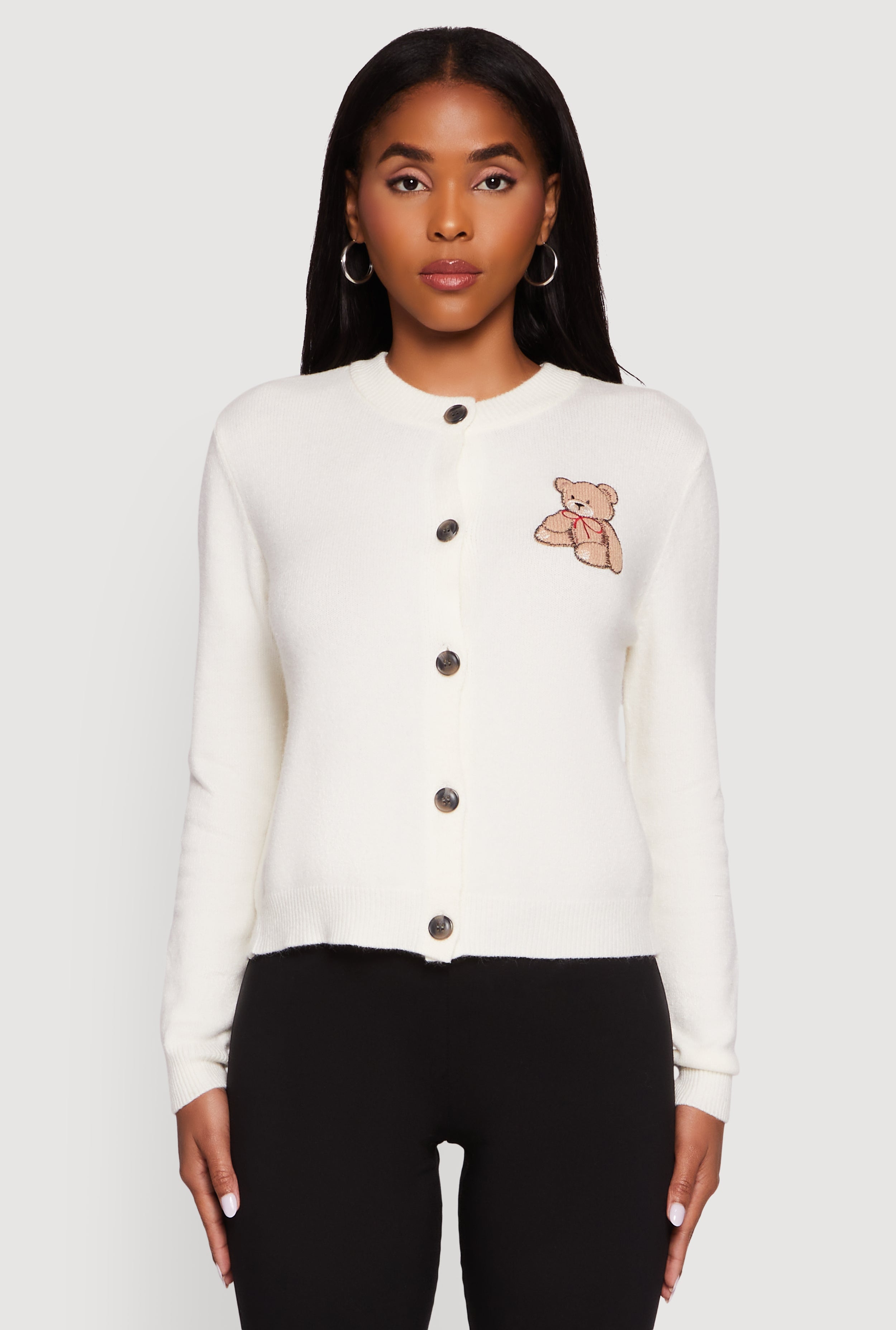 Embroidered Teddy Button Front Long Sleeve Cardigan