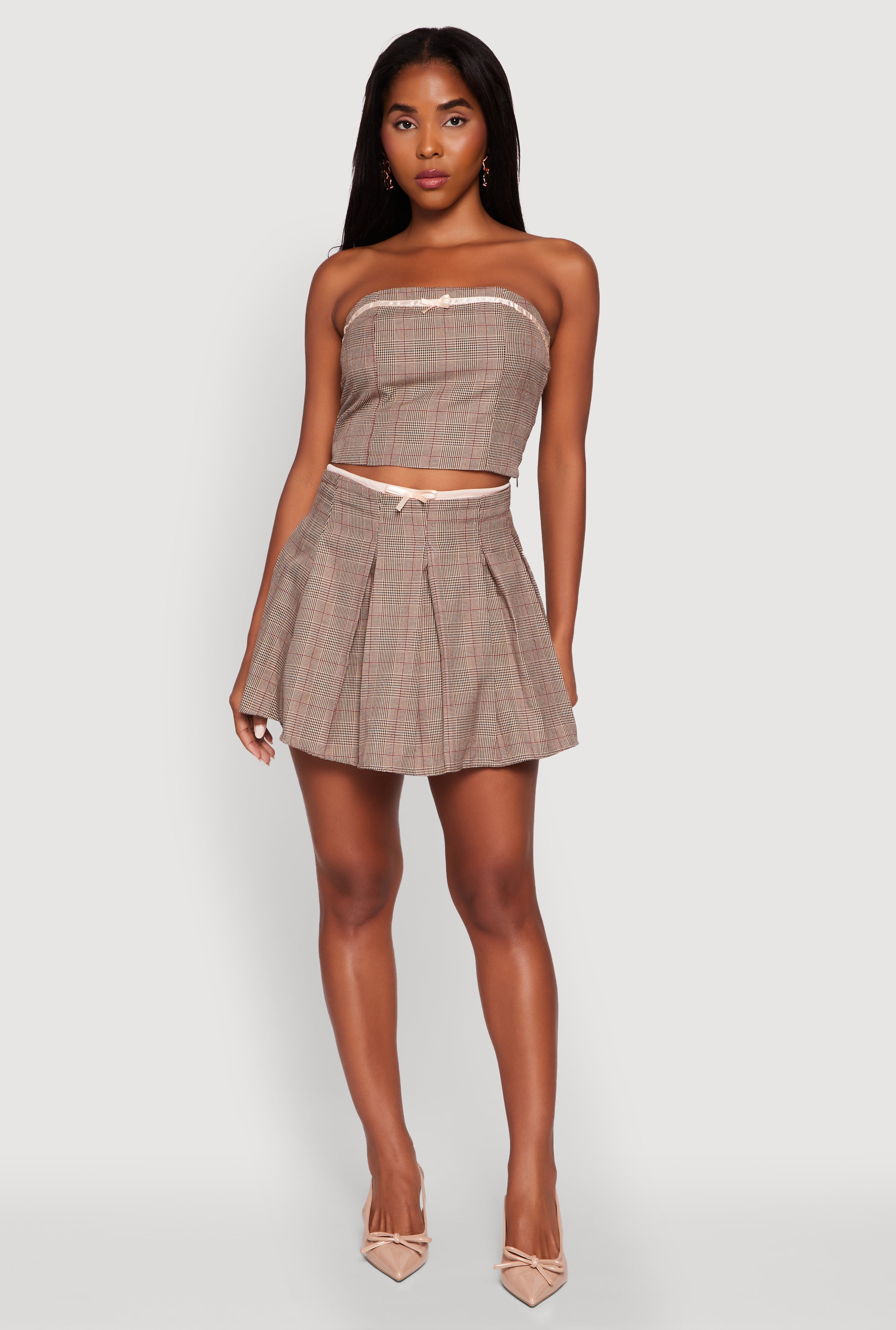 Plaid Tube Top with Bow Contrast Trim