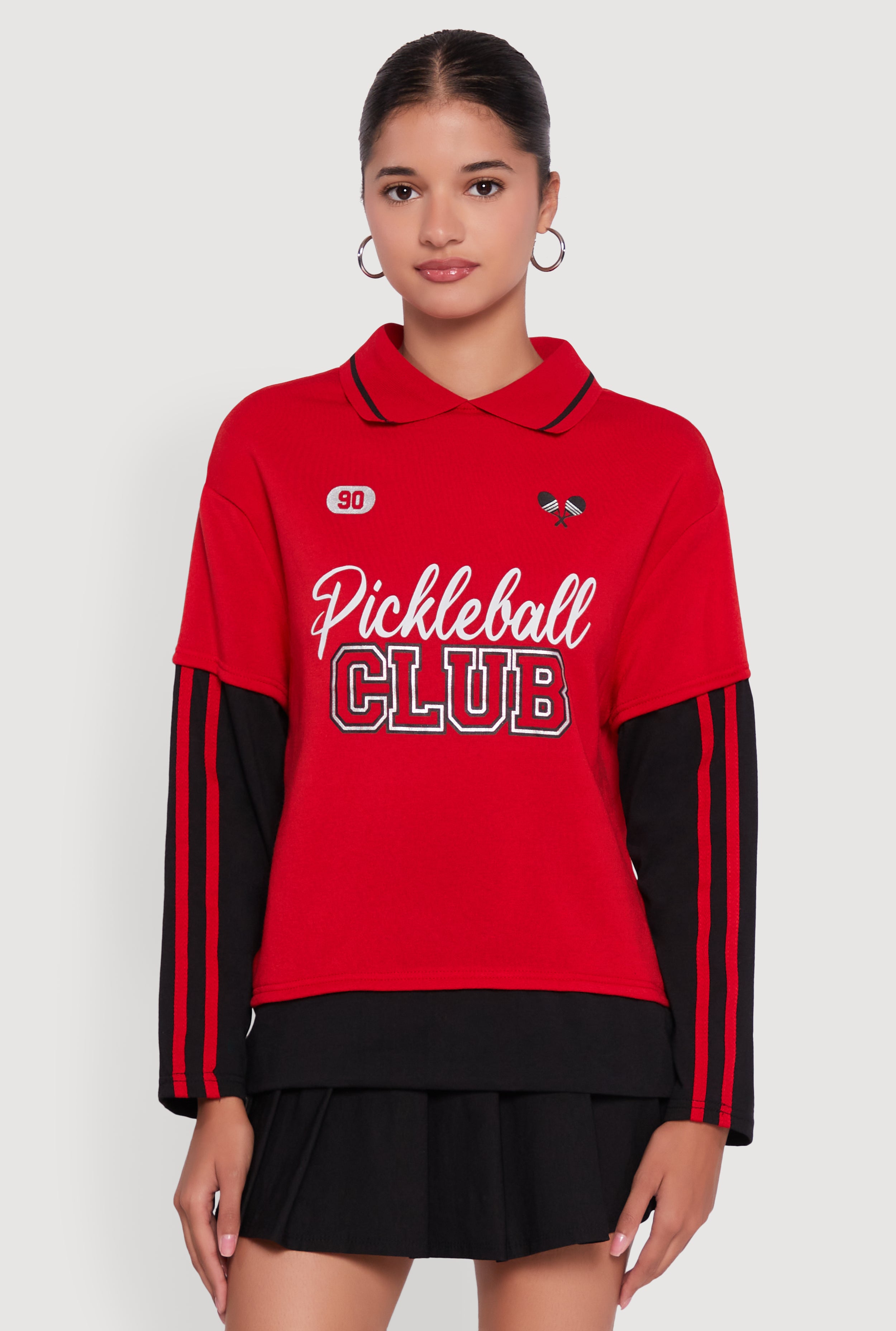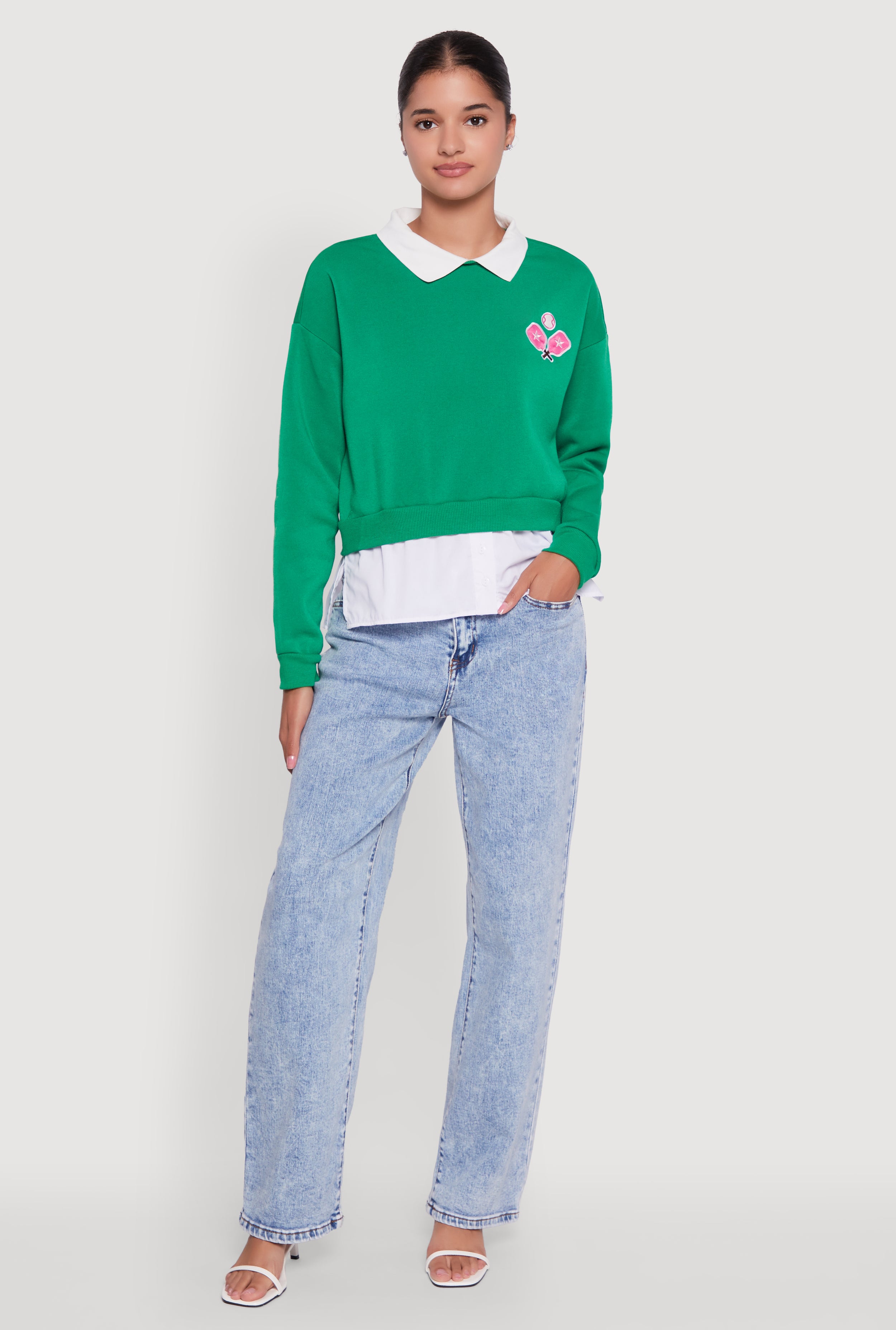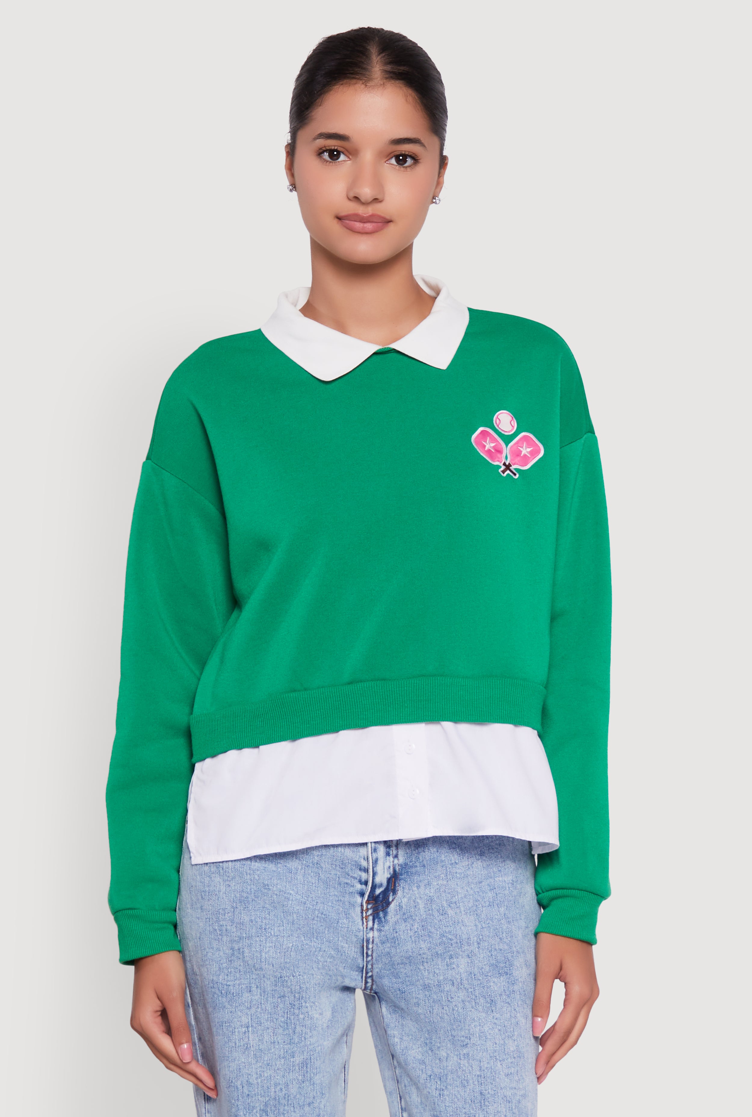 Shirt Collar Layered Look Patch Graphic Sweatshirt