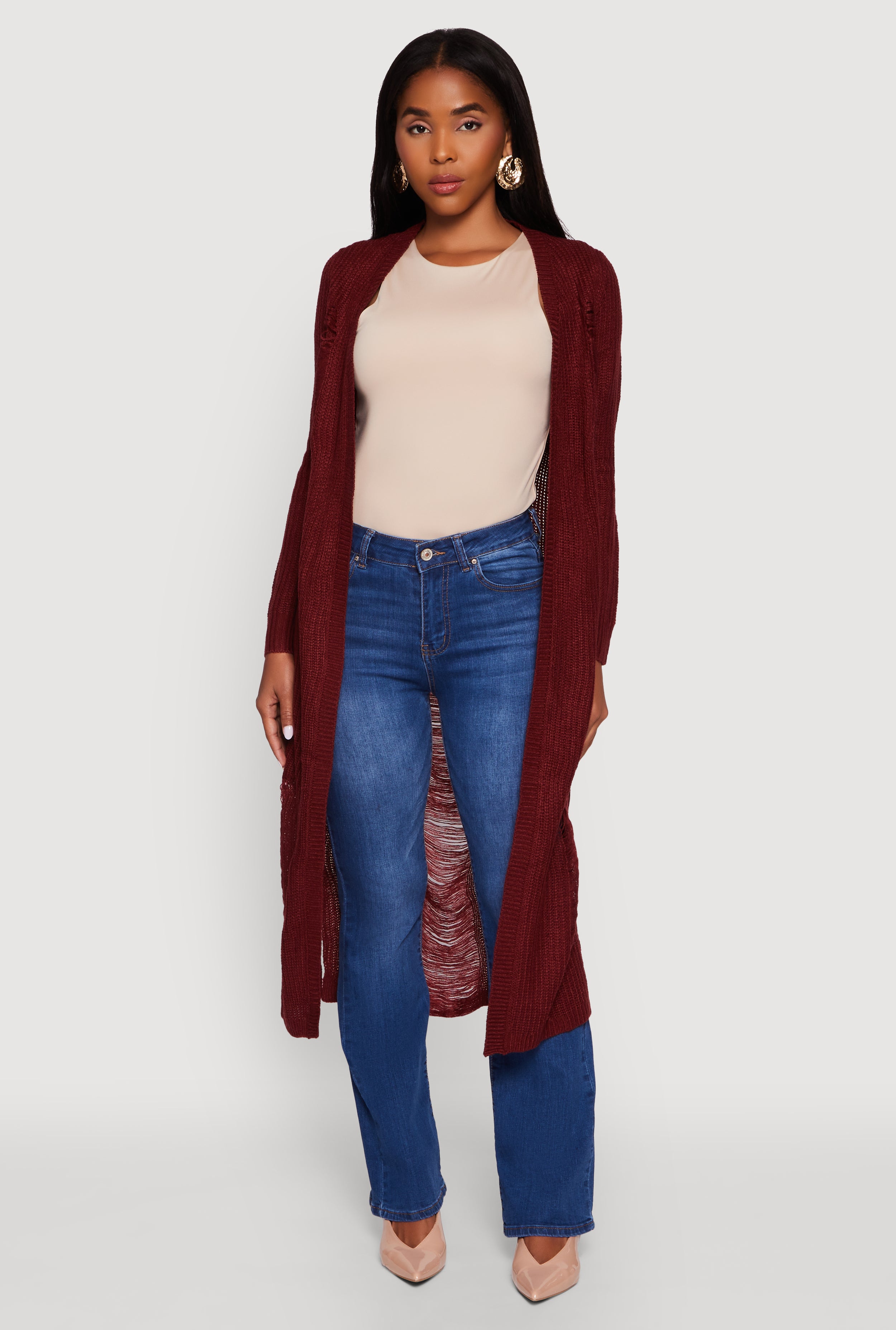 Distressed Long Sleeve Open Front Duster Cardigan