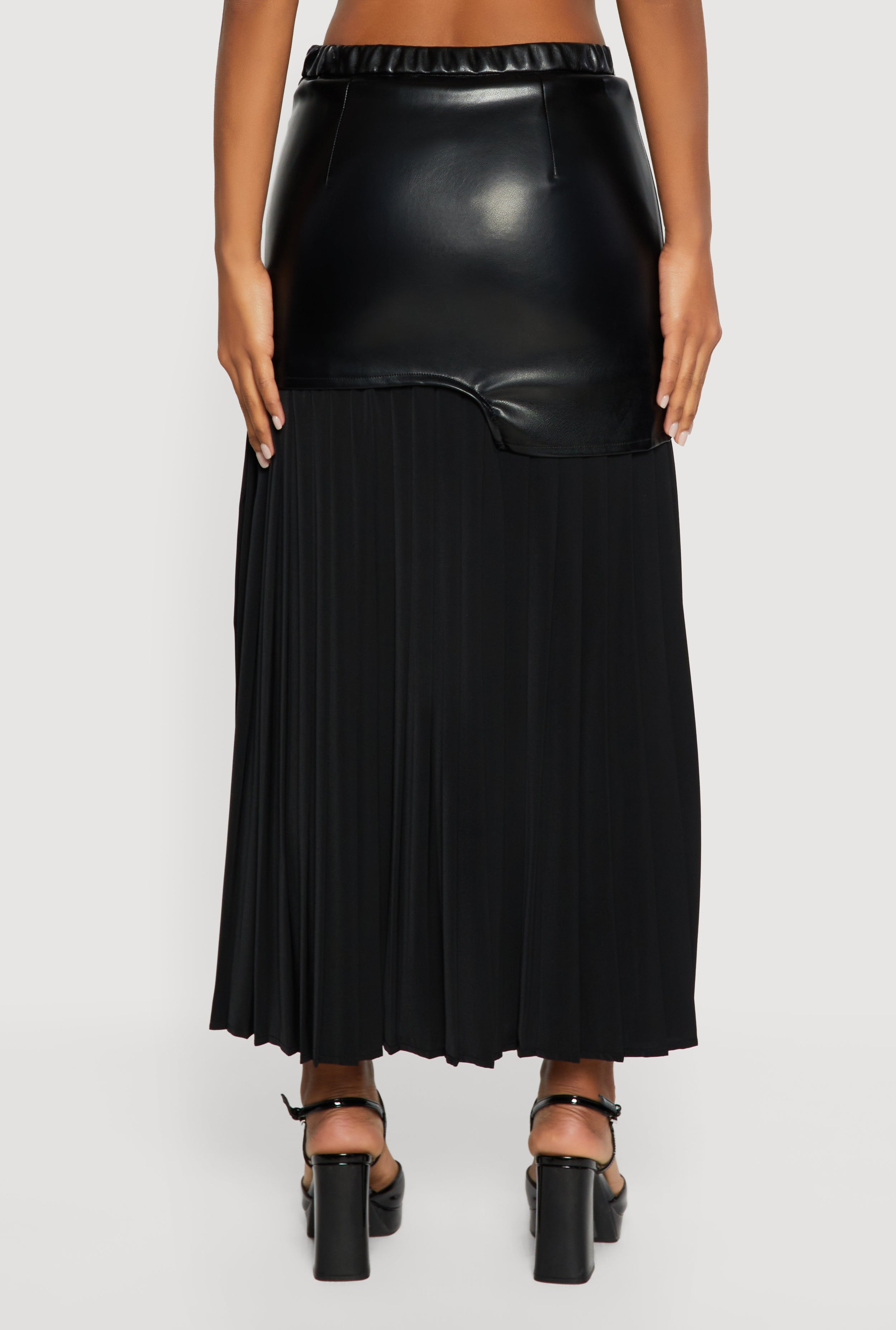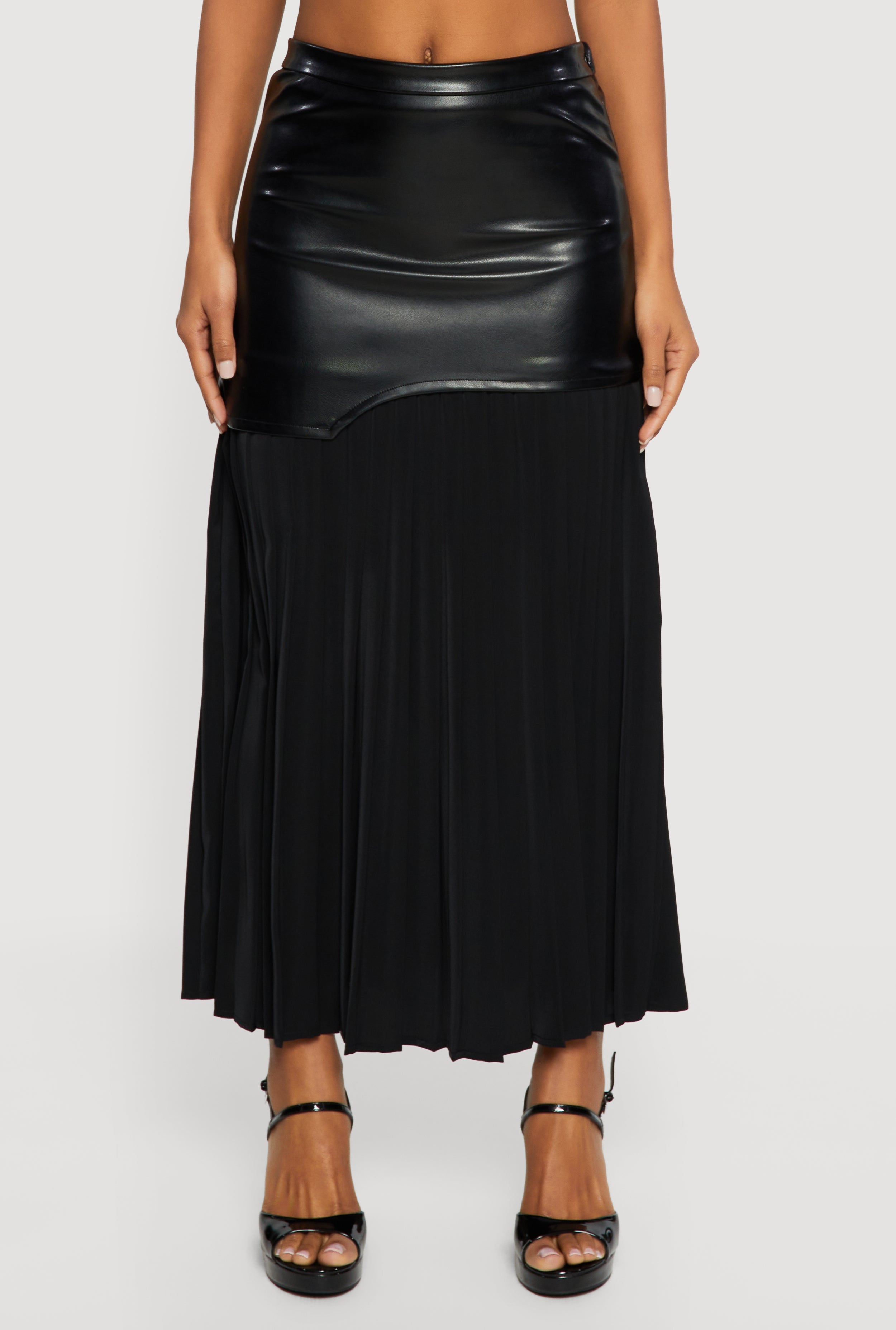- Mid-length pleated skirt offers movement and style