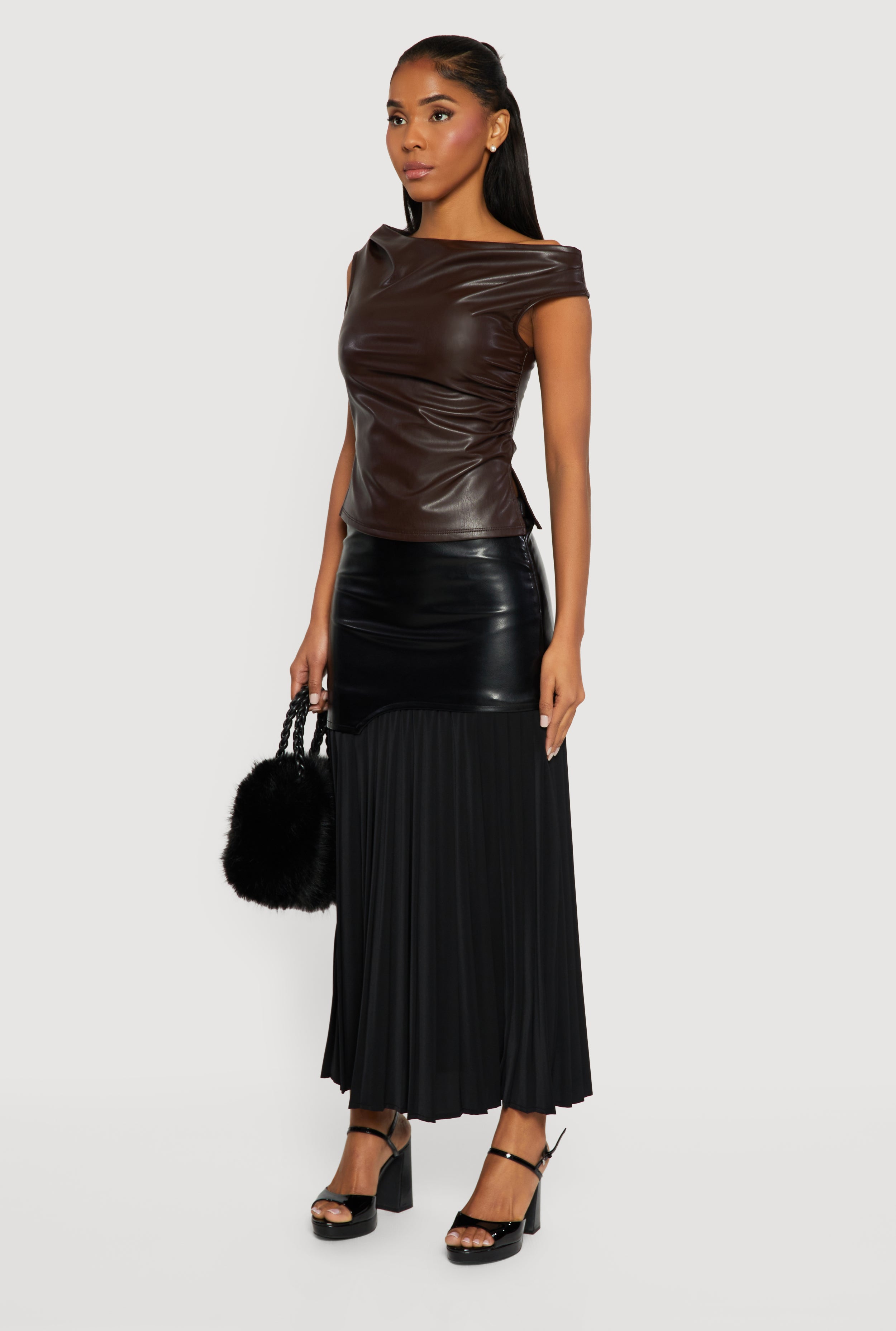 - Made from sleek faux leather for a bold, cruelty-free look