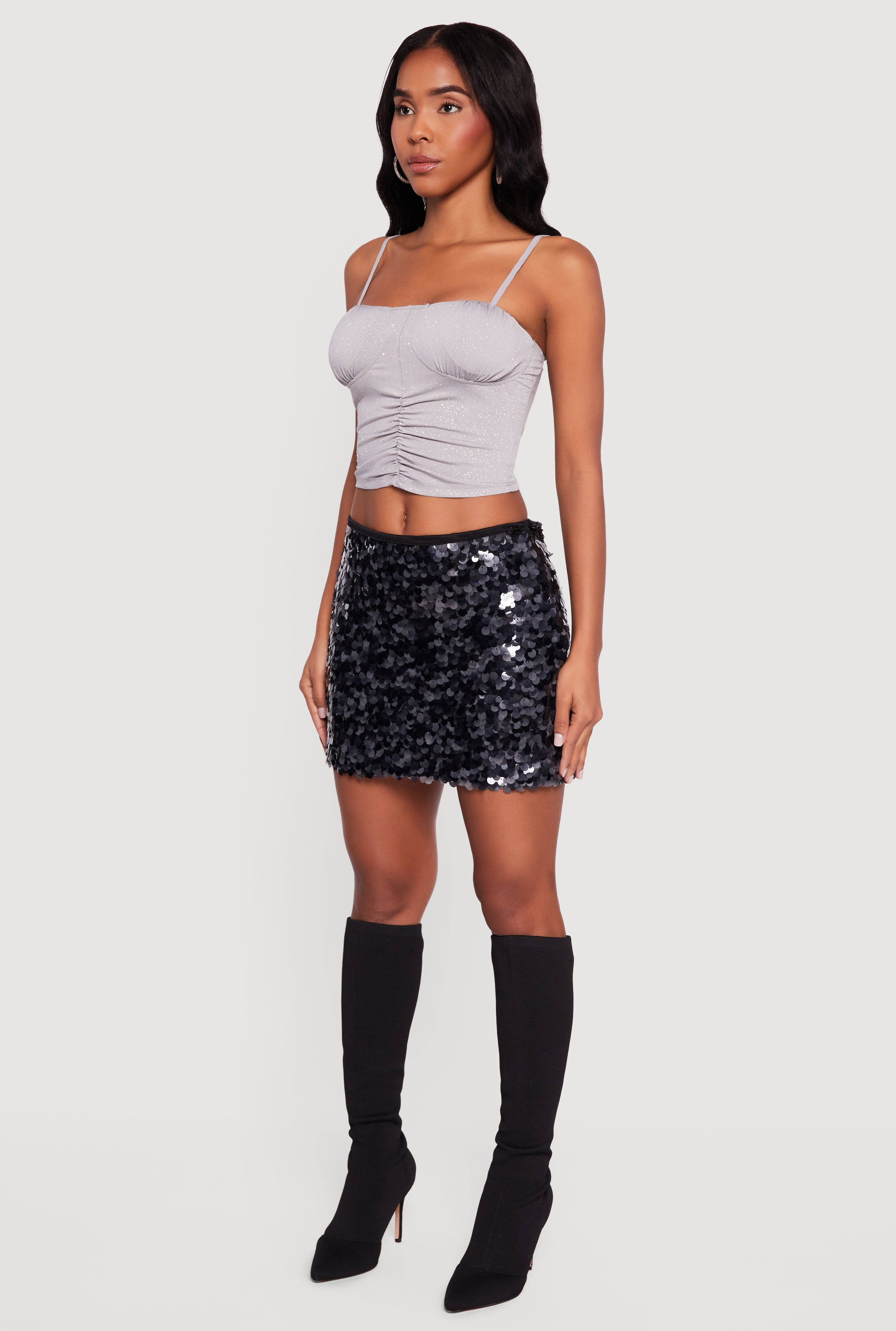 - Mesh material adorned with shimmering sequins for standout sparkle