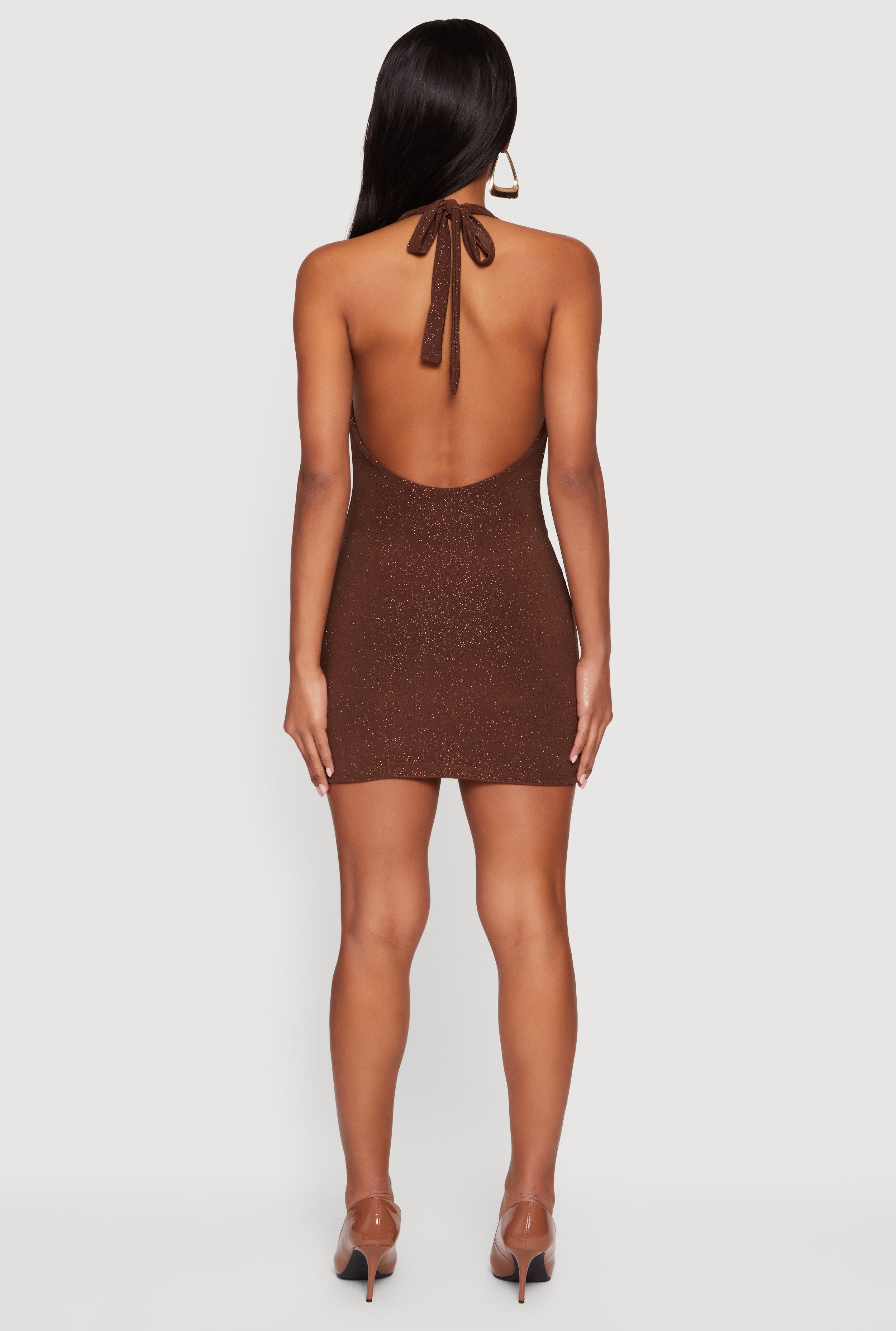 Step into the spotlight with this Glittery Cowl Neck Tie Back Halter Dress designed to turn heads wherever you go. Featuring a curve-hugging bodycon fit and a flirty short length, this sleeveless dress combines casual comfort with a touch of glam. The cowl neckline and tie-back halter style add playful sophistication, while the low back design keeps things daring and fresh. Perfect for nights out or casual events when you want to shine without trying too hard.