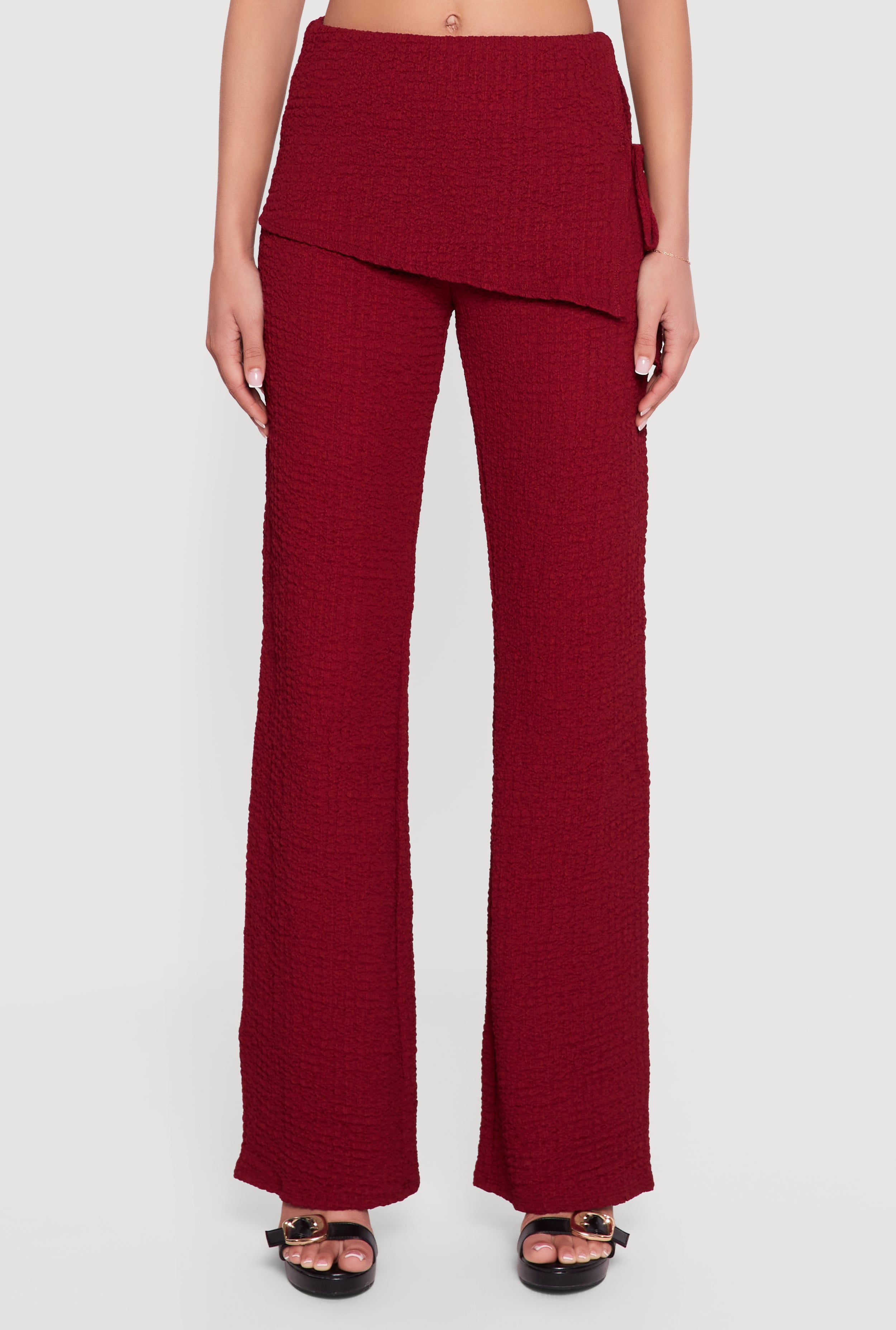 Step into effortless style with these Textured Knit Side Tie Asymmetrical Fold Over Waist Pants. Designed for casual comfort and standout flair, these pants feature a unique asymmetrical fold over waist and a flattering mid rise that hugs your natural silhouette. The wide-leg cut flows beautifully, giving you that laid-back yet polished vibe perfect for any chill day out or casual hangout. The side tie adds a playful touch while the pull-on design ensures easy wear. Crafted from soft textured knit fabric, these pants are a cozy essential that will quickly become your go-to for everyday cool.