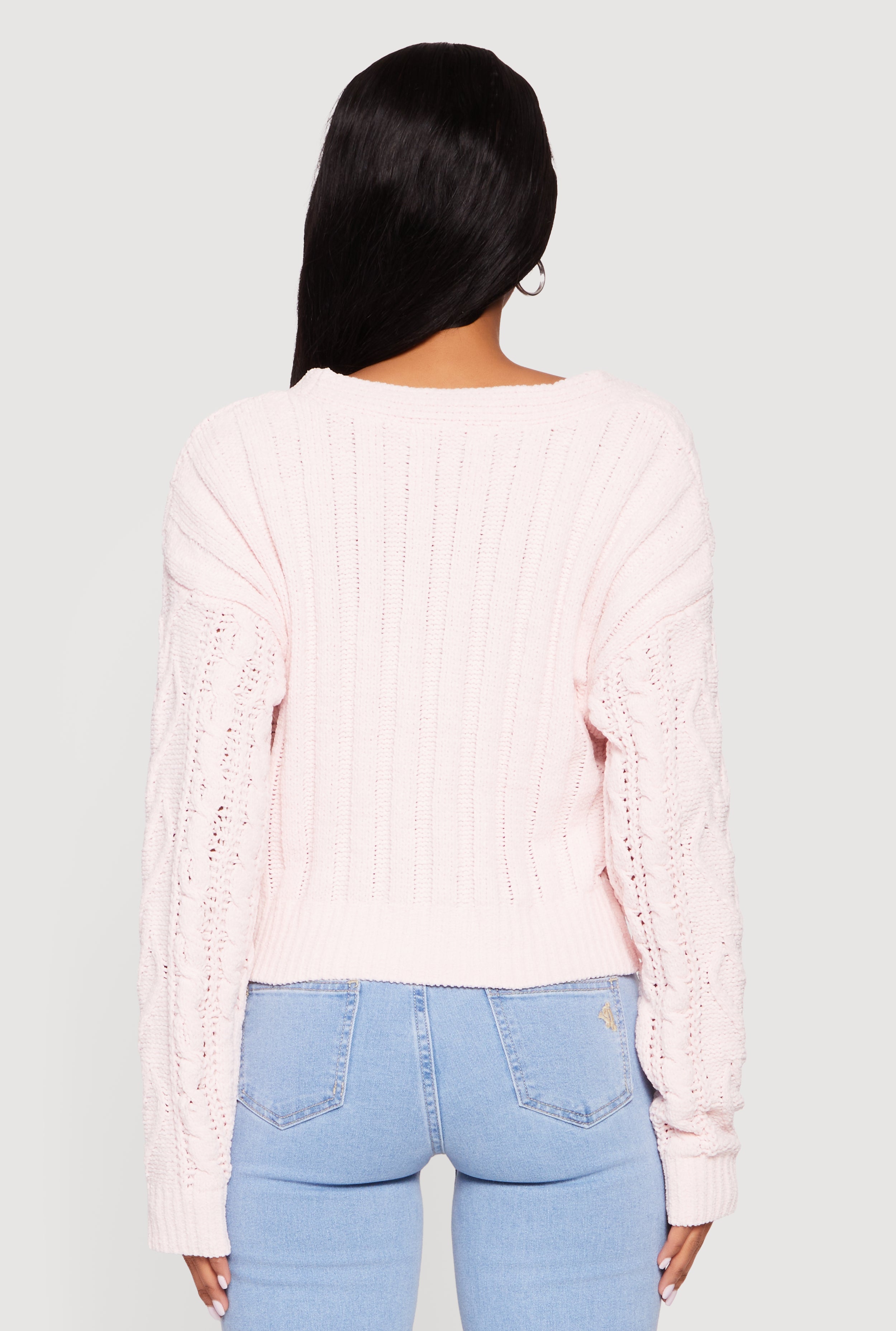 Cozy up in style with the Chenille Cable Knit Long Sleeve Cardigan with Bows. This classic fit cardigan features a soft chenille fabric and charming cable knit texture that adds a touch of warmth and elegance to your everyday look. The hidden snap button front keeps the silhouette sleek, while delicate bows bring a playful, feminine vibe. Perfect for layering over your favorite casual outfits, this V-neck cardigan is a must-have for effortless comfort and cute style.