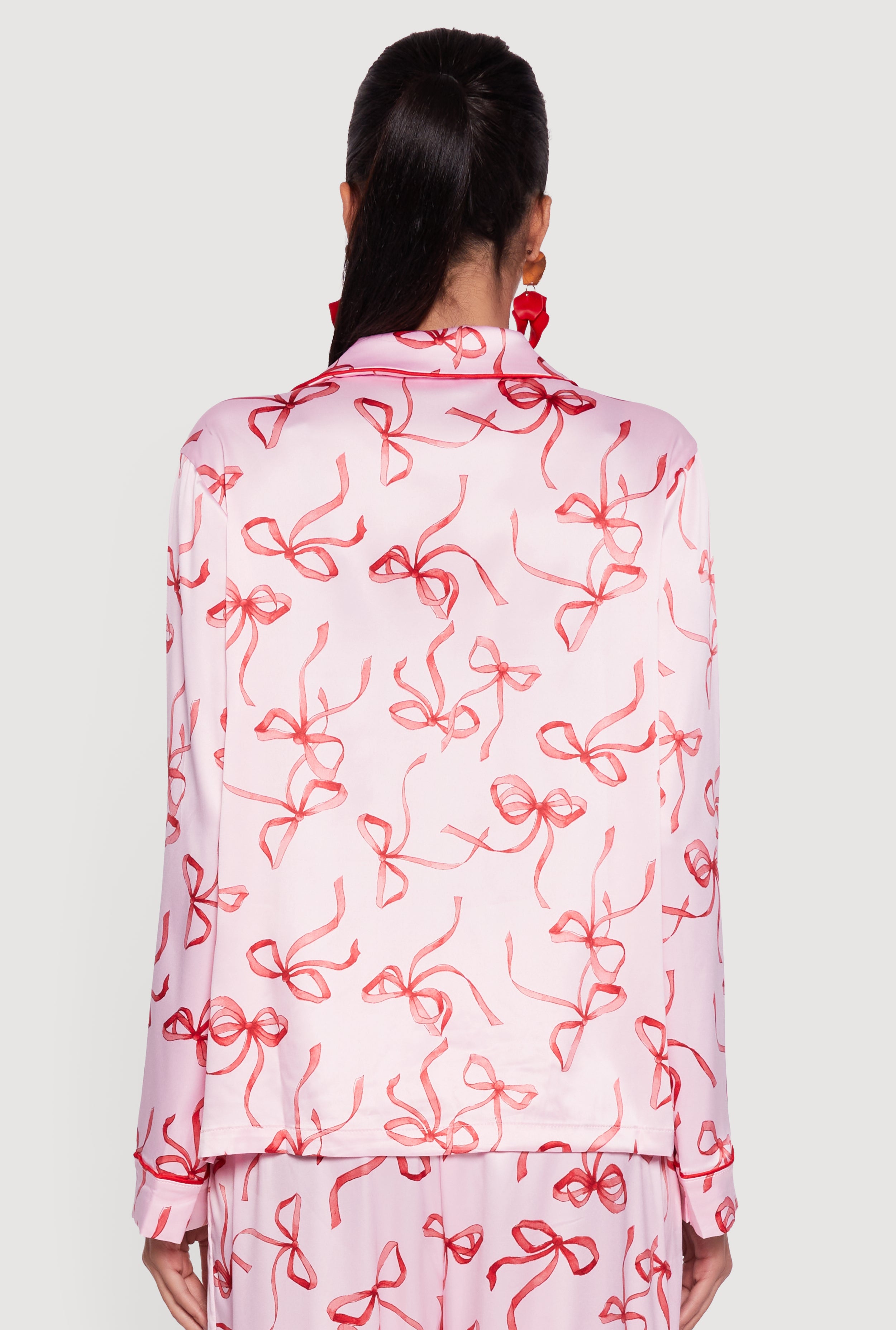 Elevate your everyday look with this Satin Bow Print Long Sleeve Button Front Shirt. Designed with a relaxed fit and crafted from smooth satin, it offers a perfect blend of comfort and style. The playful bow print adds a cute touch, while the classic shirt collar and button-front closure keep it effortlessly chic. Ideal for casual days or lounging in style, this shirt is your new go-to for easy, feminine vibes.