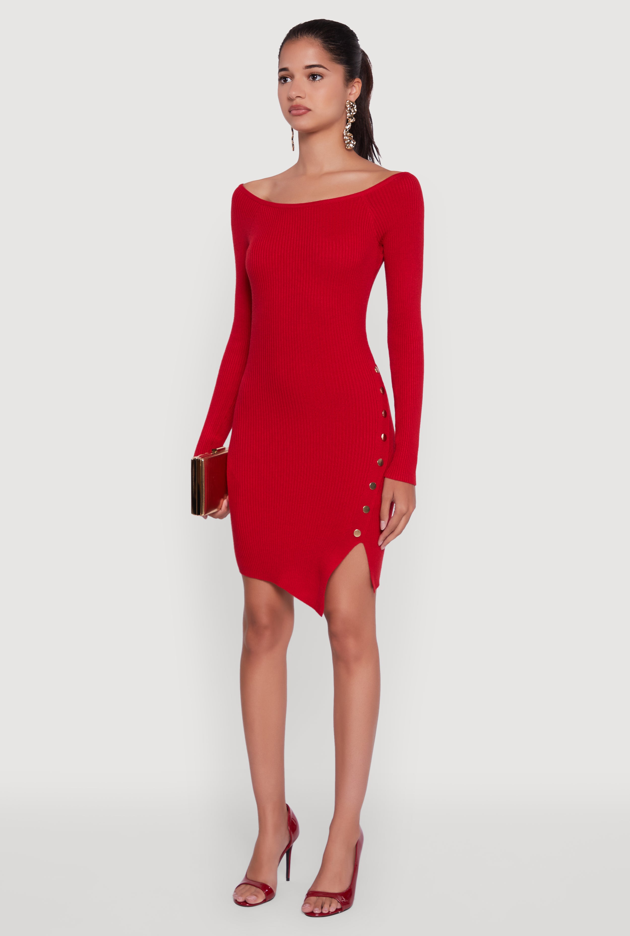 Slip into the Metallic Button Detail Side Slit Boat Neck Sweater Dress and instantly elevate your night out look. This curve hugging ribbed knit dress is designed to flaunt your silhouette with a chic boat neckline and a playful side slit that adds just the right amount of edge. The faux metallic buttons bring a subtle shine that catches every eye, making it perfect for parties or any occasion where you want to stand out without trying too hard. Cozy, stylish, and effortlessly cool—this dress is your new go-to for turning heads and feeling fabulous.