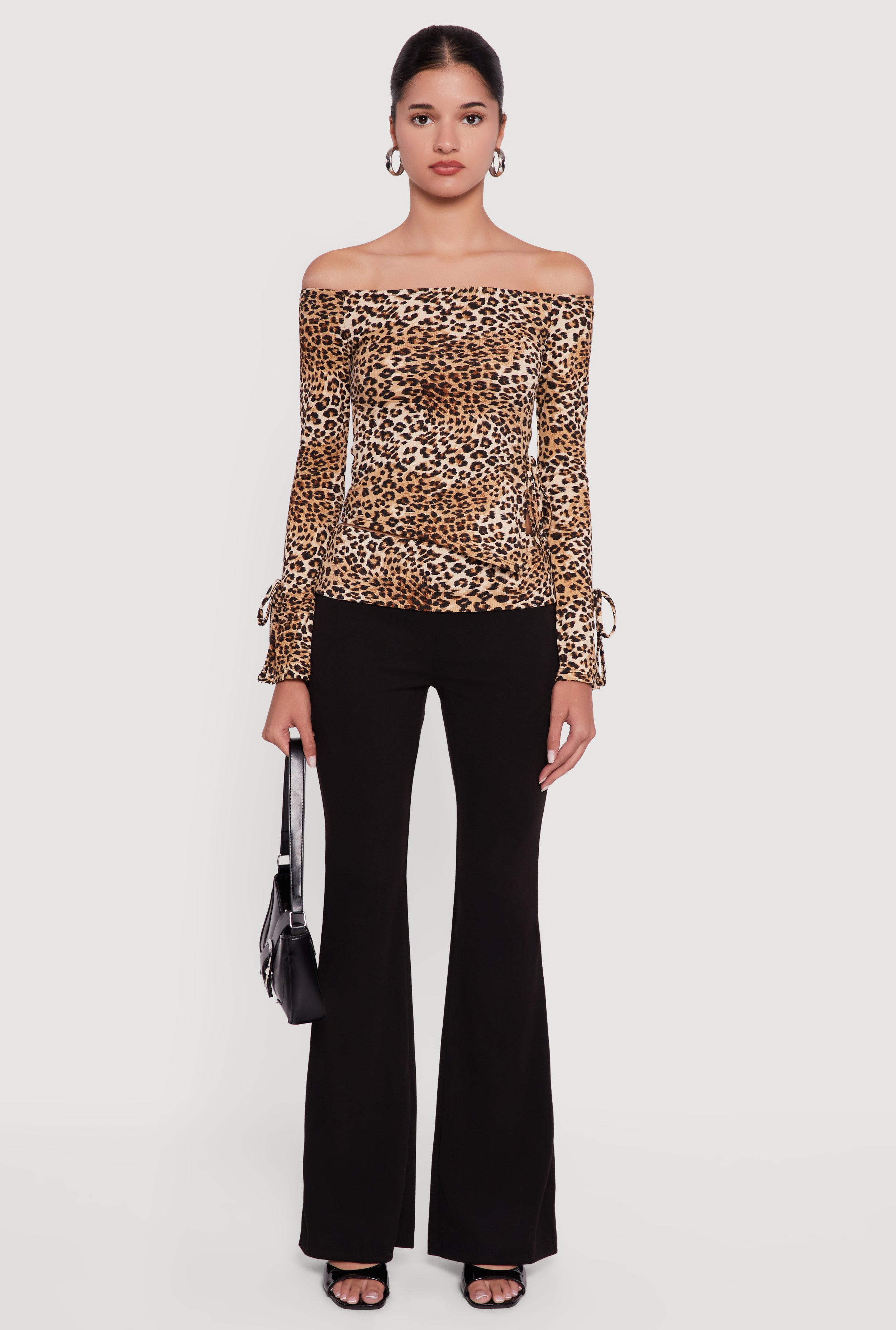 Turn heads with this Ribbed Knit Leopard Print Off the Shoulder Blouse, designed to bring a fierce and flirty vibe to your casual wardrobe. Featuring a classic fit that flatters every shape, this blouse combines the timeless appeal of ribbed knit fabric with a bold animal print that never goes out of style. The off the shoulder neckline adds a touch of playful elegance, while the bell sleeves and asymmetrical hem create movement and dimension. Perfect for day-to-night looks, this blouse pairs effortlessly with your favorite jeans or skirts for an easy, chic outfit.