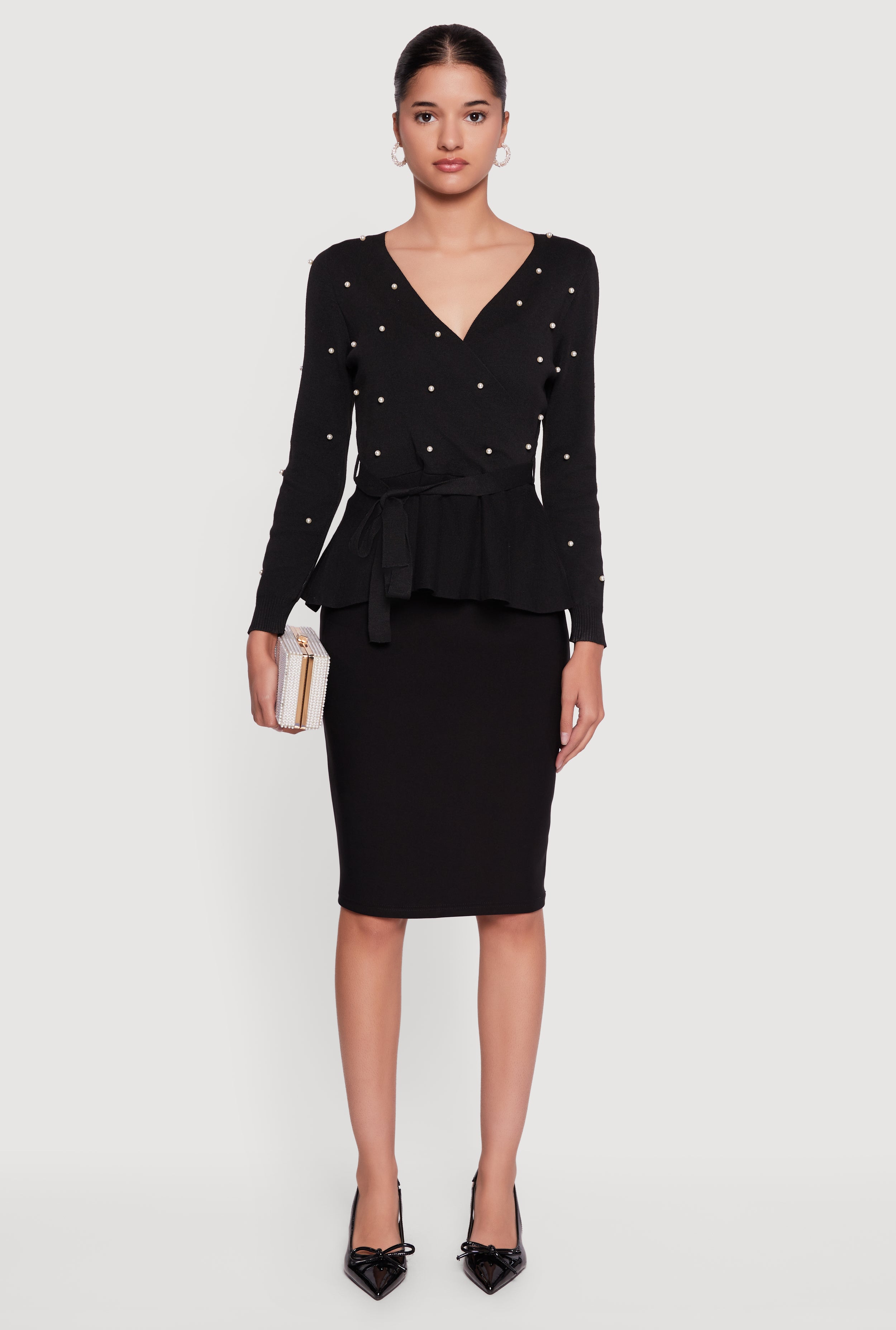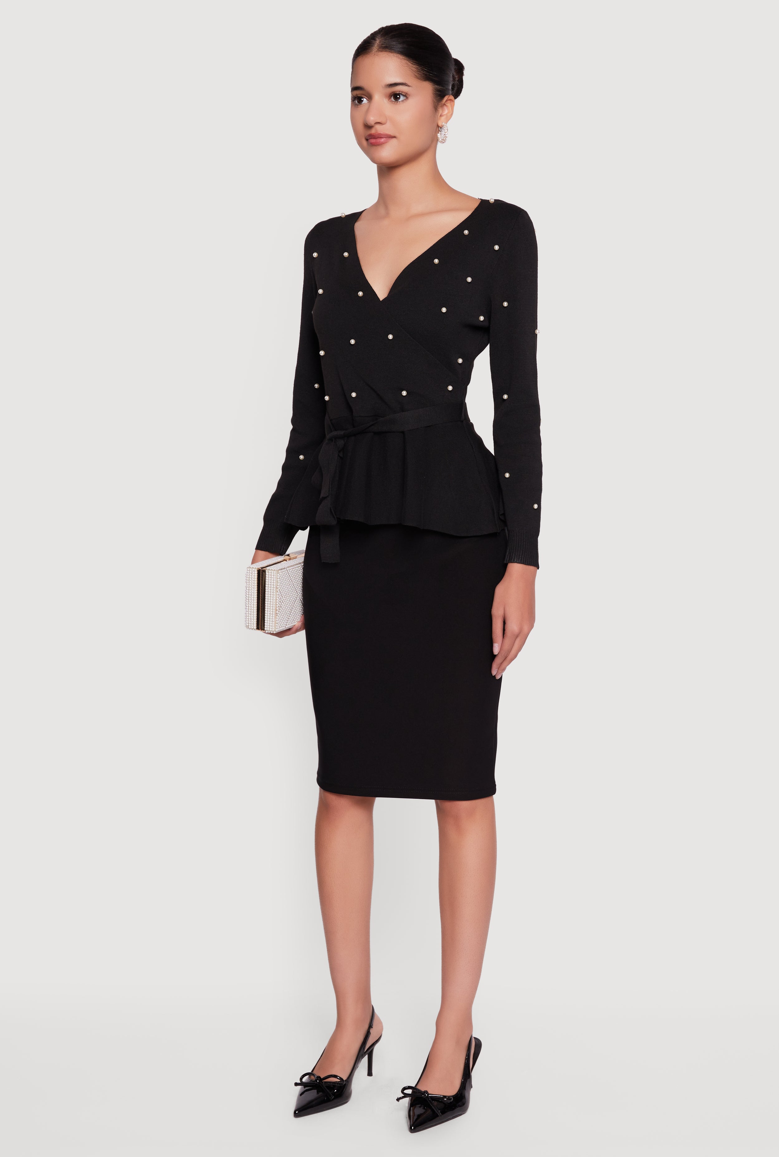 • Faux Pearl Faux Wrap Peplum Sweater with Tie Waist Belt