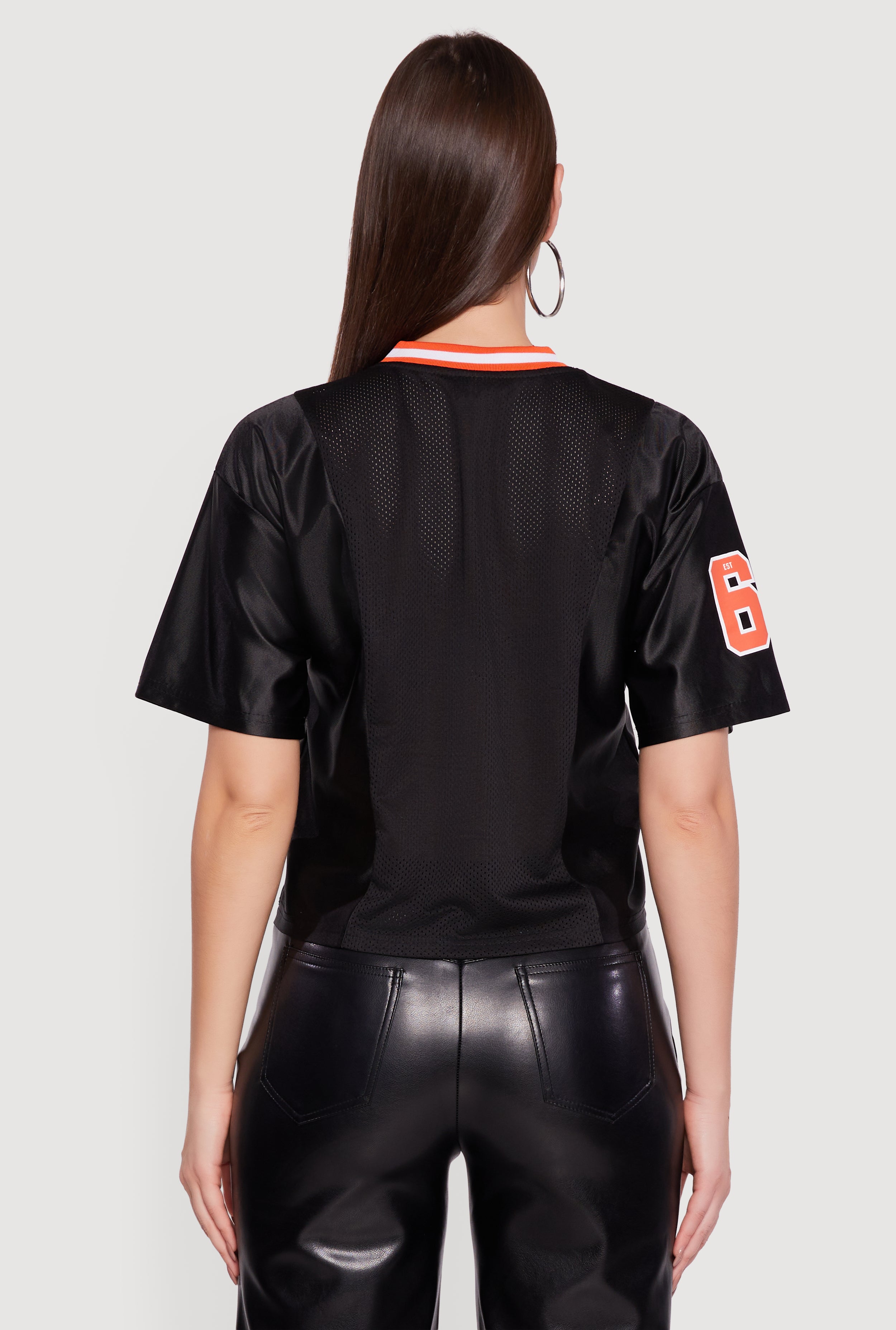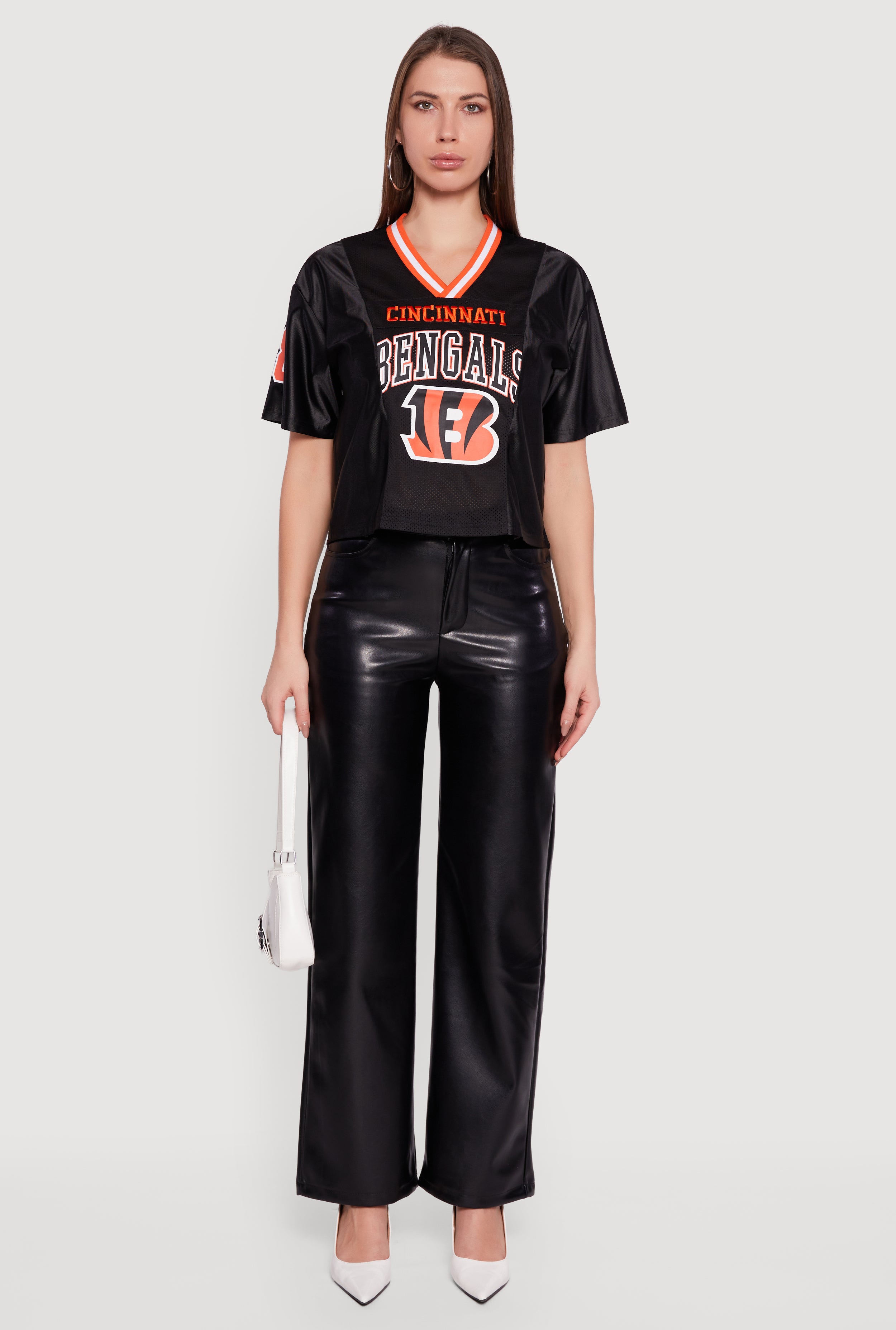 Show off your team spirit with the NFL Cincinnati Bengals Football Jersey designed just for women who love comfort and style. Crafted from breathable jersey mesh, this relaxed fit crop tee keeps you cool whether you're cheering from the stands or hanging out with friends. The classic V-neck and short sleeves add a sporty vibe, while the embroidered details bring that authentic game-day energy. Perfect for casual days or athleisure looks, this jersey is your new go-to for effortless cool.