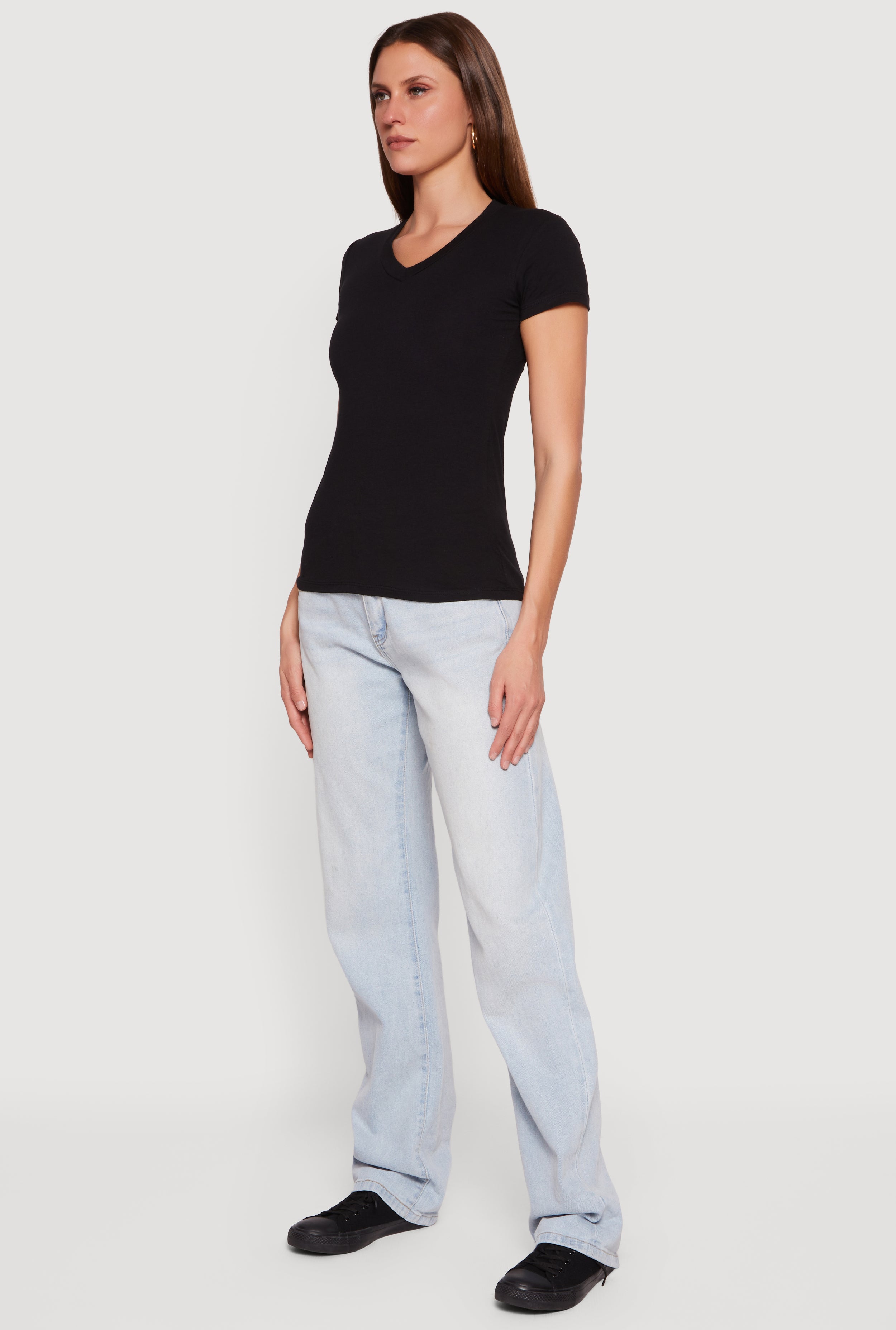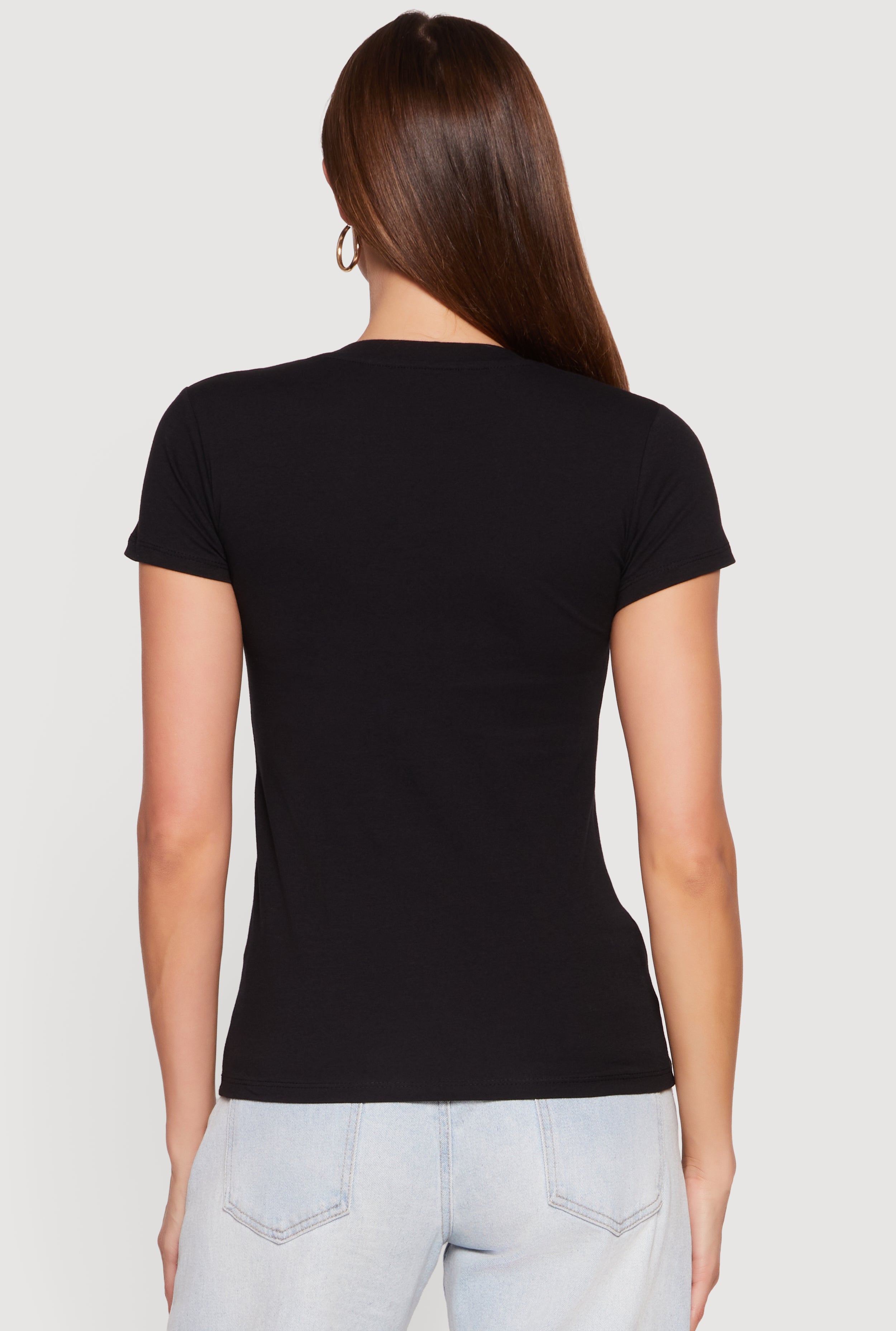 This classic short sleeve top features a flattering V-neckline and a timeless silhouette that fits just right. Its straightforward design makes it a versatile staple for casual days, easily pairing with your favorite jeans or layering under jackets for effortless style.