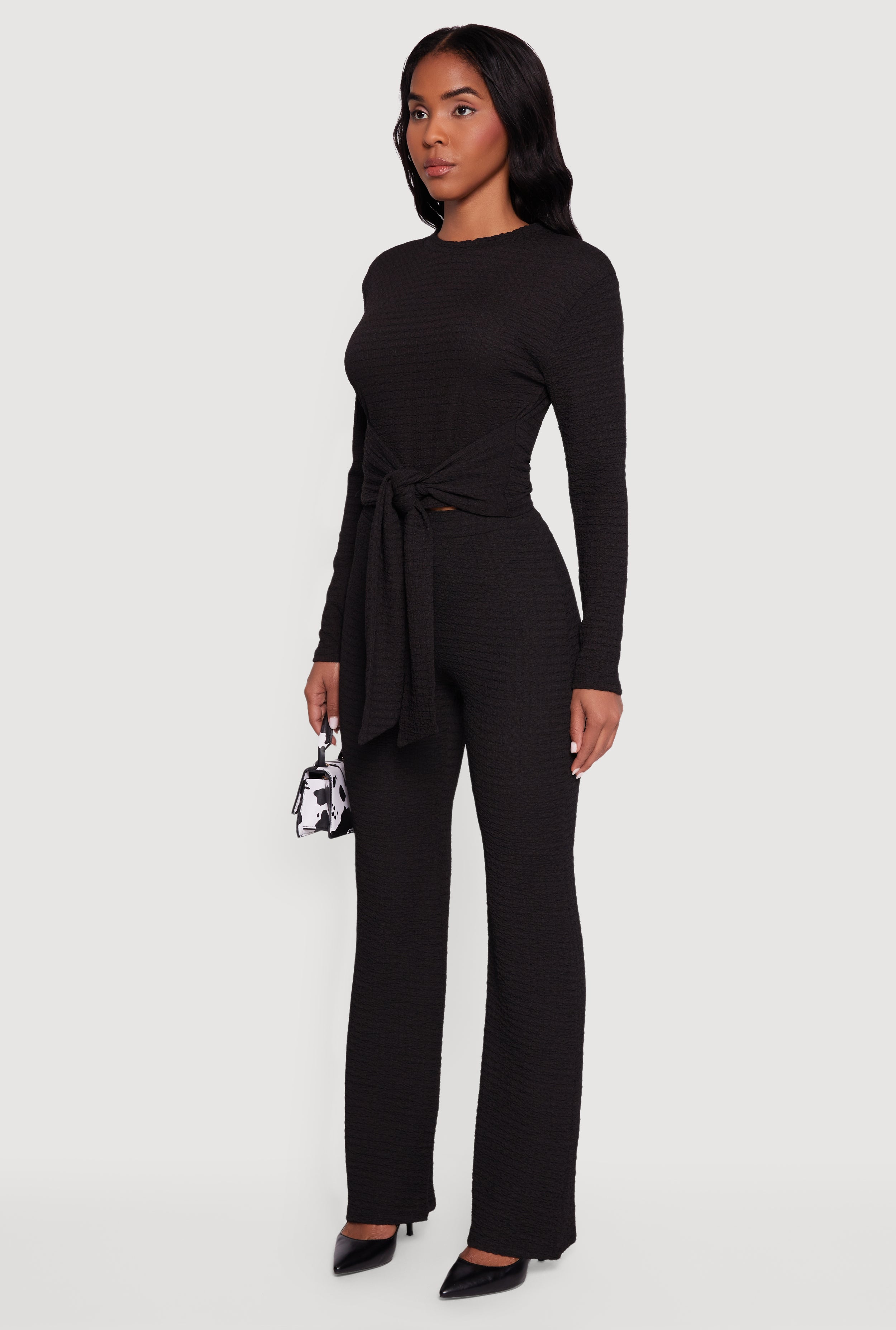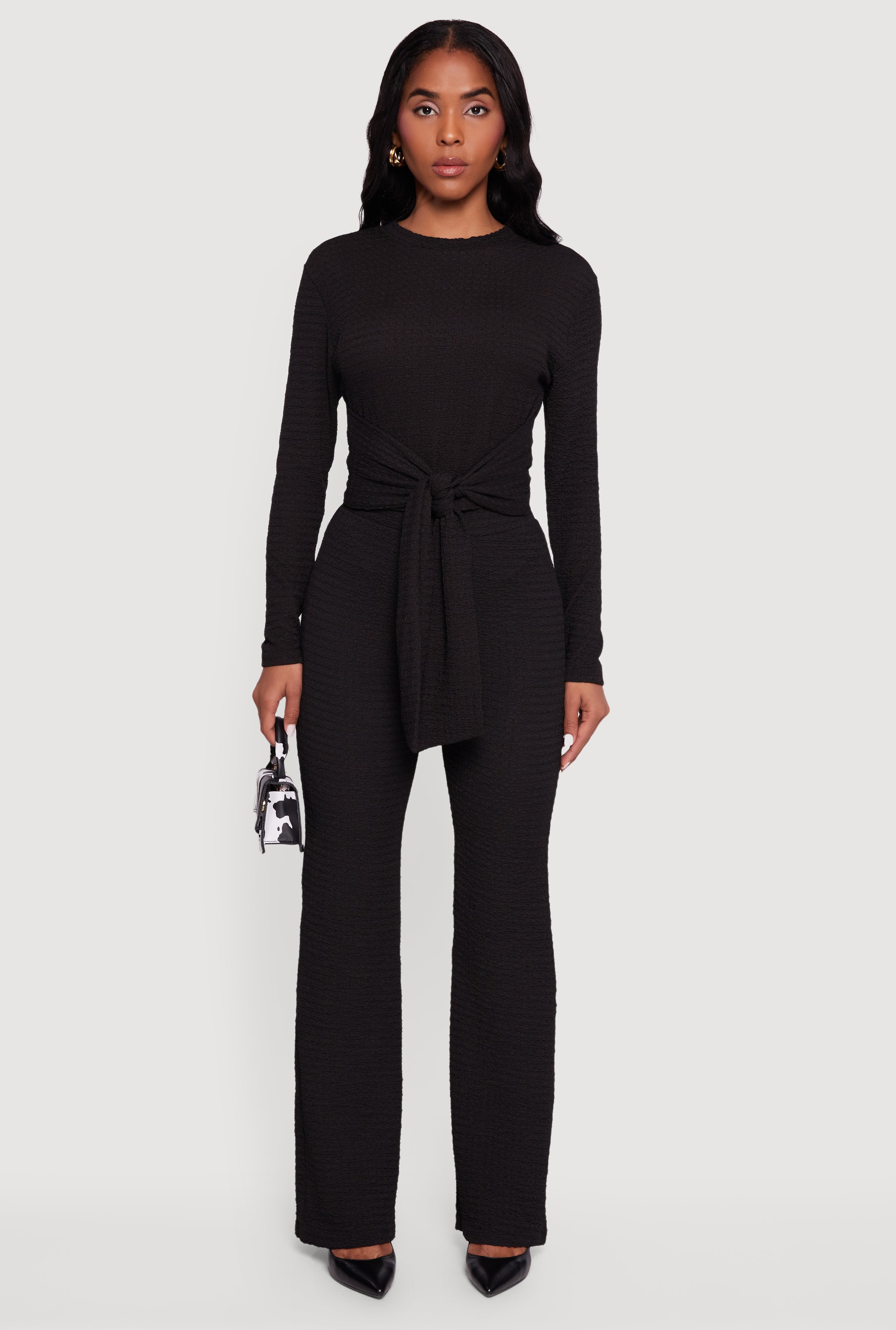 Step up your style game with this Textured Knit Tie Front Long Sleeve Blouse. Perfect for any occasion, whether you're heading to the office, a casual hangout, or a night out. The classic fit flatters every shape, while the tie front detail adds a playful, trendy twist. Made from cozy textured knit fabric, it’s as comfortable as it is chic. Dress it up or down and enjoy effortless style all day long.
