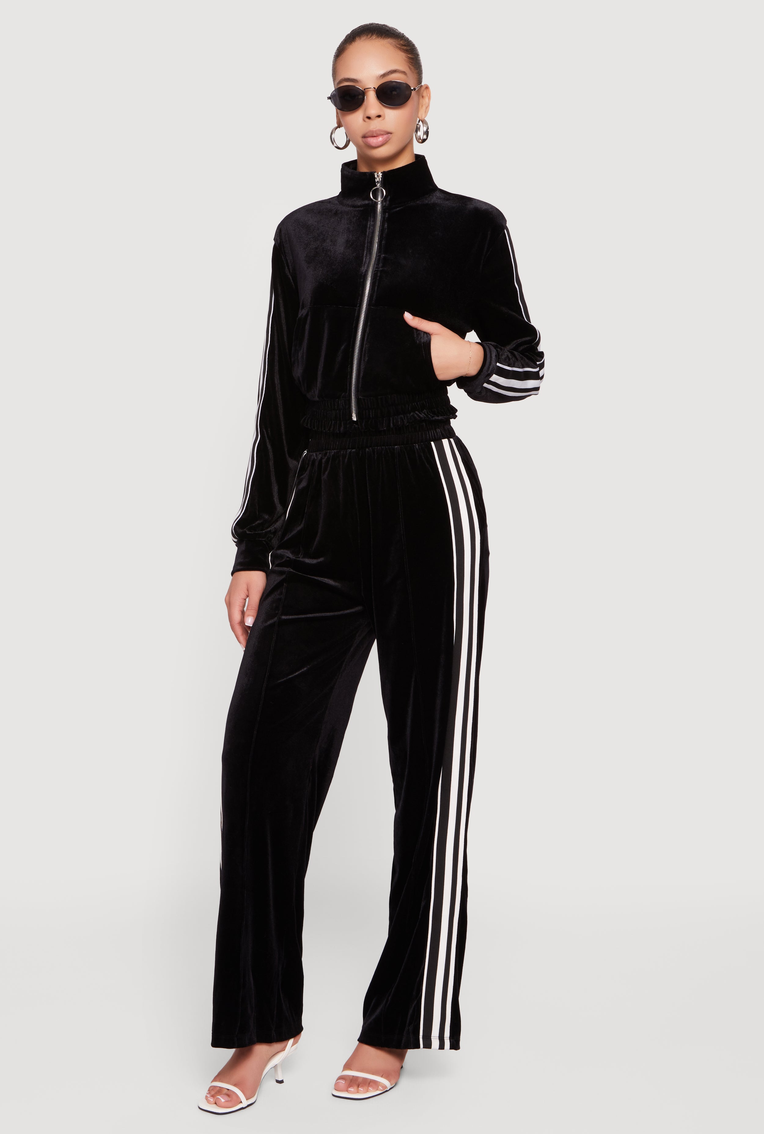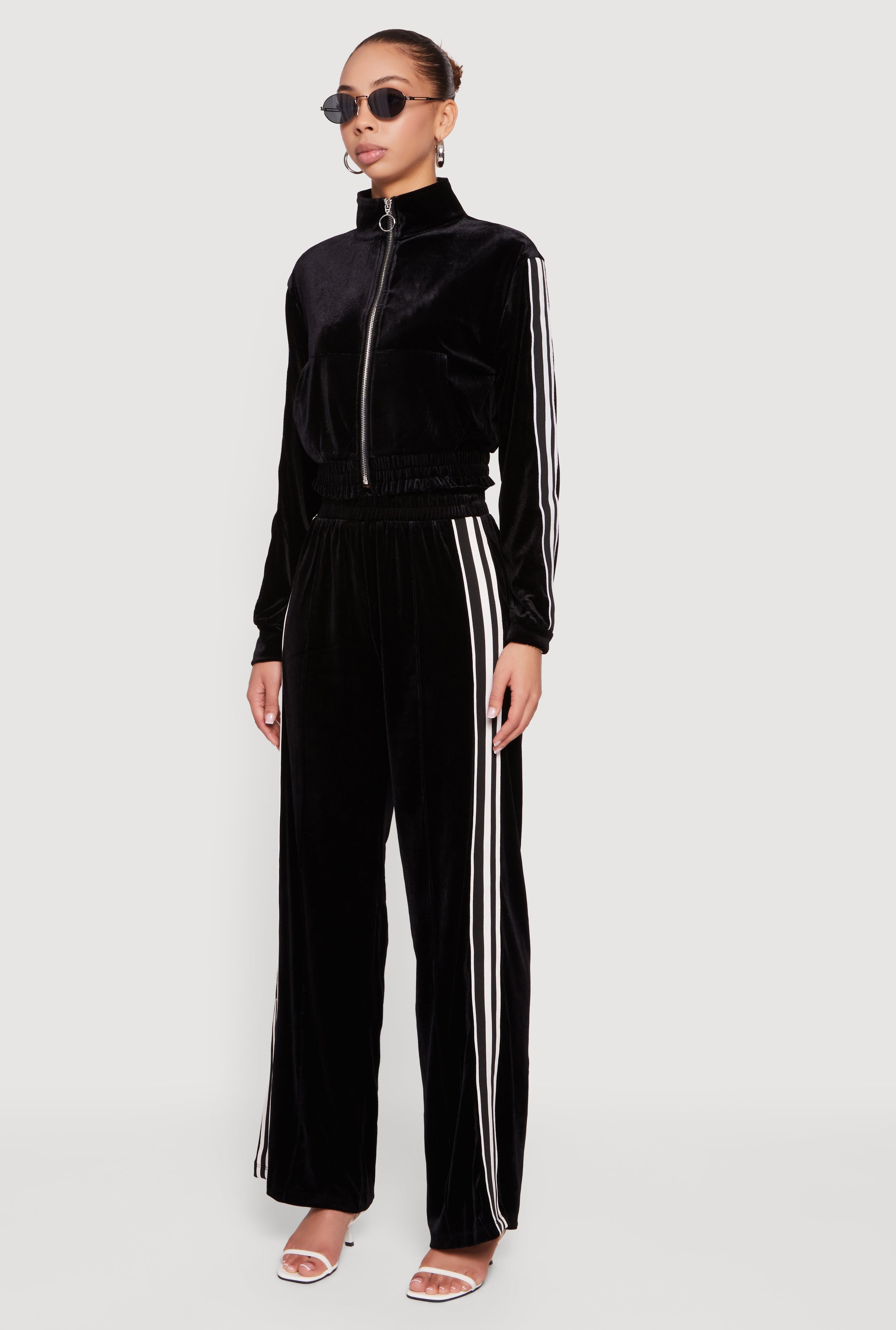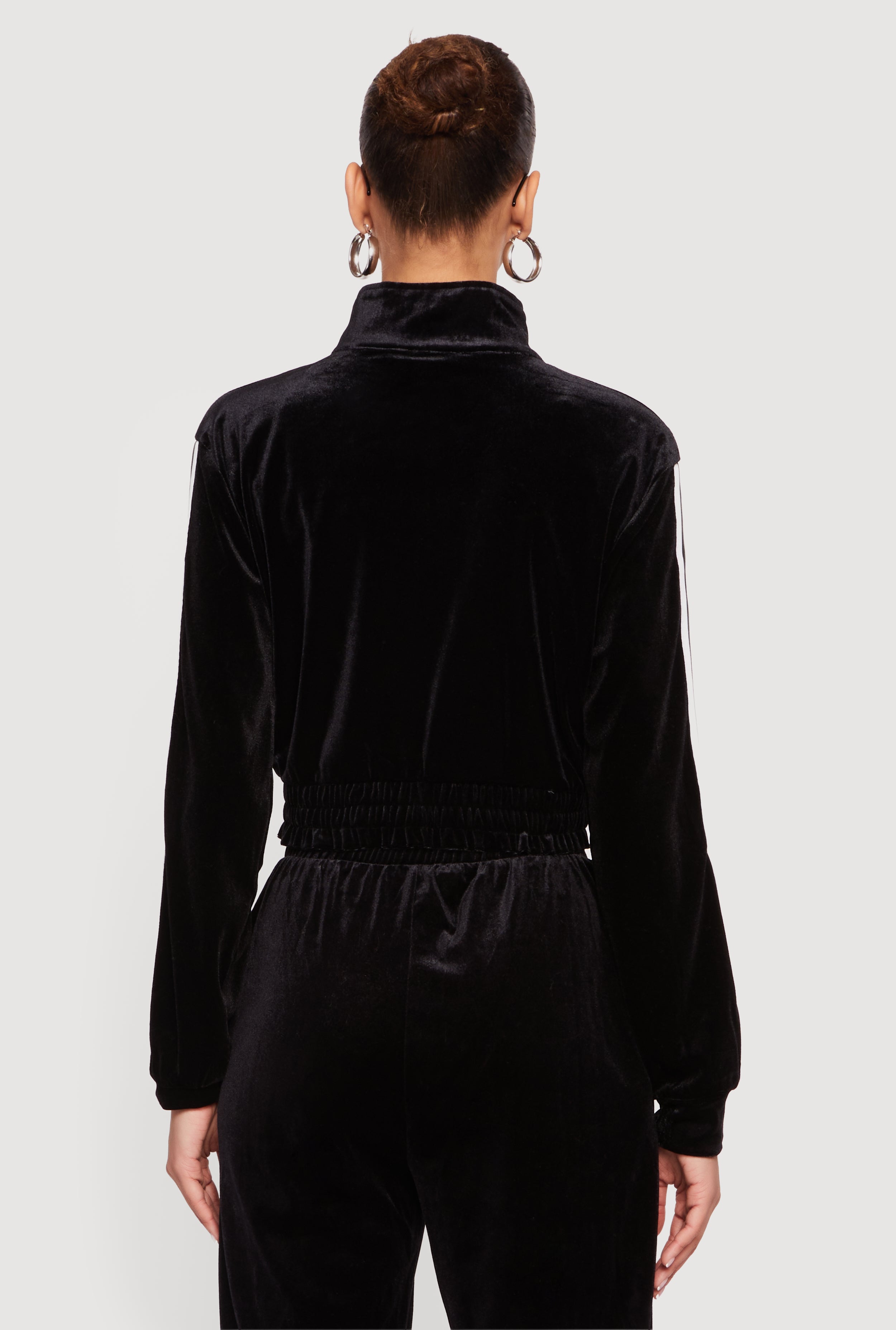 Step up your casual game with this Velour Side Stripe Mock Neck Zip Front Top. Designed with a classic fit and crafted from soft velour, it blends retro vibes with modern athleisure style. The O-ring zipper and side stripes add just the right amount of edge, while the elastic hem keeps your look effortlessly chic and comfortable. Perfect for lounging or running errands, this cropped sweatshirt is your new go-to for laid-back cool.
