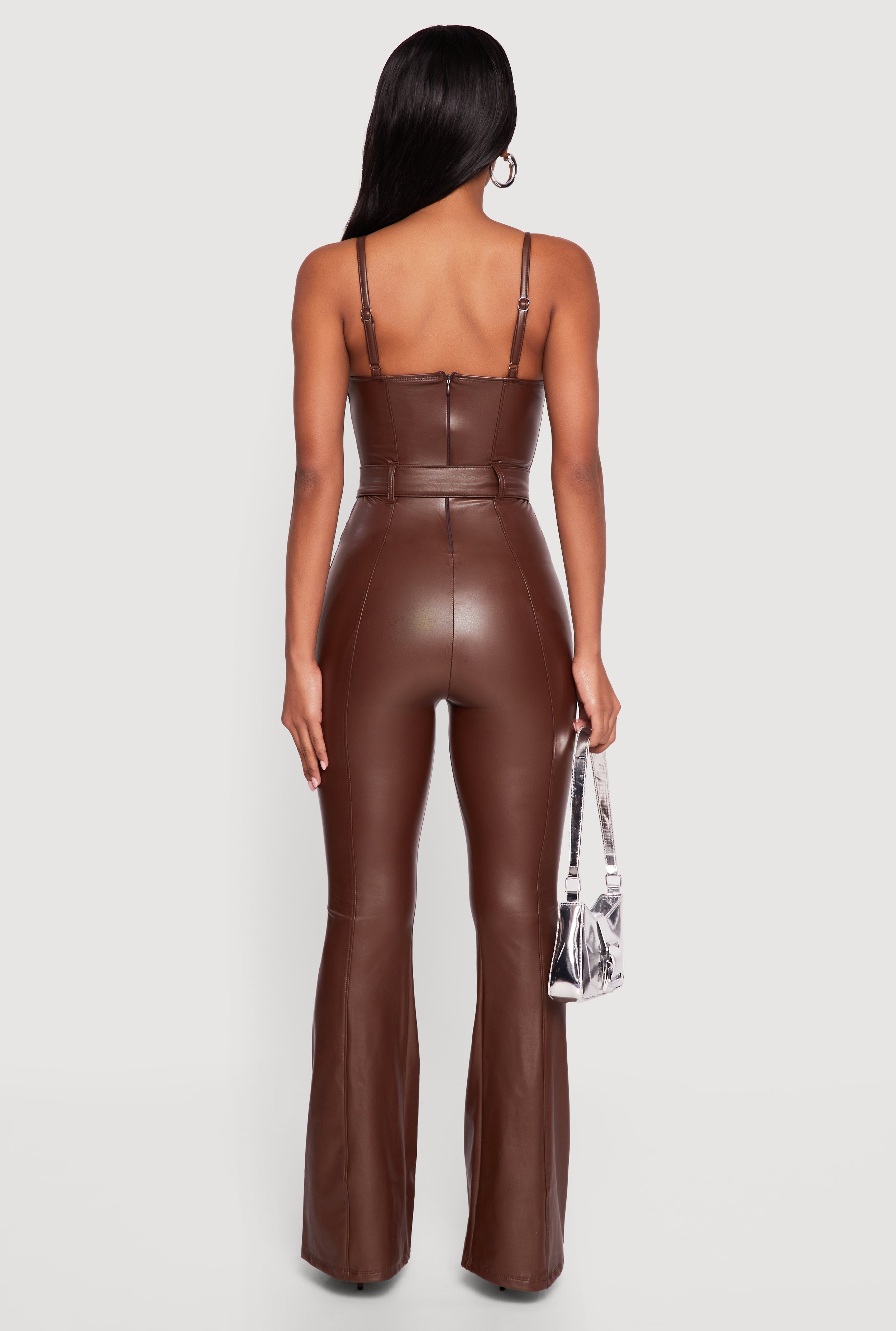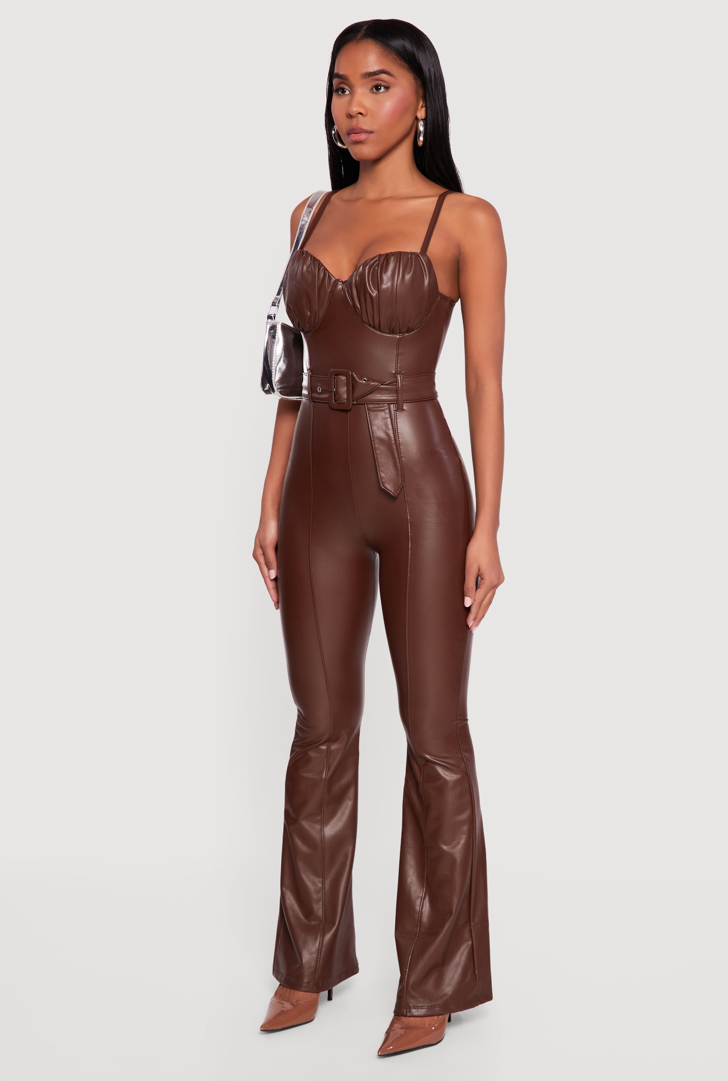 Step into bold style with this Faux Leather Ruched Sweetheart Neckline Belted Jumpsuit. Designed to turn heads, it features a flattering sweetheart neckline and ruched detailing that adds texture and shape. The belted waist cinches you in for that perfect silhouette, while the flare-leg pants bring a touch of retro cool. Padded cups provide support and confidence, making this sleeveless jumpsuit a standout piece for casual outings or nights out. Easy to wear with a zipper closure and lined for comfort, it’s the ultimate blend of edgy and chic.