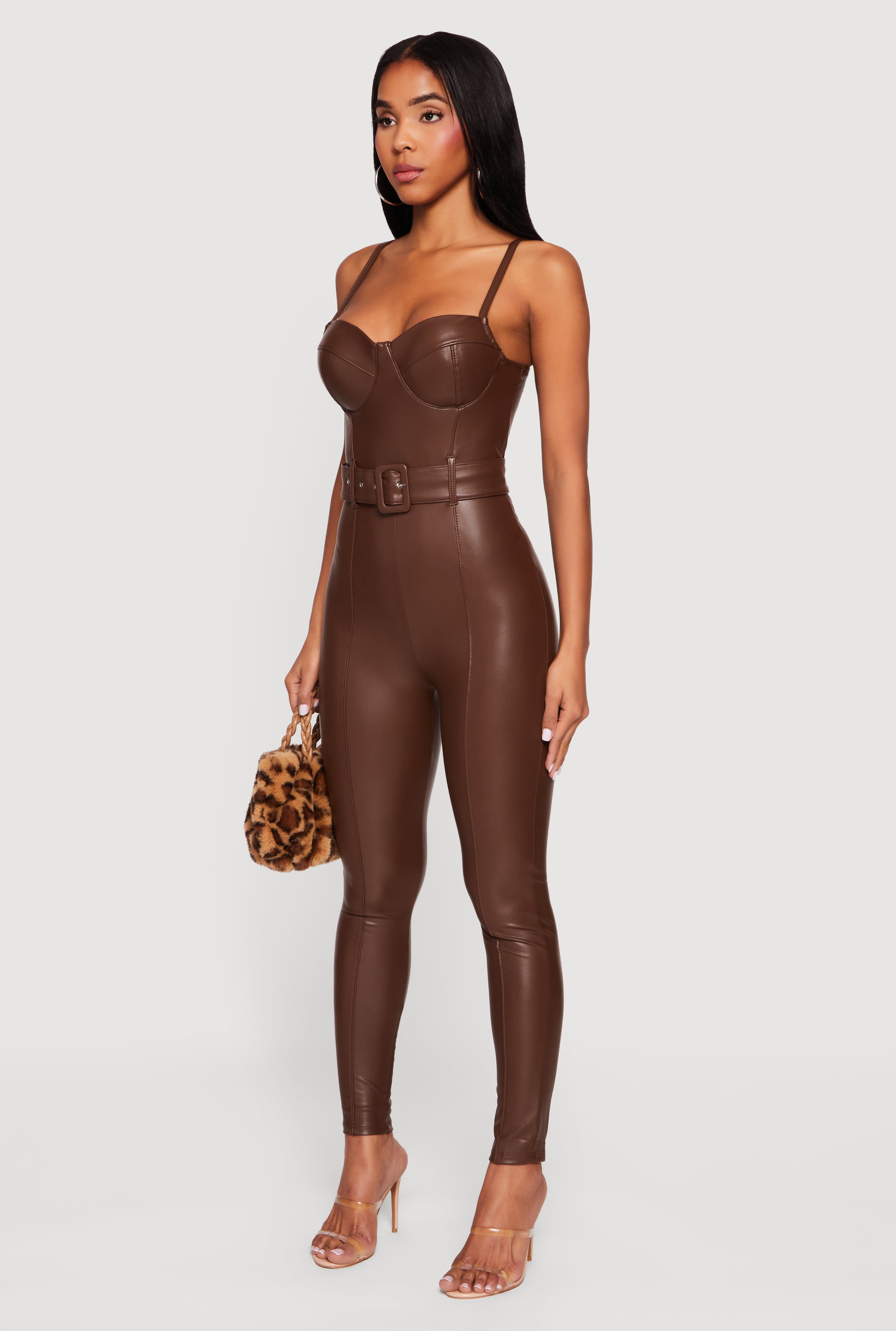 Step out in style with the Faux Leather Sweetheart Bustier Jumpsuit, a bold and edgy piece designed to turn heads. This sleeveless jumpsuit features a flattering sweetheart neckline and padded bustier cups that provide shape and support. Crafted from luxe faux leather with a cozy fleece lining, it combines comfort with a sleek, skinny-leg silhouette that hits right at the ankle. Perfect for festival vibes or a night out, the adjustable spaghetti straps and tie waist belt let you customize your fit while the zipper back closure makes getting ready a breeze. Elevate your wardrobe with this statement-making jumpsuit that blends fierce fashion and effortless cool.