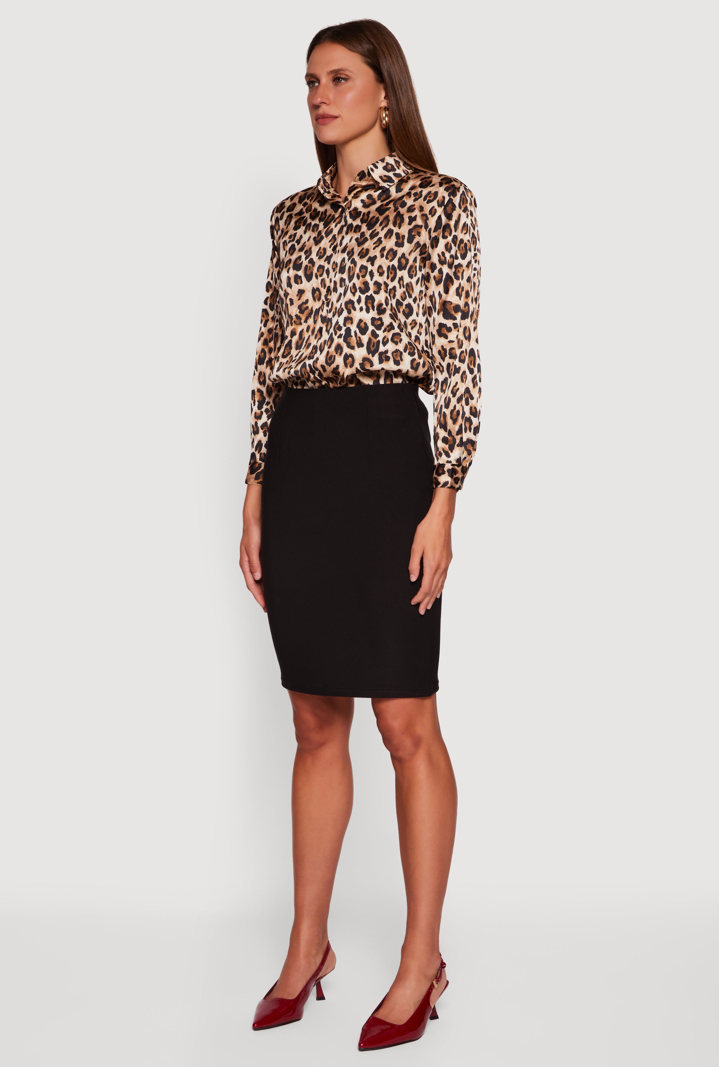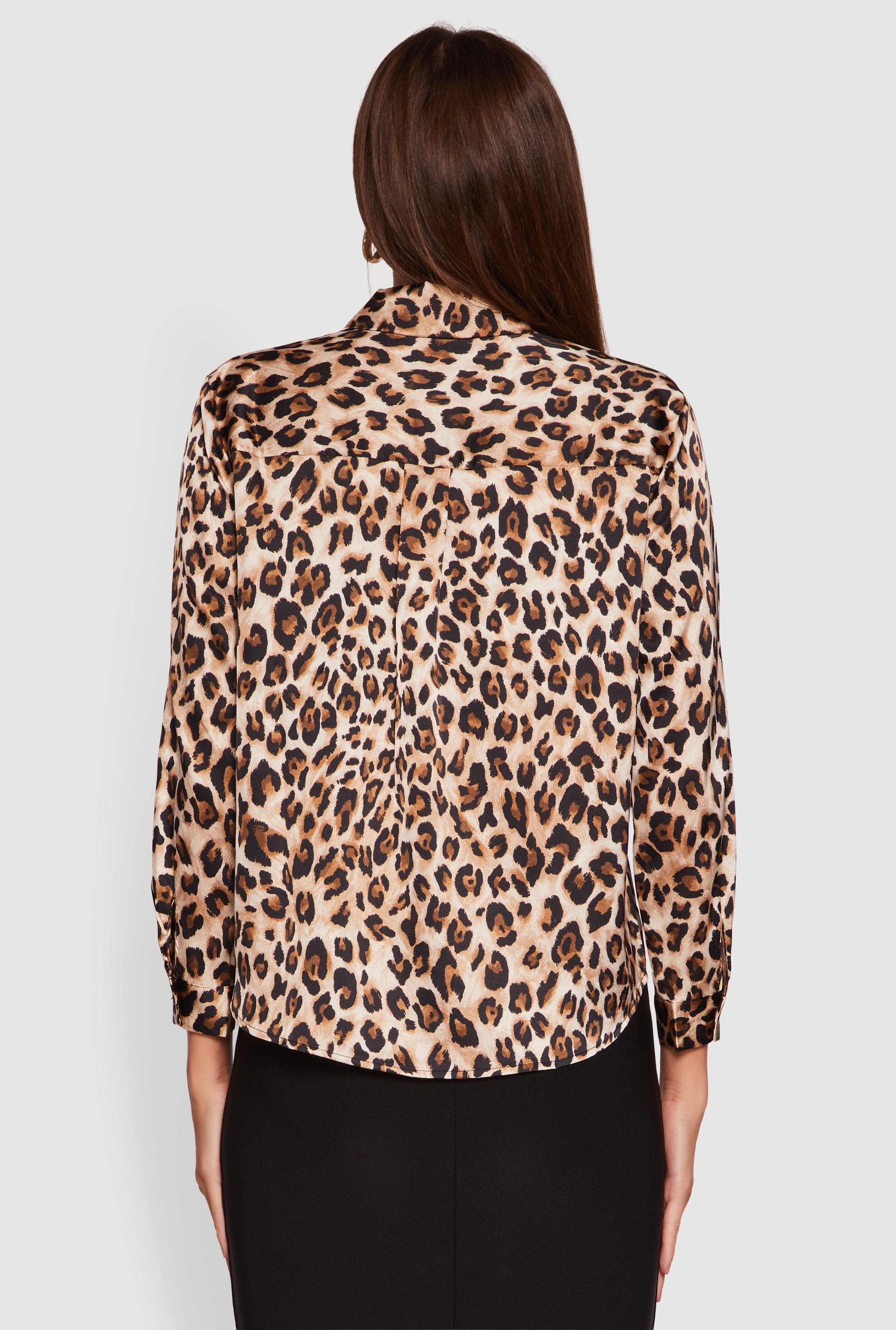 Turn heads effortlessly with this Leopard Print Satin Button Front Shirt. Its silky satin fabric and bold leopard print make it the perfect mix of fierce and classy. Whether you're heading to a night out or keeping it sharp at the office, this classic fit shirt with a timeless silhouette has your style covered. The rounded hem adds a subtle twist that makes every outfit pop. Ready to upgrade your wardrobe with a piece that’s as versatile as you are?