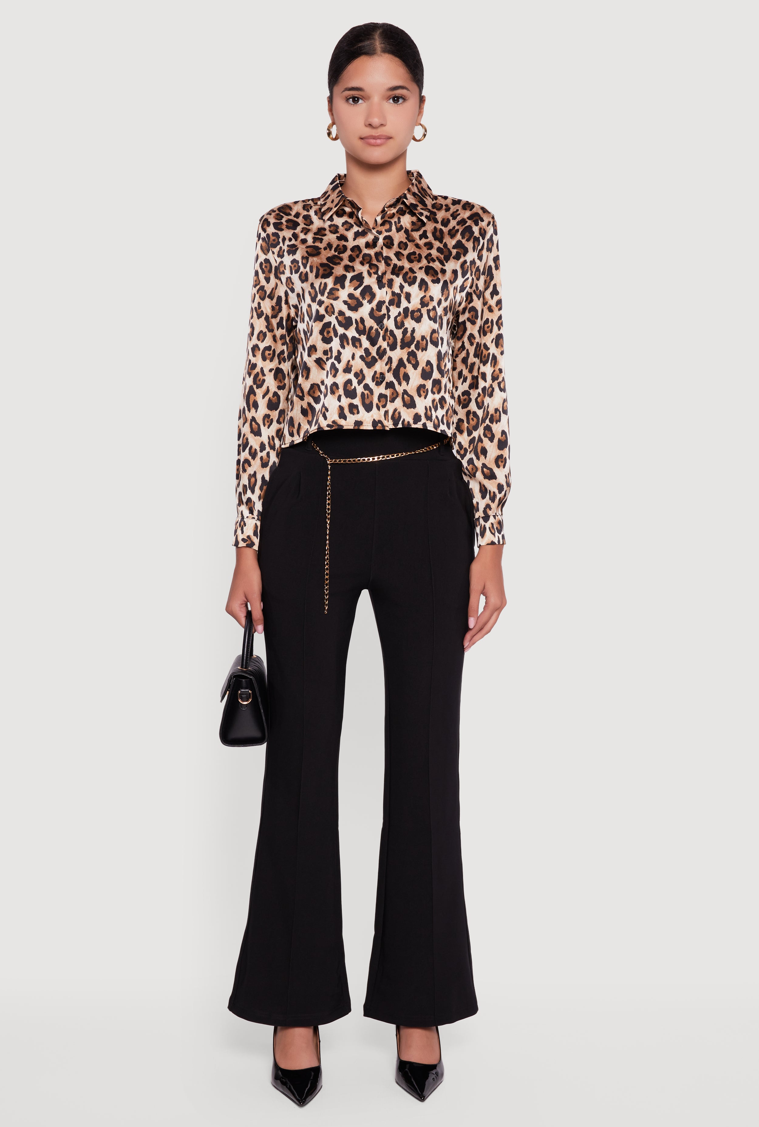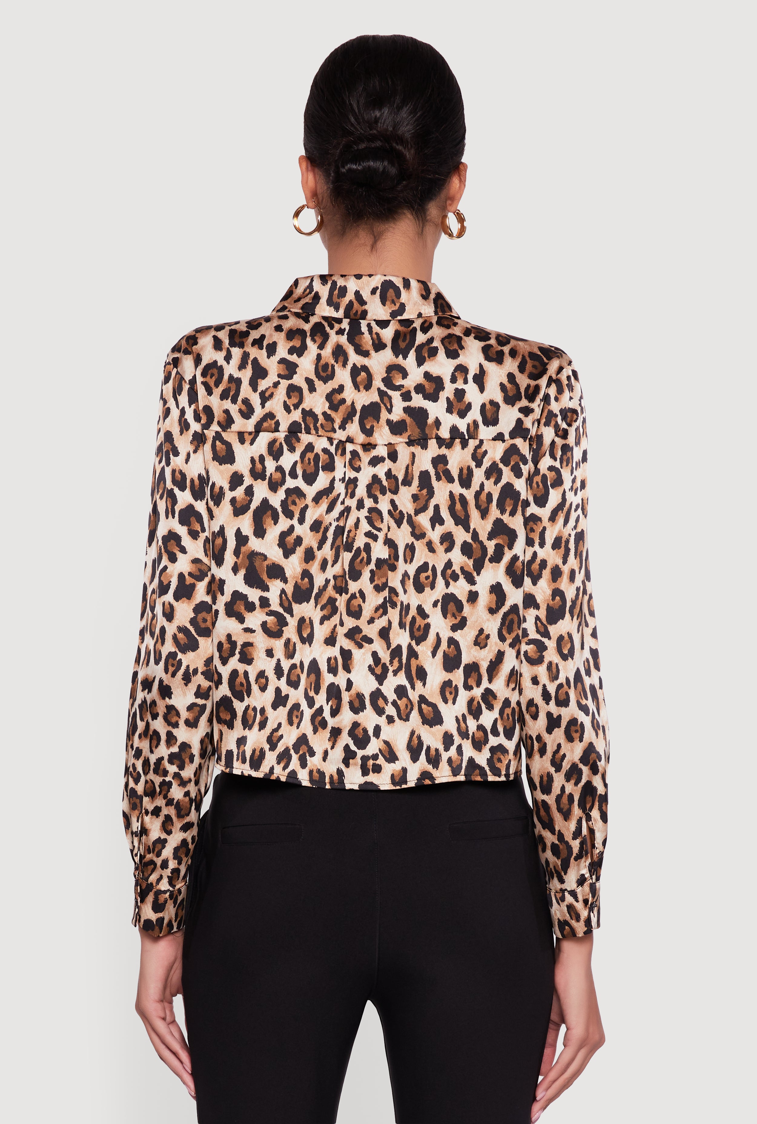 Step into the spotlight with this Leopard Print Satin Cropped Button Front Shirt. Its sleek satin fabric and bold animal print bring the perfect mix of edgy and chic, making it your go-to for nights out and parties. The classic fit and shirt collar keep it timeless, while the cropped length adds a flirty twist. Button it up or leave a few undone to match your vibe and own your look with confidence.