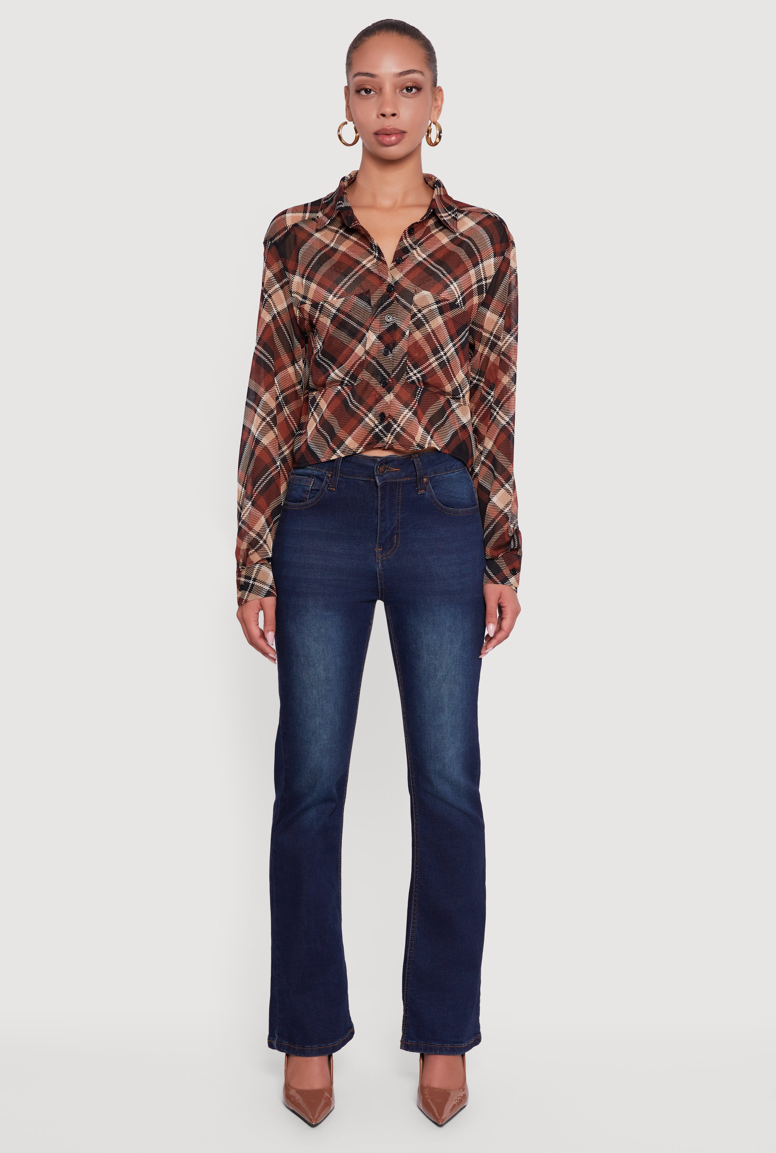 Step up your casual wardrobe with this Long Sleeve Plaid Button Front Shirt from Haute Monde. Crafted from lightweight chiffon, it offers a breezy feel while the classic plaid pattern adds timeless charm. The shirt collar and button front give it a polished look, while the drop shoulder and classic fit keep it effortlessly cool. Perfect for layering or wearing solo, this blouse blends comfort and style for everyday vibes.