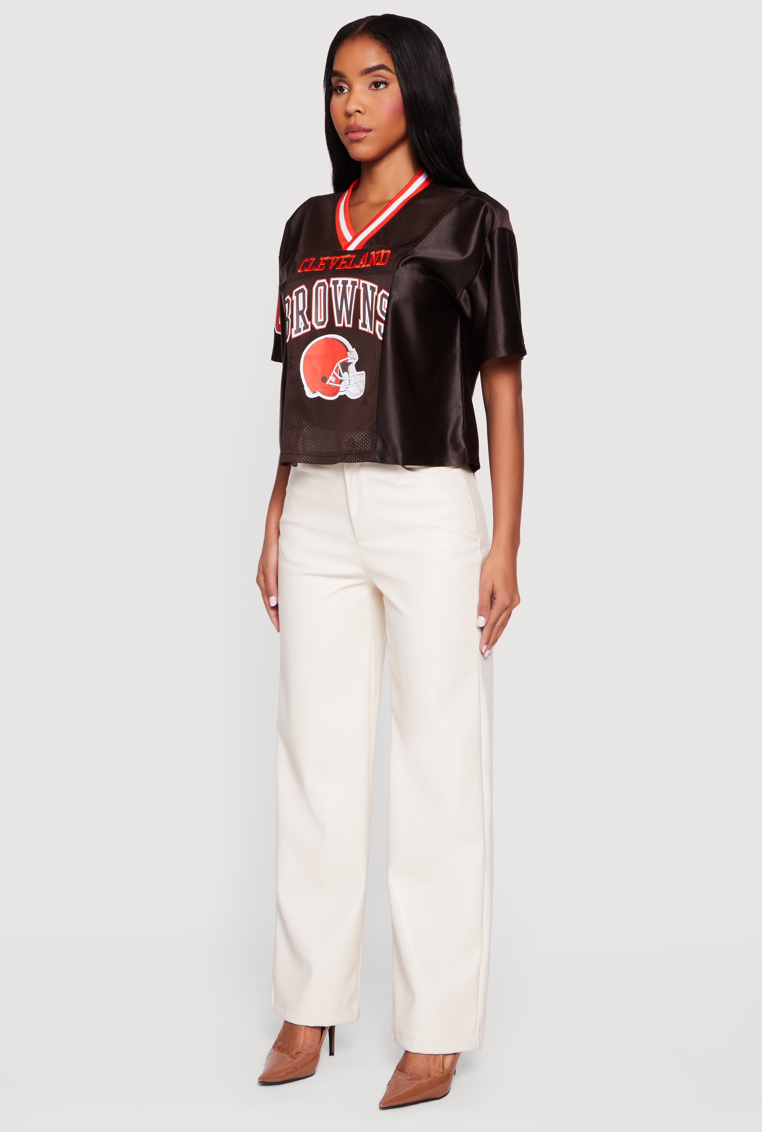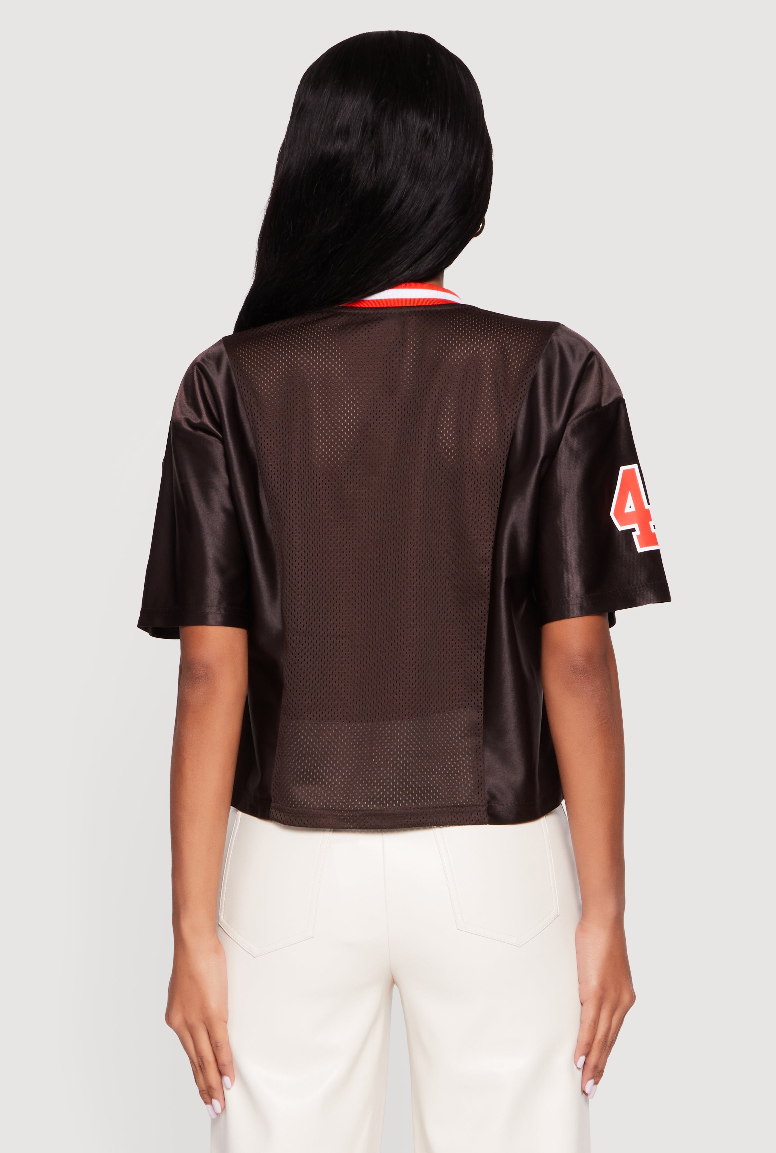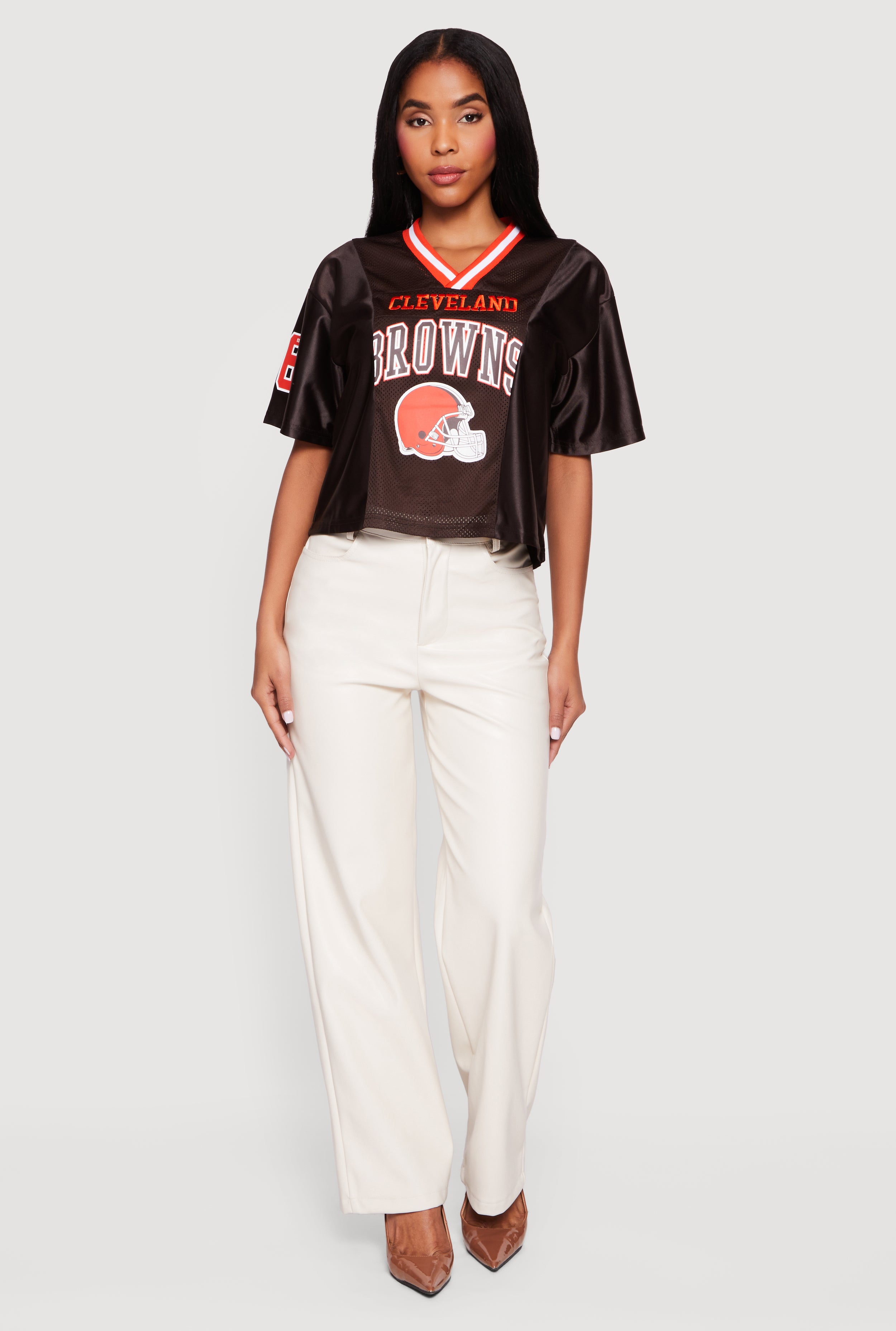 Show off your team spirit with this NFL Cleveland Browns Football Jersey designed just for women. Crafted from breathable jersey mesh, it offers a relaxed fit and a flattering V-neck for all-day comfort and style. Whether you're cheering from the stands or rocking a casual athleisure look, this short-sleeve crop tee combines sporty vibes with laid-back ease. Get ready to make game day your new favorite day.