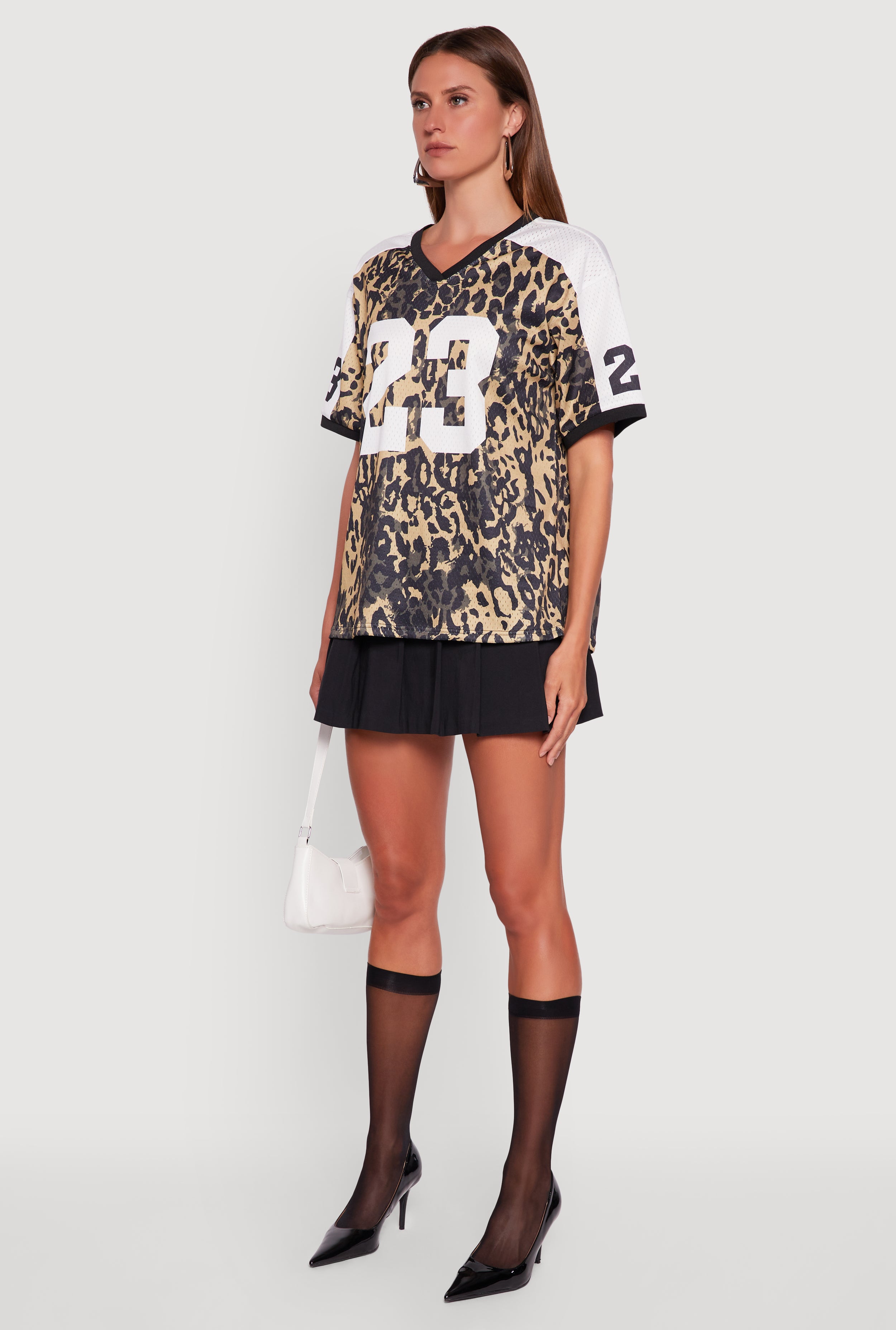 Step up your casual game with the V-Neck Boston 23 Graphic Leopard Print Jersey. This classic fit tee blends sporty vibes with fierce leopard print and bold Boston 23 graphics for a look that’s effortlessly cool. Made from breathable jersey mesh, it’s perfect for everything from lounging to hitting the streets with confidence. The flattering V-neck and short sleeves keep it light and easy, making it your new go-to for athleisure or everyday style.