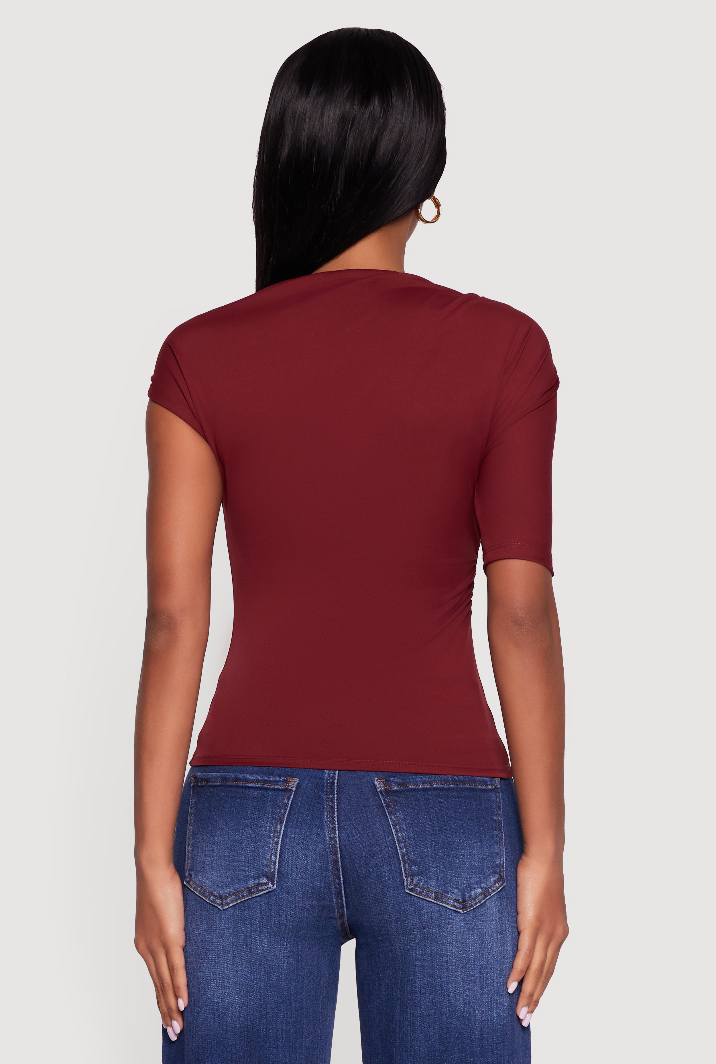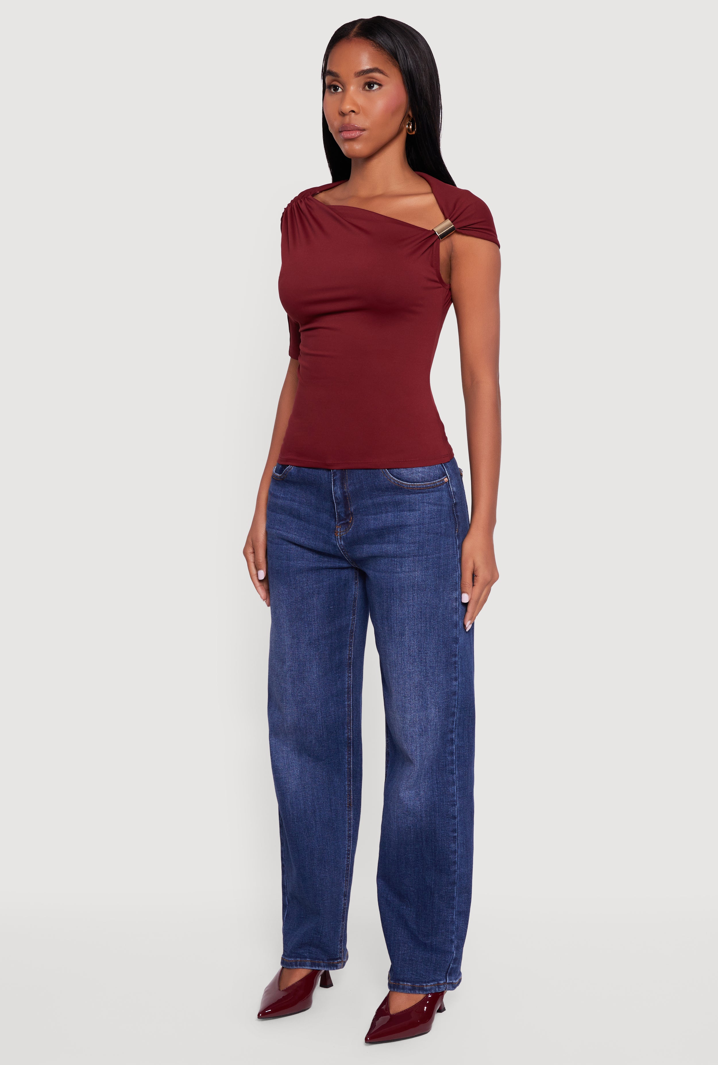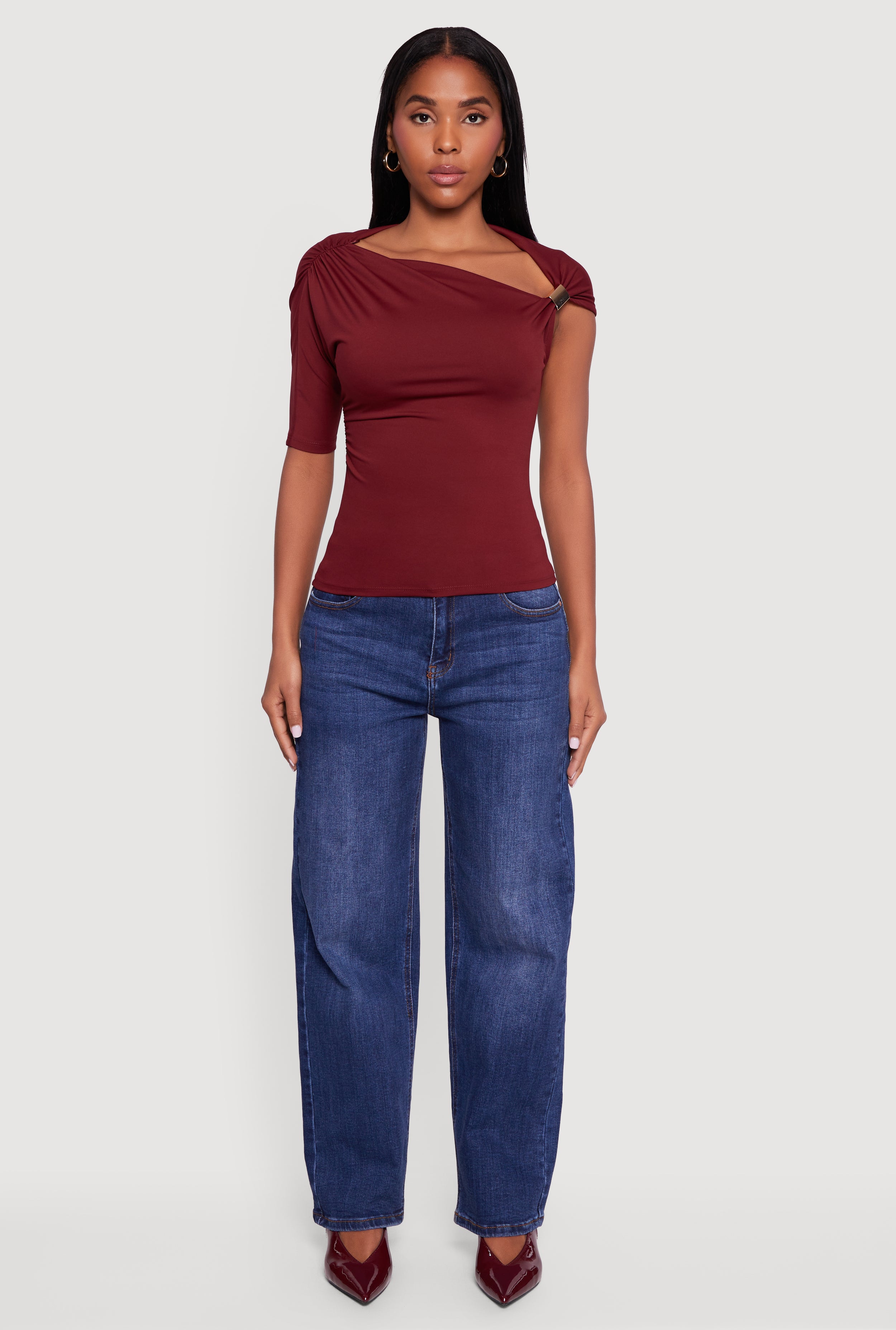 - Asymmetrical one-shoulder neckline adds a trendy twist