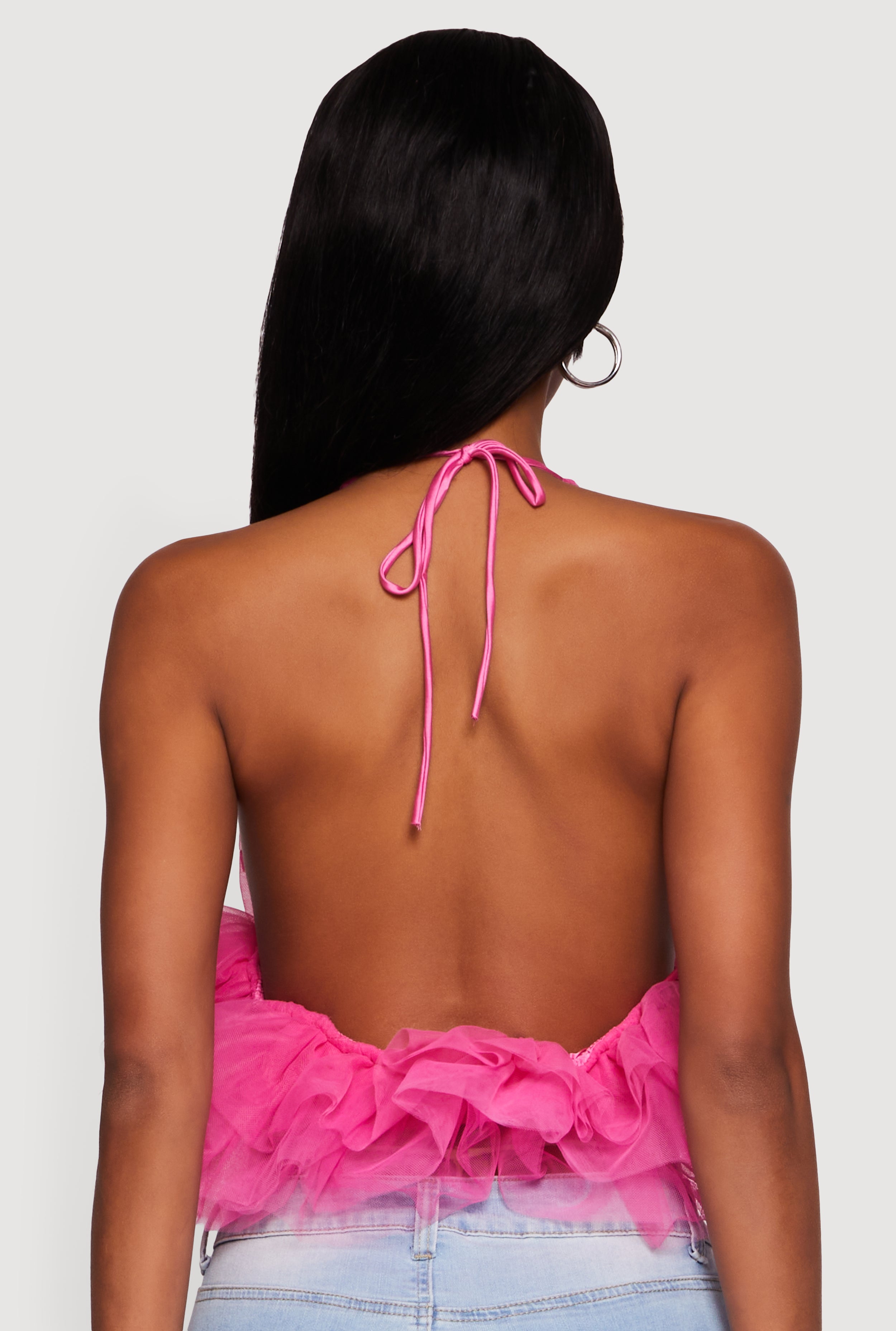 Step into the spotlight with this Tulle Ruffle Hem Backless Cropped Halter Top. Designed to turn heads, its playful ruffles and daring backless cut make it the perfect pick for festivals, nights out, or any party where you want to stand out. The classic fit and plunge neckline keep it effortlessly chic, while the lightweight tulle fabric adds a flirty touch that moves with you. Ready to own your vibe and make every moment Insta-worthy?