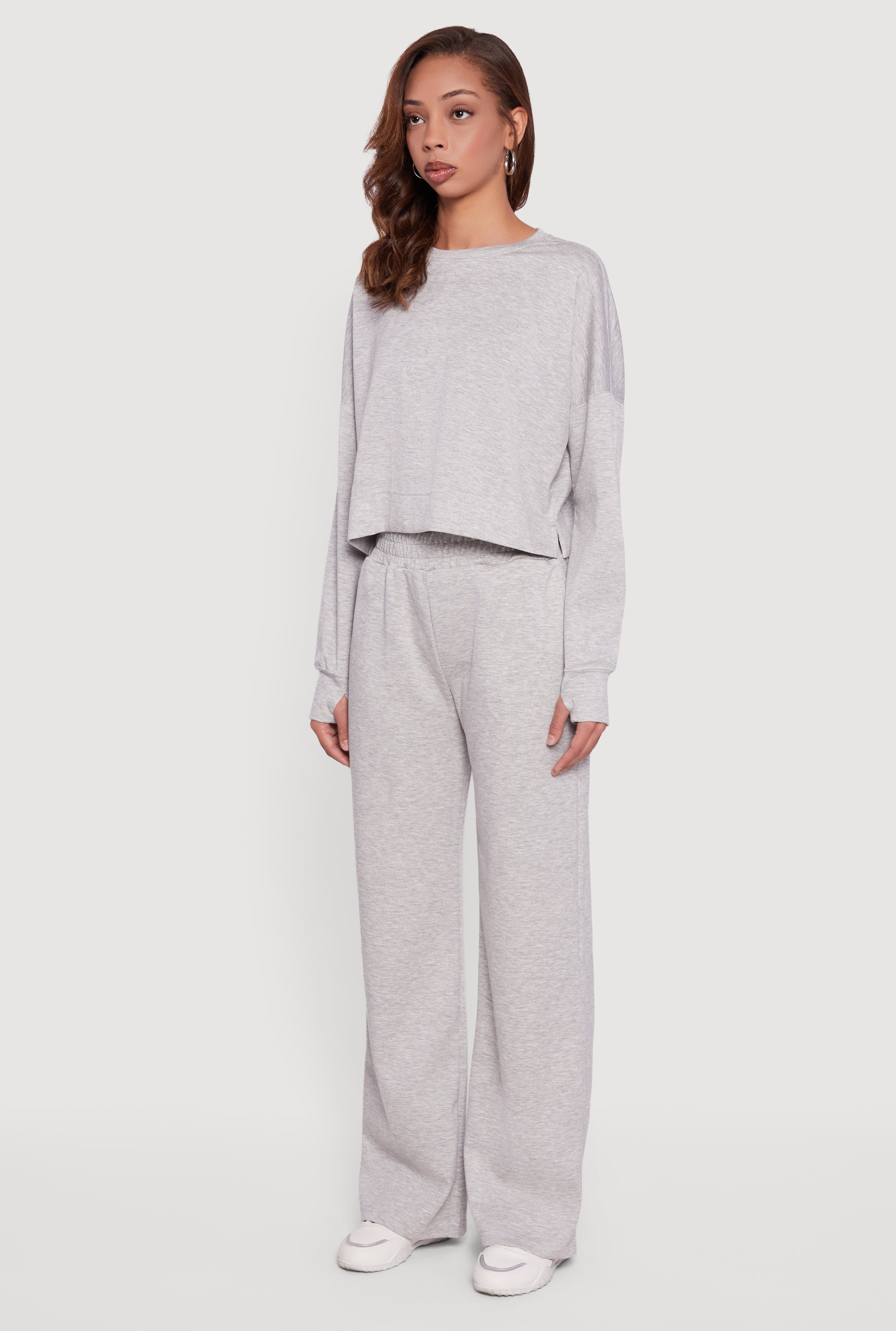 Stay cozy and cool in this Cropped Crew Neck Sweatshirt with Thumb Holes, designed to keep your look effortlessly stylish and comfy. Its classic fit and crew neckline create a timeless silhouette, while the cropped length adds a trendy edge perfect for layering or wearing solo. The drop shoulder design and side slits give it a relaxed vibe, and the thumb holes add a fun, functional twist that keeps your sleeves in place. Whether you're lounging or out and about, this casual athleisure essential will quickly become your go-to top.