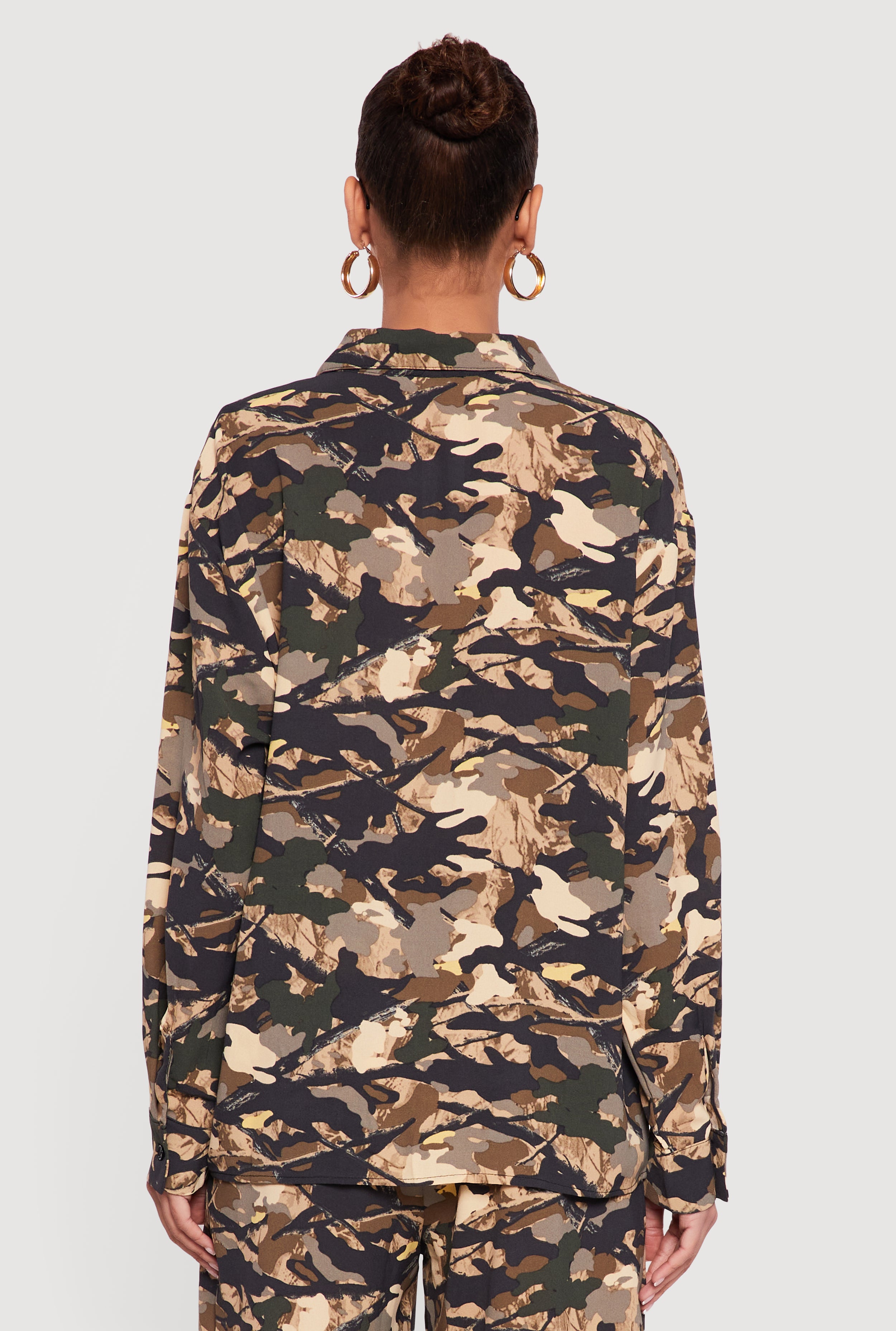 Step up your casual game with this Camouflage Crepe Knit Long Sleeve Button Front Shirt. Designed with a classic fit and a timeless shirt collar, it blends laid-back style with a cool edge. The soft crepe knit fabric feels great against your skin, while the button front adds a touch of effortless detail. Perfect for everyday wear, this shirt pairs easily with your favorite jeans or leggings for an easy, stylish look.