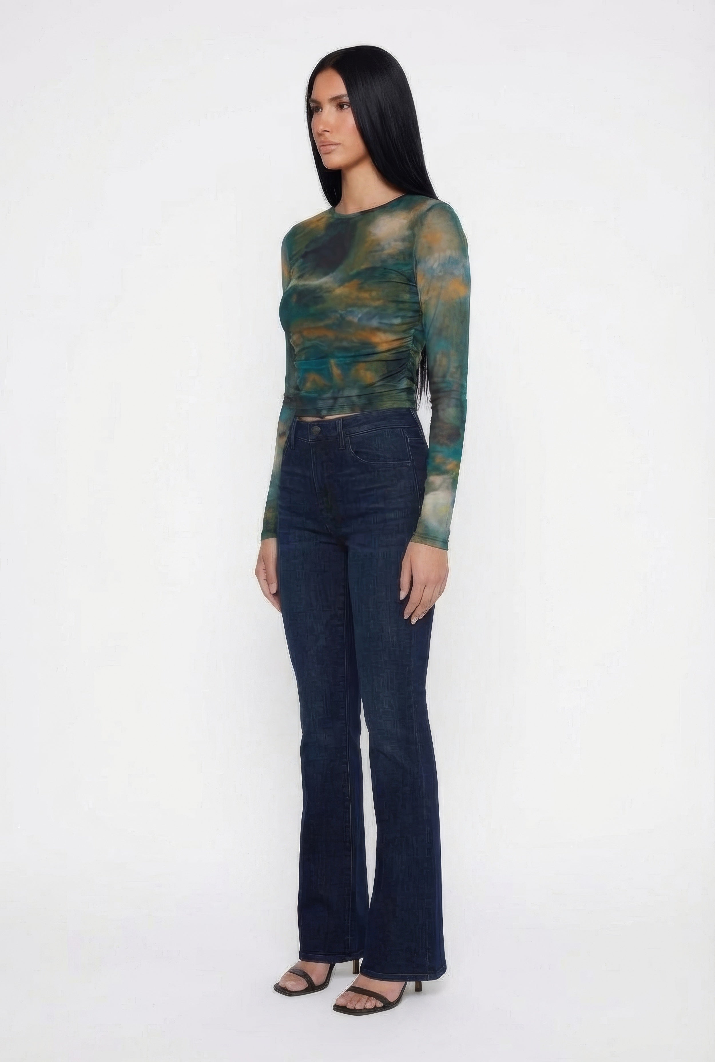 Step up your style game with the Printed Pattern Ruched Mesh Overlay Crop Top from Blâshe. This high-neck, long sleeve crop top features a classic fit that flatters every figure while adding a trendy twist with its sheer mesh overlay and playful ruching. Perfect for casual days or nights out, it pairs effortlessly with your favorite jeans or skirts for an effortlessly cool vibe.