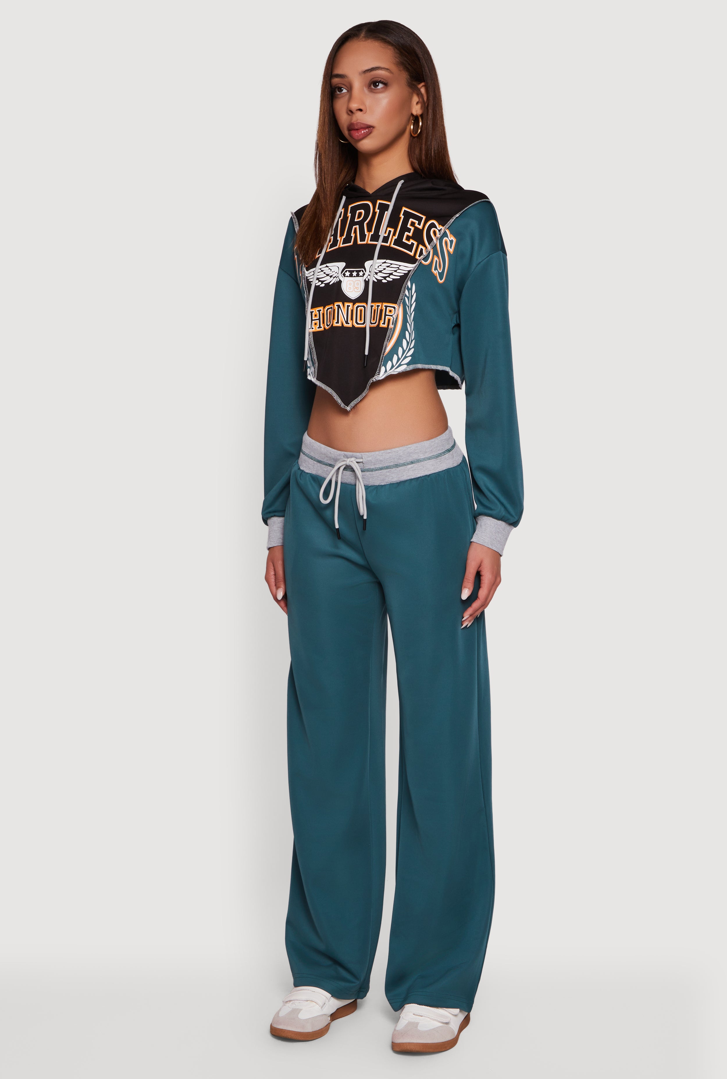 Step up your casual game with the Fearless Graphic Color Blocked Cropped Hoodie. This relaxed-fit hoodie blends bold color blocking with a cool "Fearless Honour, 89" graphic for a look that’s effortlessly edgy. The hooded neckline and long sleeves keep you cozy, while the trendy cropped length and hanky hem add a playful vibe perfect for athleisure, lounging, or weekend adventures.