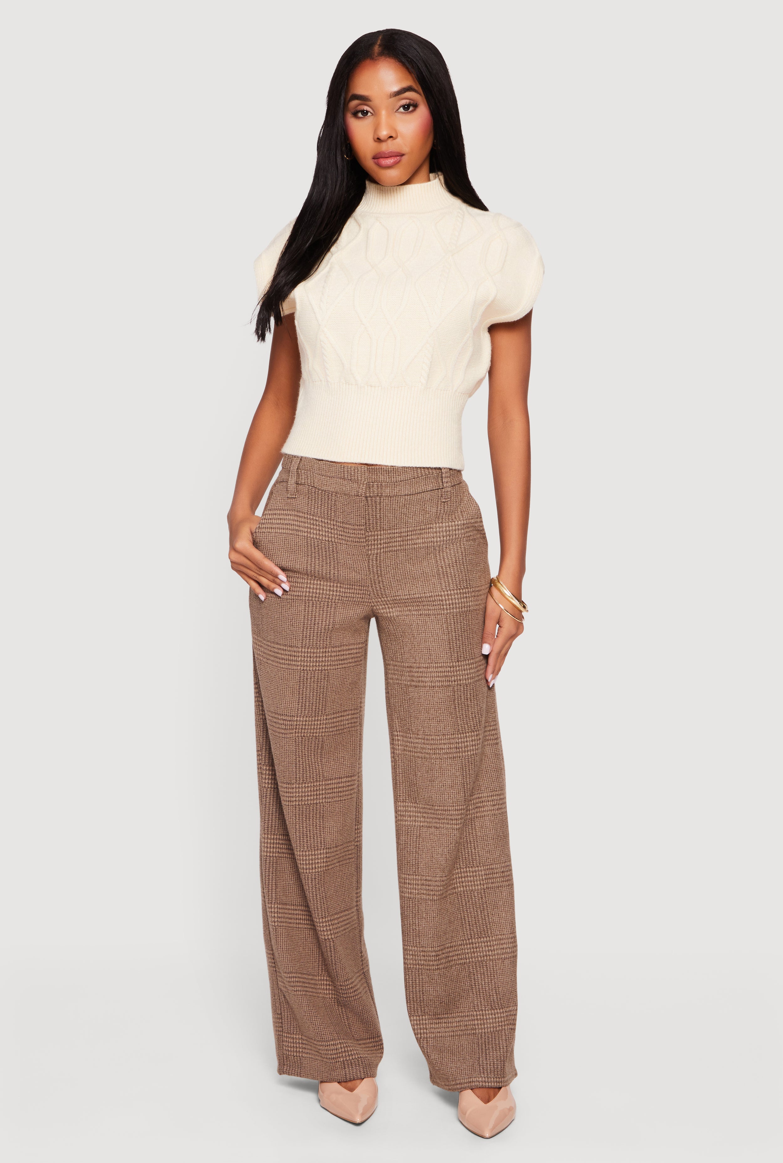 Stay effortlessly chic in this Cable Knit Cap Sleeve Mock Neck Sweater, designed to blend cozy comfort with a modern twist. Its classic fit and timeless silhouette make it a must-have for casual days and office hours alike. The soft cable knit fabric paired with a flattering mock neck and cap sleeves creates a look that's both stylish and breathable, perfect for layering or wearing solo.