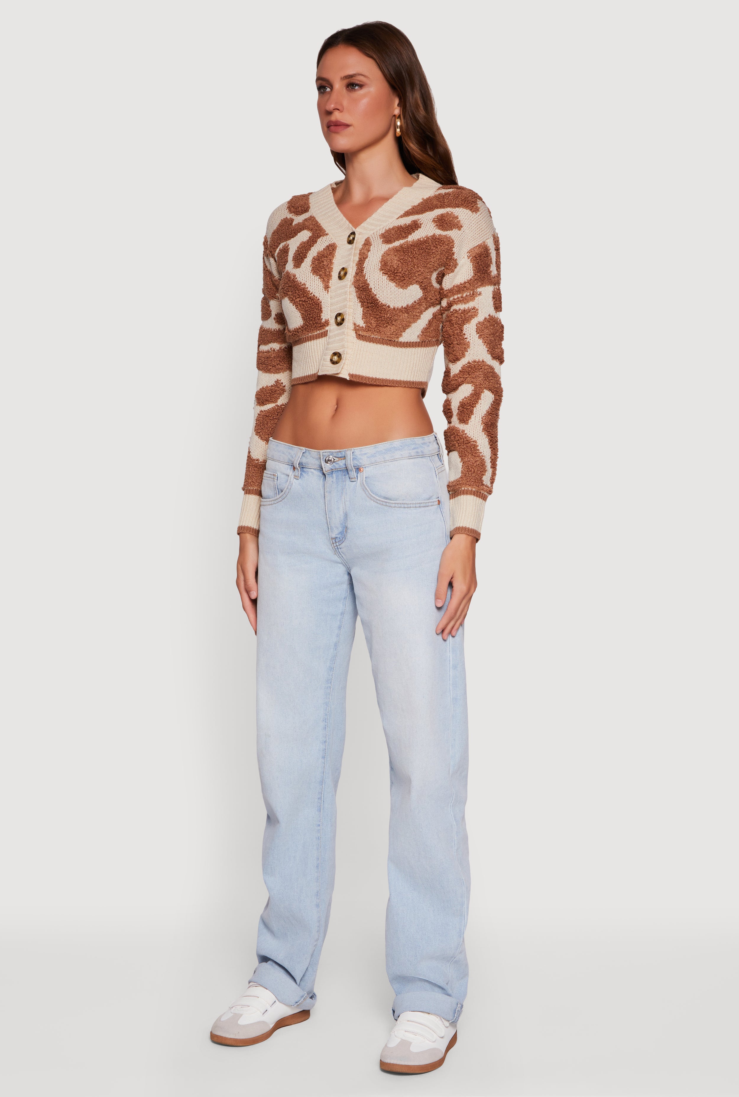 • Swirl Print Boucle Cropped Button Front Cardigan
