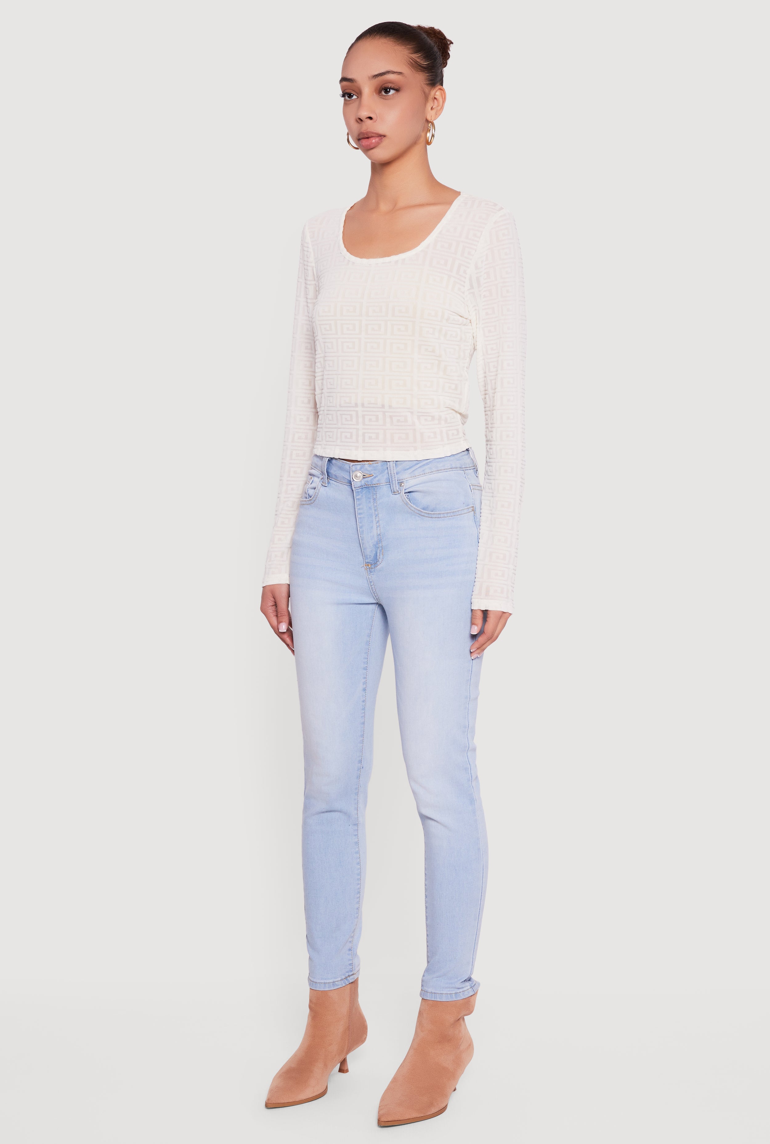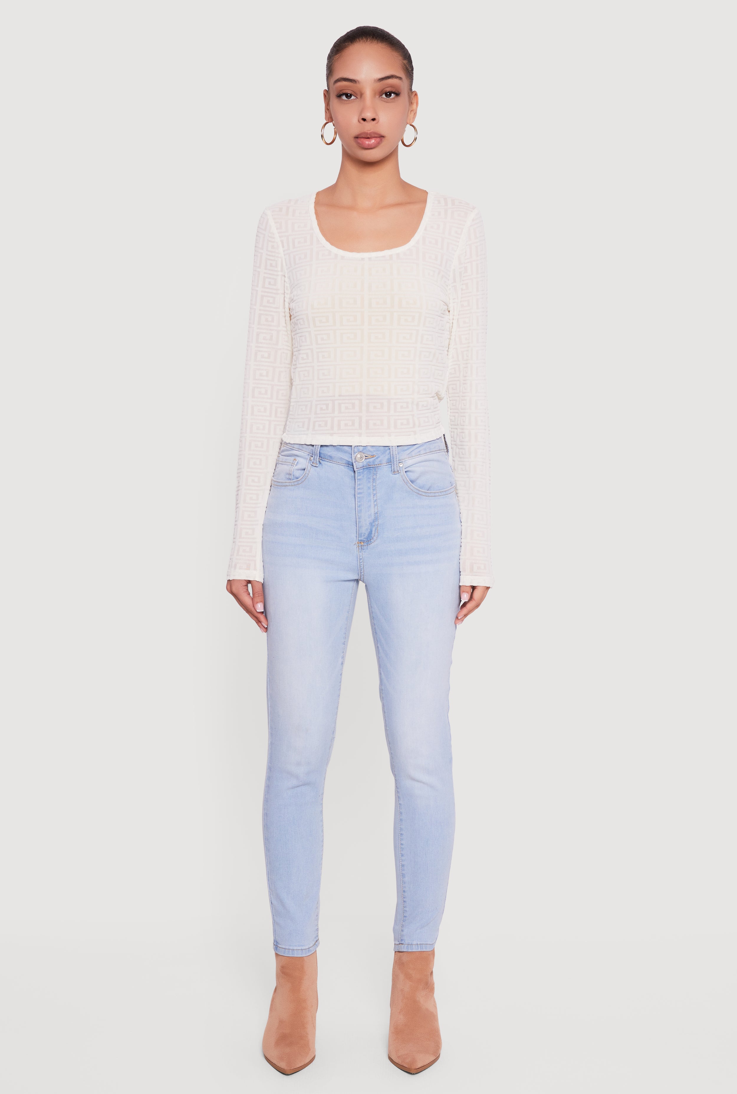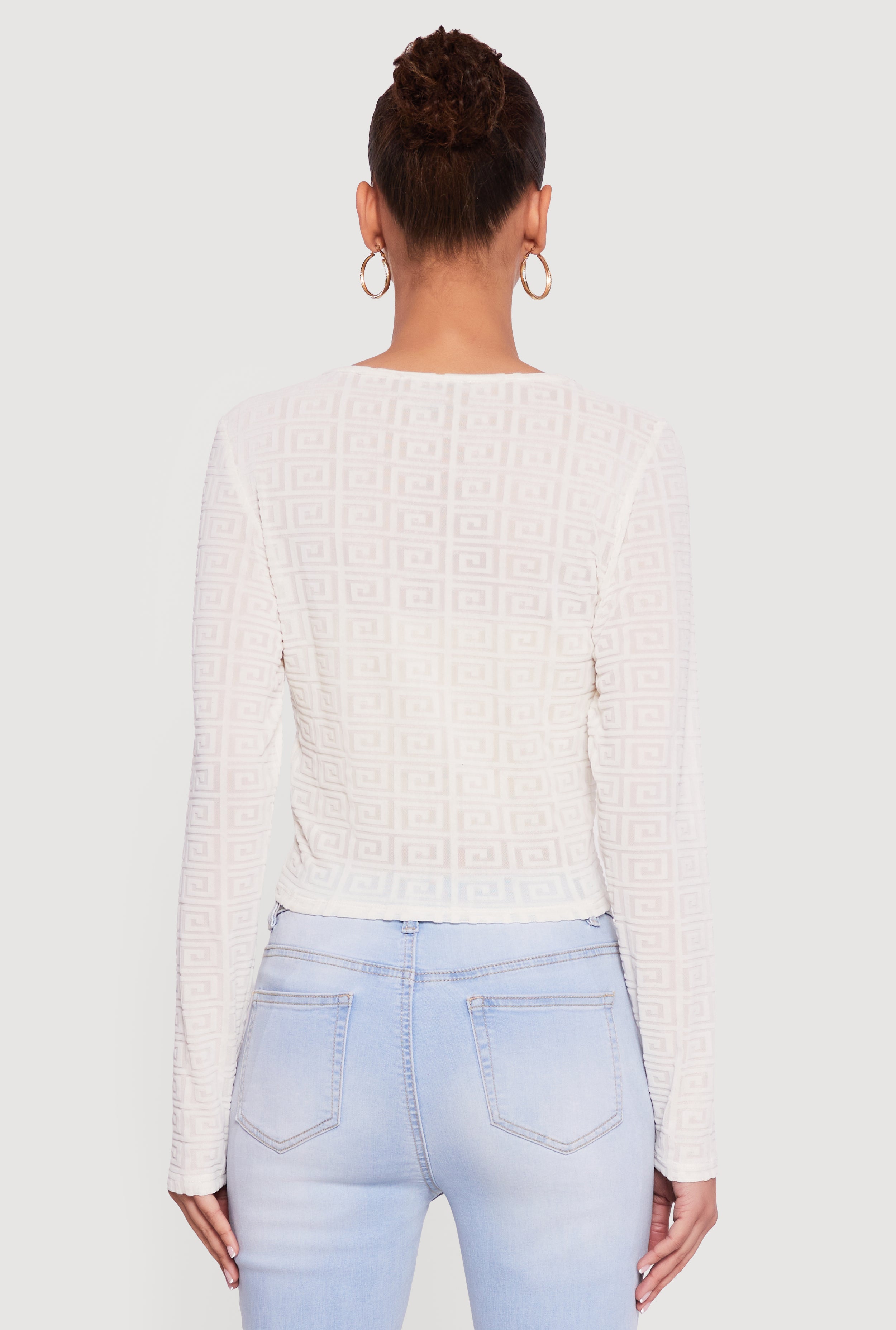 Step up your casual wardrobe with the Greek Key Velvet Burnout Long Sleeve Top. This classic fit tee features a trendy scoop neck and a chic Greek Key velvet burnout pattern that adds just the right amount of edge to your everyday look. Made from a soft mesh blend, it’s lightweight and sheer, perfect for layering or wearing solo with your favorite bralette. Whether you’re out with friends or running errands, this top brings effortless style and comfort together.