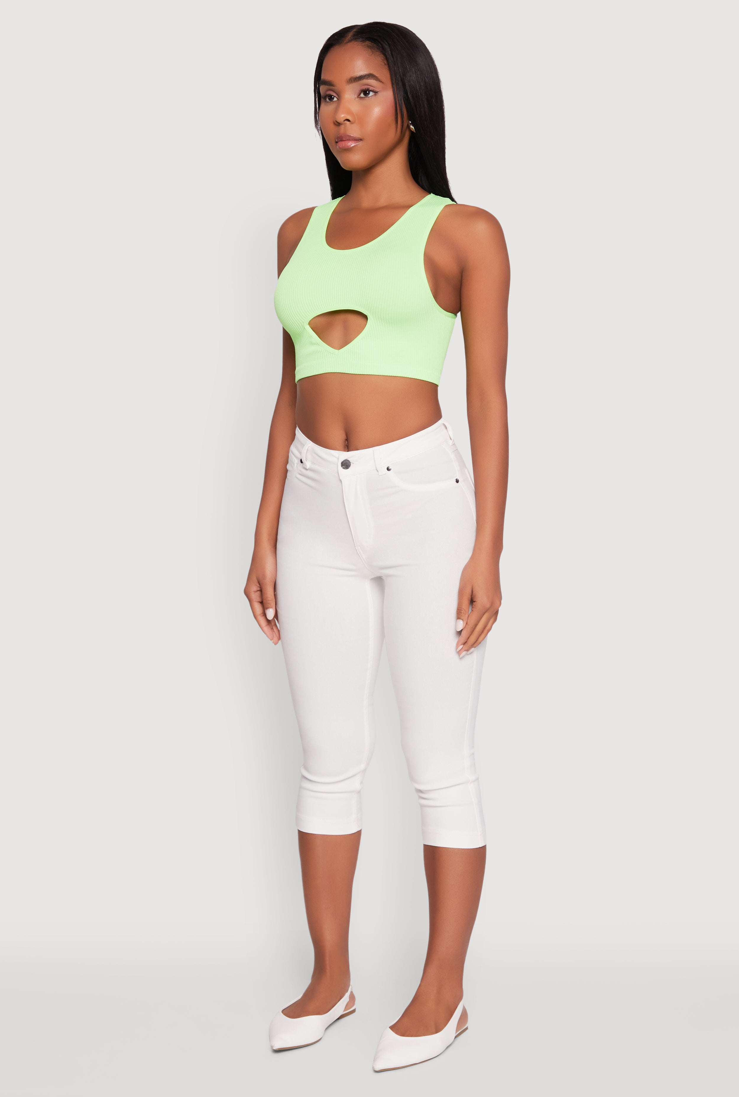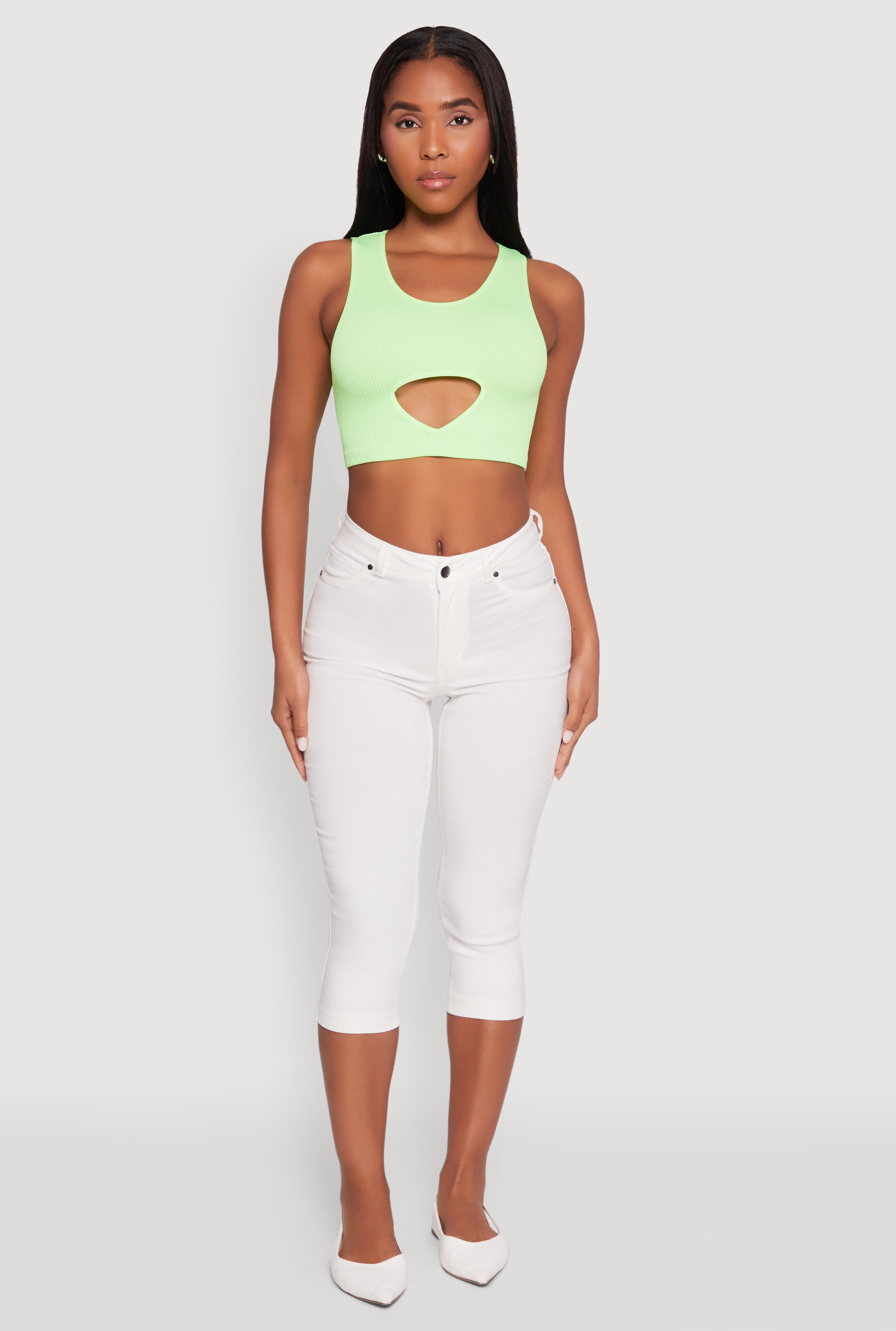 Upgrade your wardrobe with this effortlessly chic Cut Out Front Seamless Cropped Tank Top. Designed for those who love to stay cool and stylish, this sleeveless top features a scoop neck and a trendy cutout detail that adds just the right amount of edge. Made from ribbed knit fabric, it offers a comfortable, seamless fit that hugs your body in all the right places. Perfect for casual outings or layering your favorite looks, this tank top is a must-have for anyone who wants to stay on top of the latest fashion trends without breaking the bank.