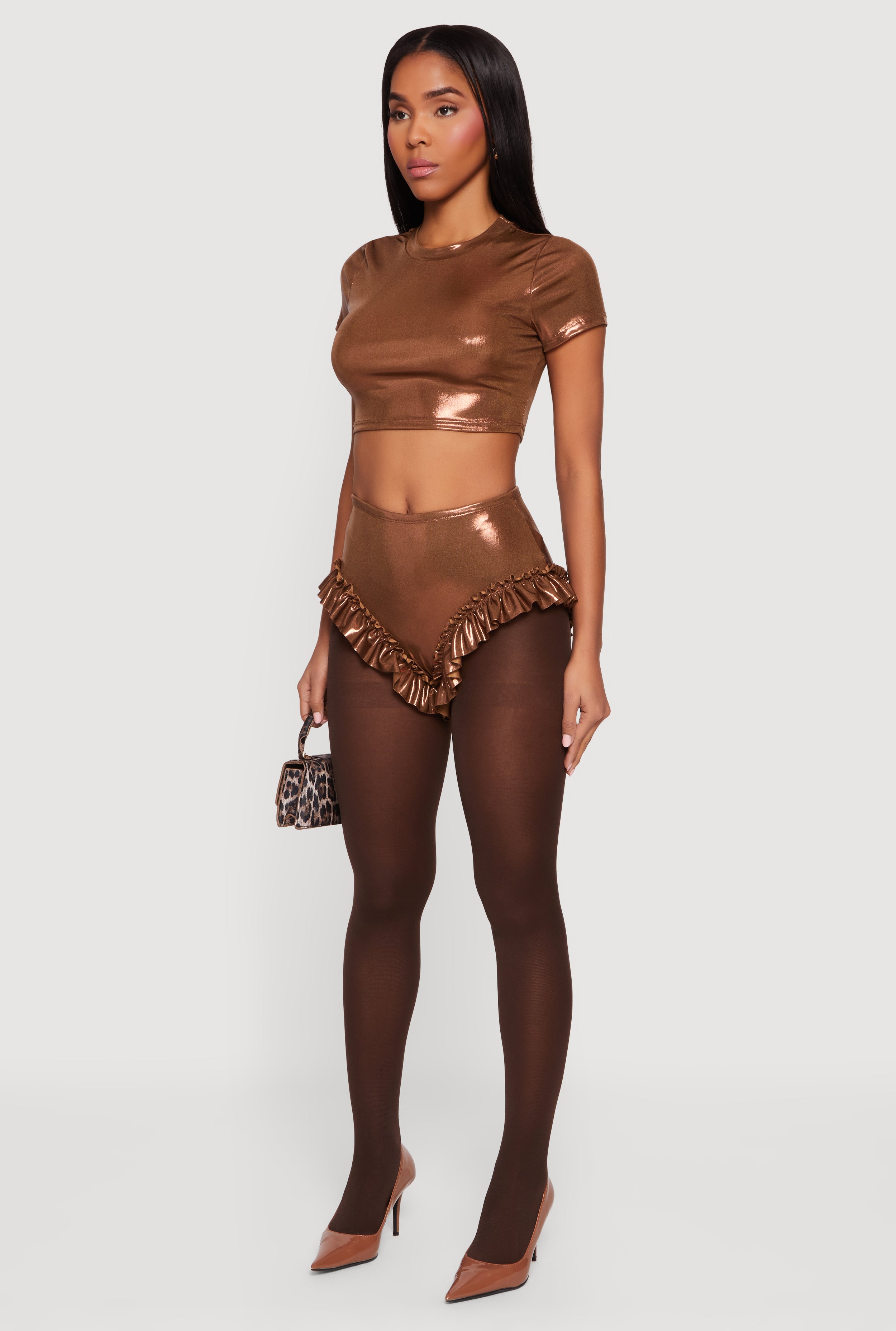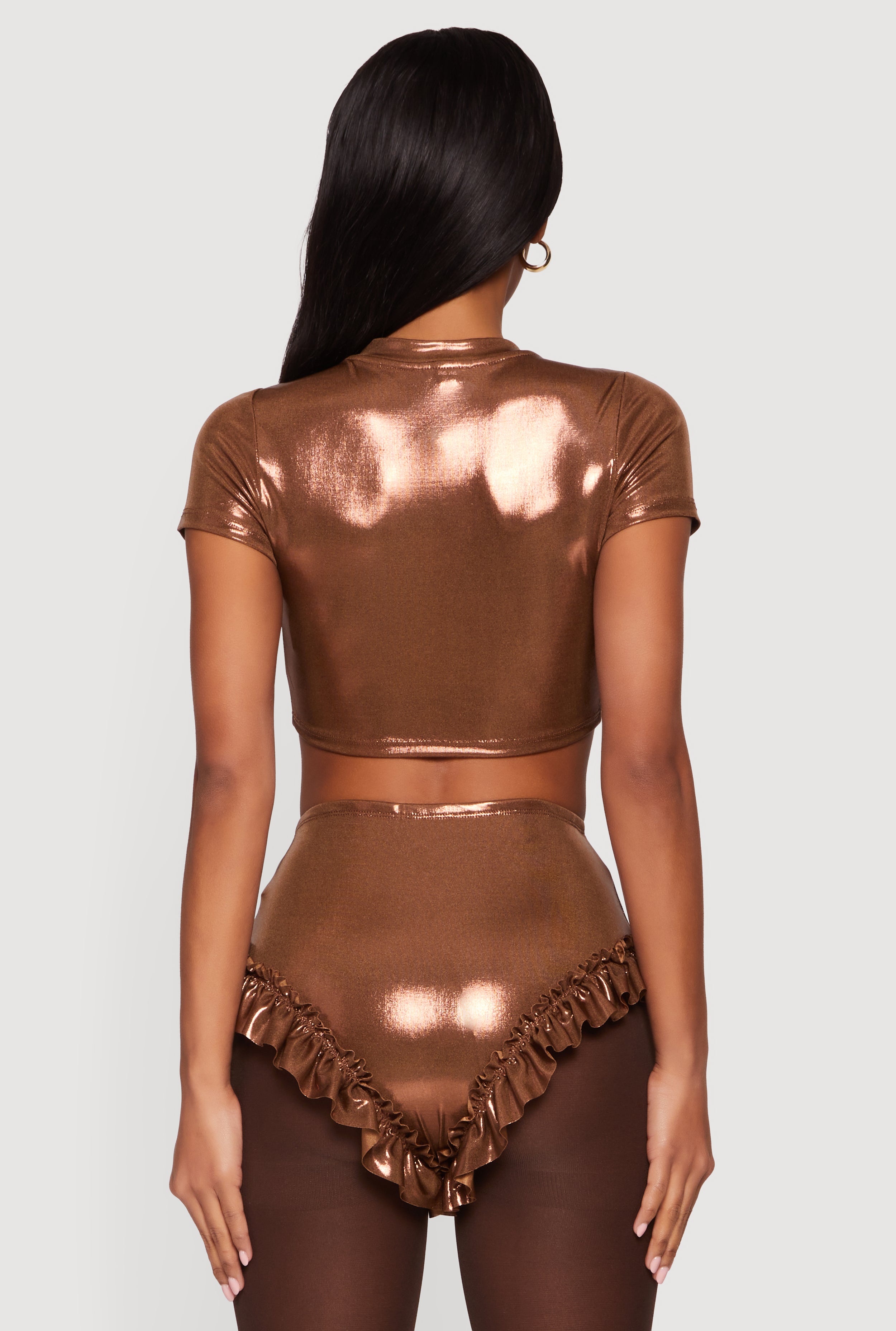 Shine bright and turn heads in this Metallic Foil Screen Short Sleeve Crop Top. With its classic fit and eye-catching foil screen design, this crop top is your go-to for festivals, parties, or casual days when you want to add a little sparkle to your style. The crew neck and short sleeves keep it comfy and cool, making it easy to pair with high-waisted jeans or skirts for an effortlessly trendy look.
