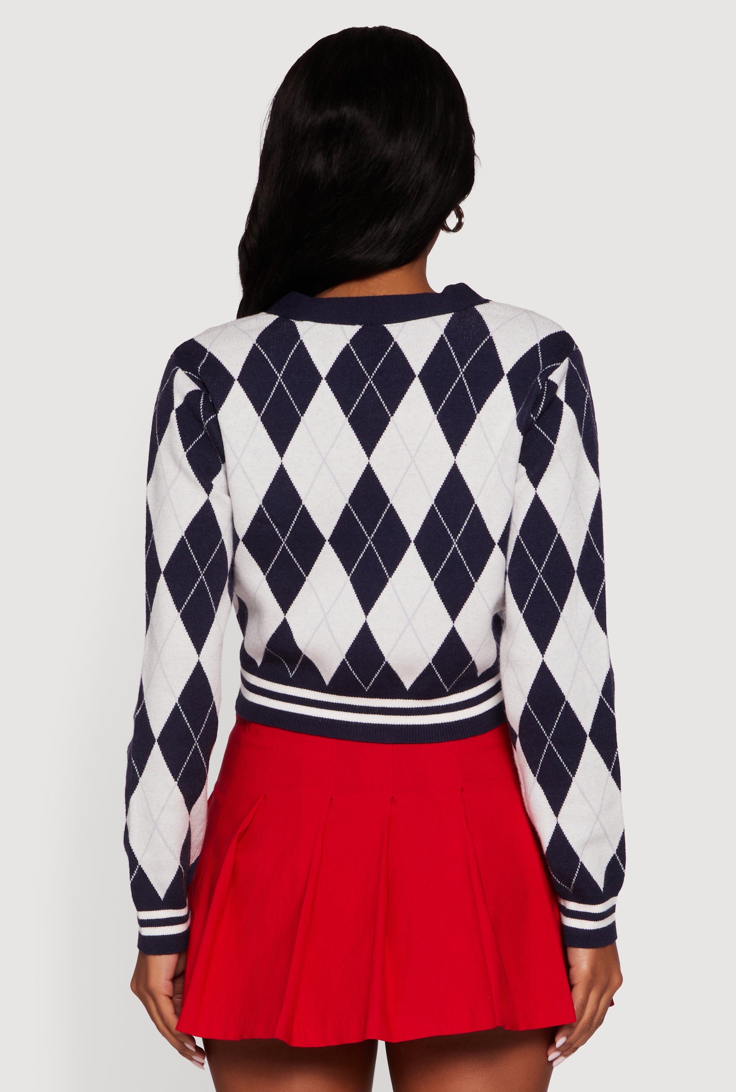 - Eye-catching argyle plaid pattern with varsity stripe accents