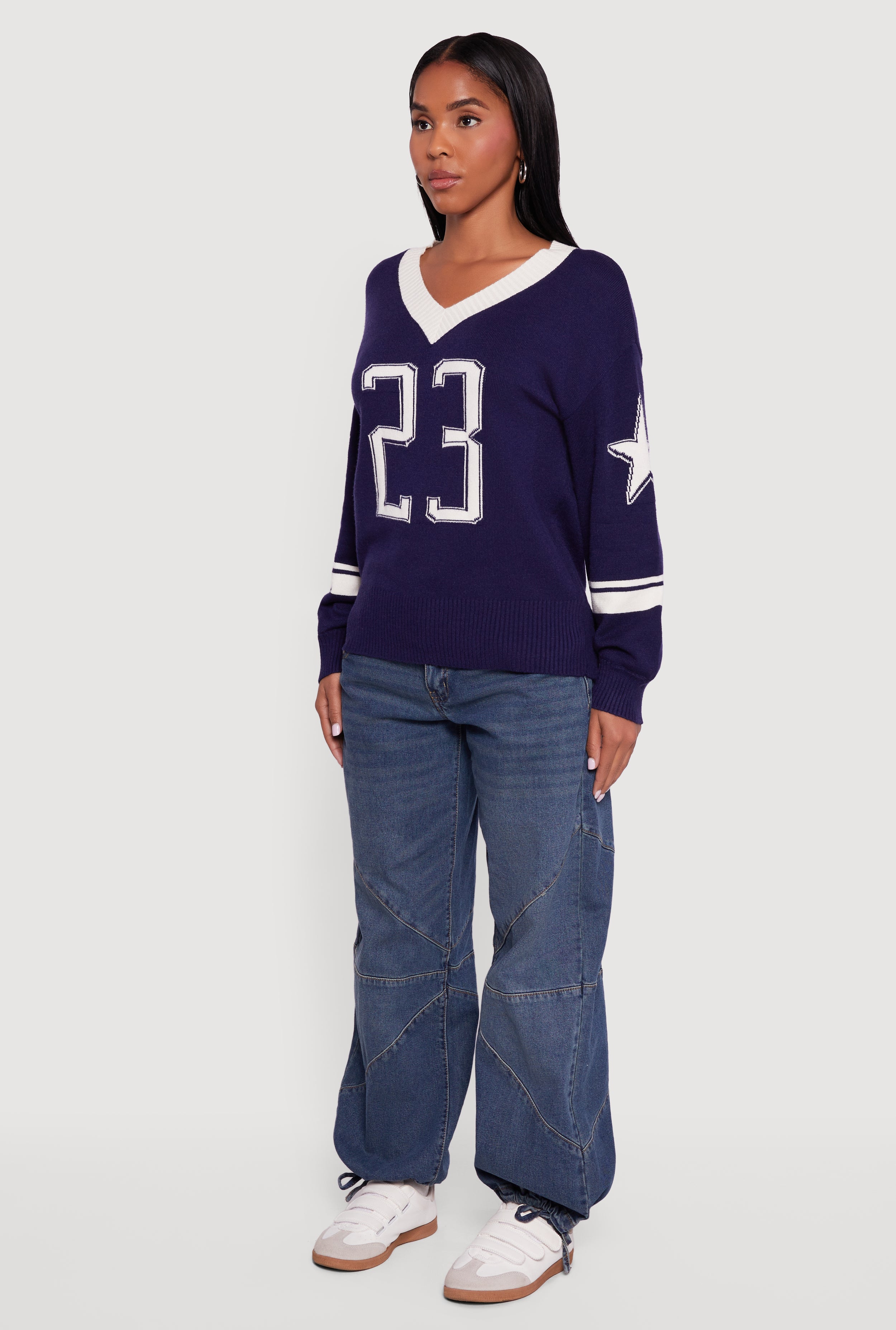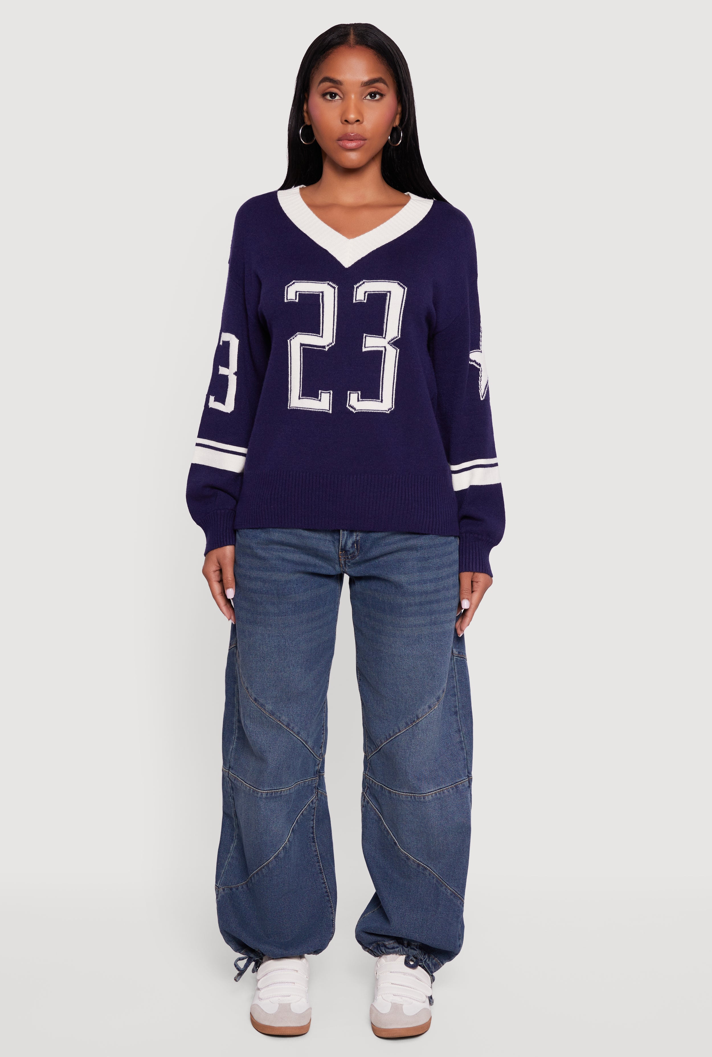 Step into cozy style with this Ribbed Knit 23 Graphic V Neck Sweater featuring a trendy graphic print. Designed with a timeless silhouette and a flattering V-neck, it’s perfect for casual days when you want to look effortlessly cool. The ribbed knit texture adds subtle detail, while the blouson long sleeves and drop shoulder design bring a modern twist to your everyday look. Whether paired with jeans or layered over your favorite skirt, this sweater keeps comfort and style front and center.
