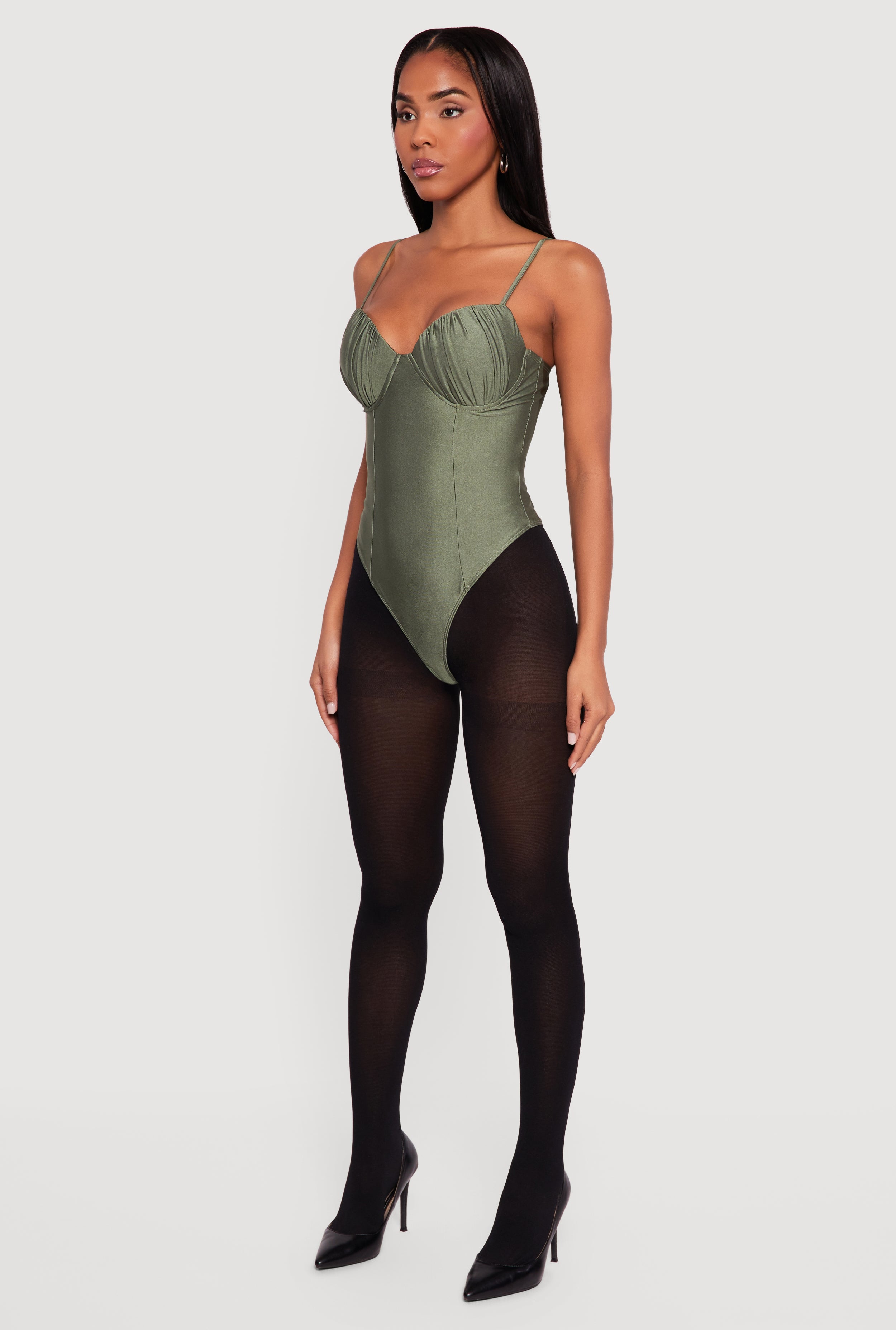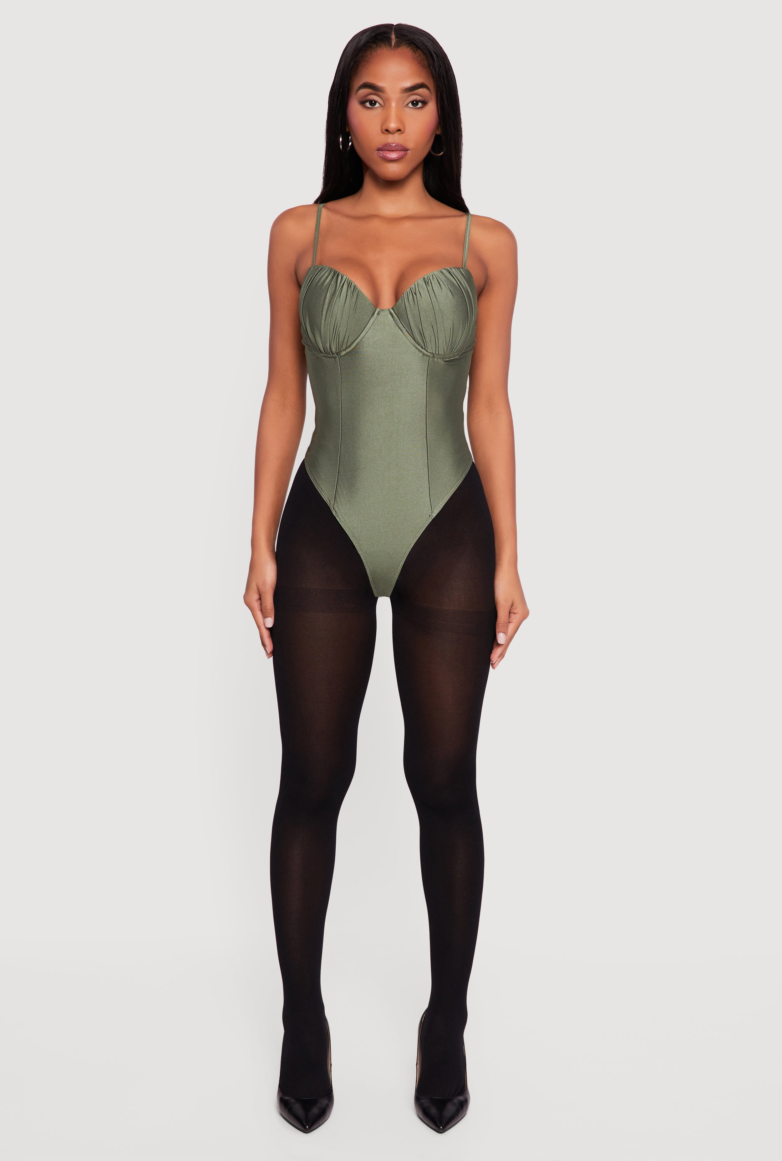 Step into the spotlight with this Solid Ruched Corset Bodysuit designed to hug your curves and elevate your night out look. Featuring a flattering sweetheart neckline and delicate spaghetti straps, this sleeveless bodysuit offers a chic open back for a touch of daring style. Padded cups provide support and shape, while the snap closure ensures easy wear. Perfect for parties or a fun night on the town, this bodysuit combines comfort and confidence in one sleek package.